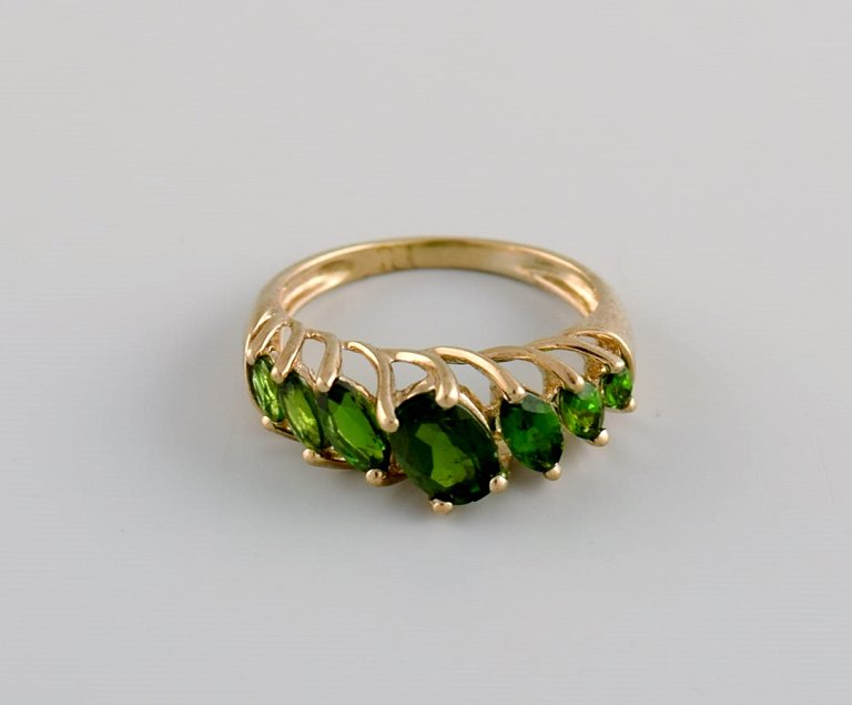 Skandinavisk guldsmed. Vintage alliancering i 8 karat guld prydet med grønne halvædelsten. Midt 1900-tallet.