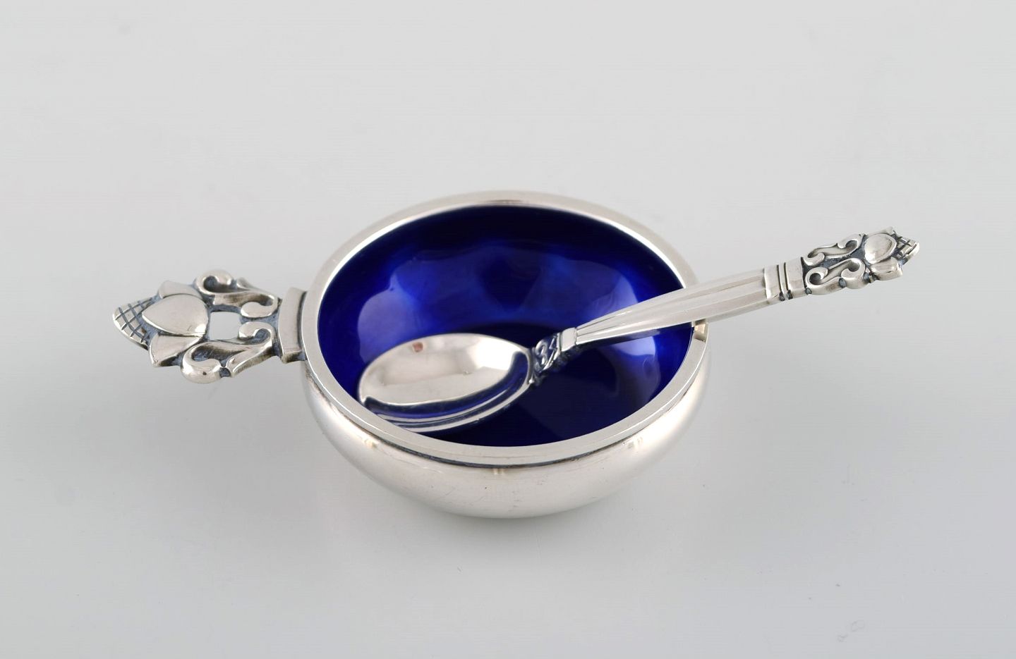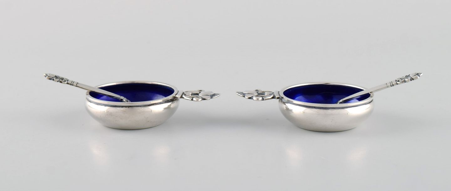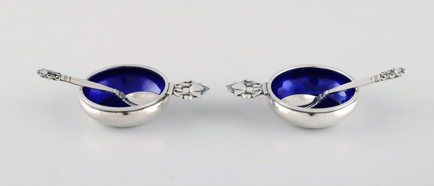 Johan Rohde for Georg Jensen. To konge saltkar i sterlingsølv med kongeblå emalje og tilhørende skeer. Design 62. I flot stand. Stemplet. Saltkaret måler: 6 x 4 x 1,5 cm. Skeen måler: 6 cm.
