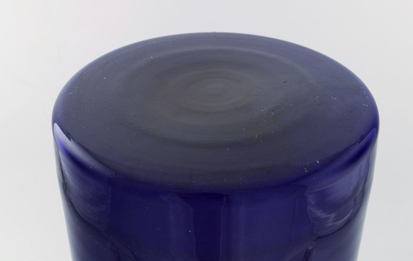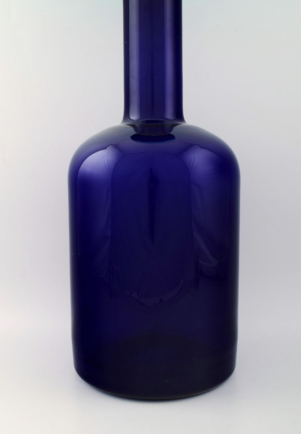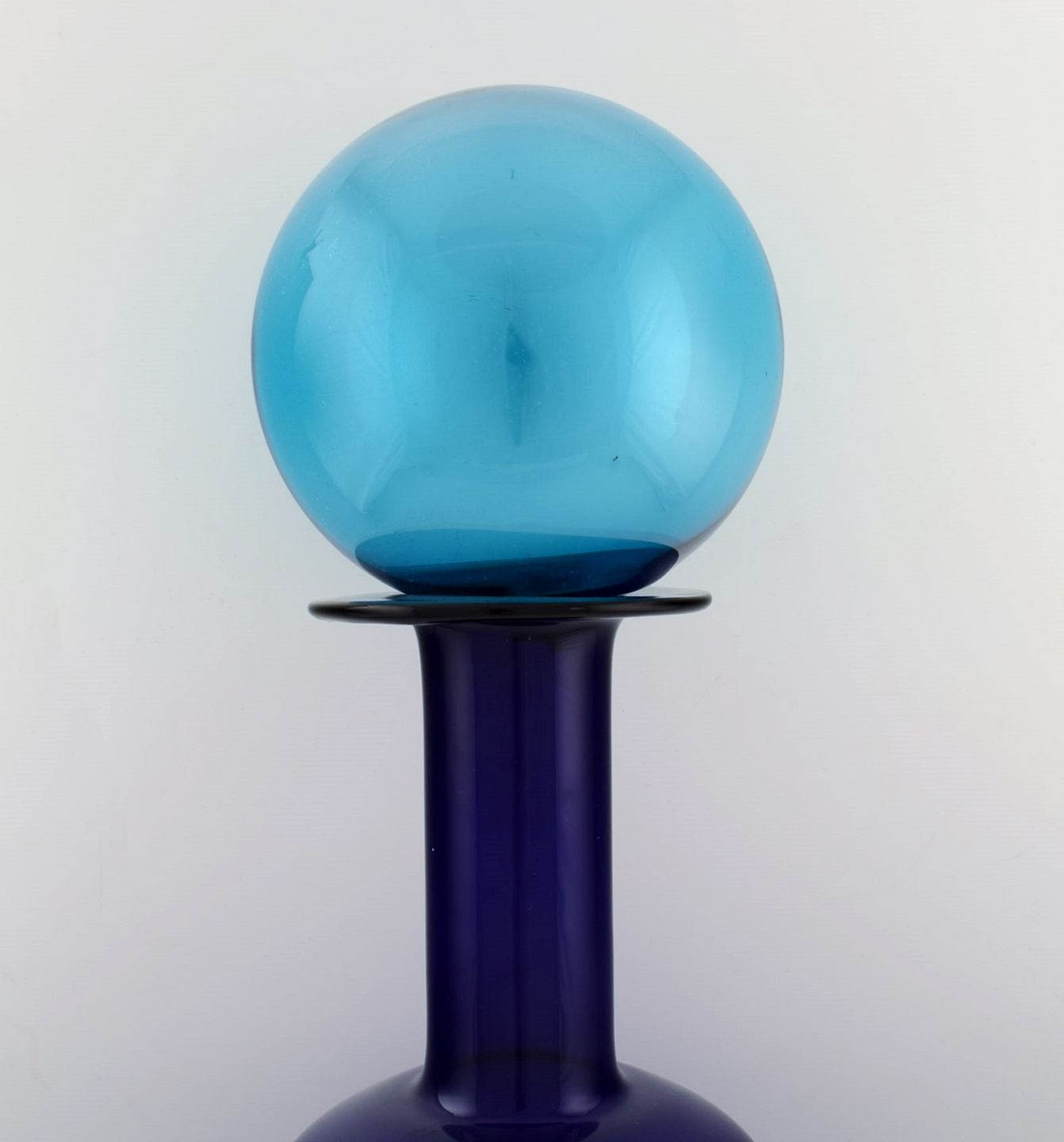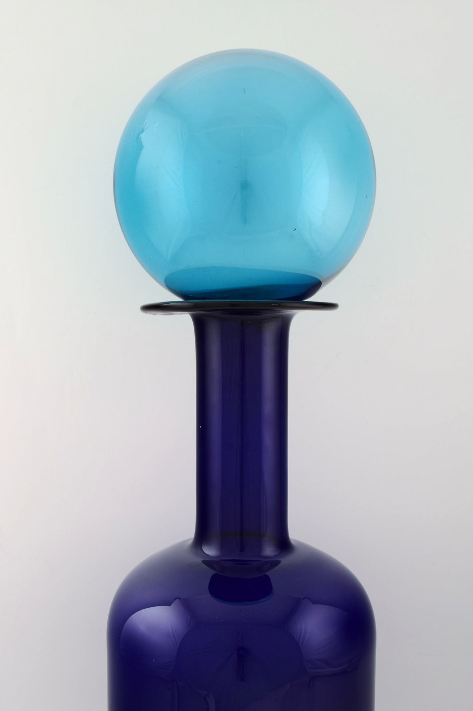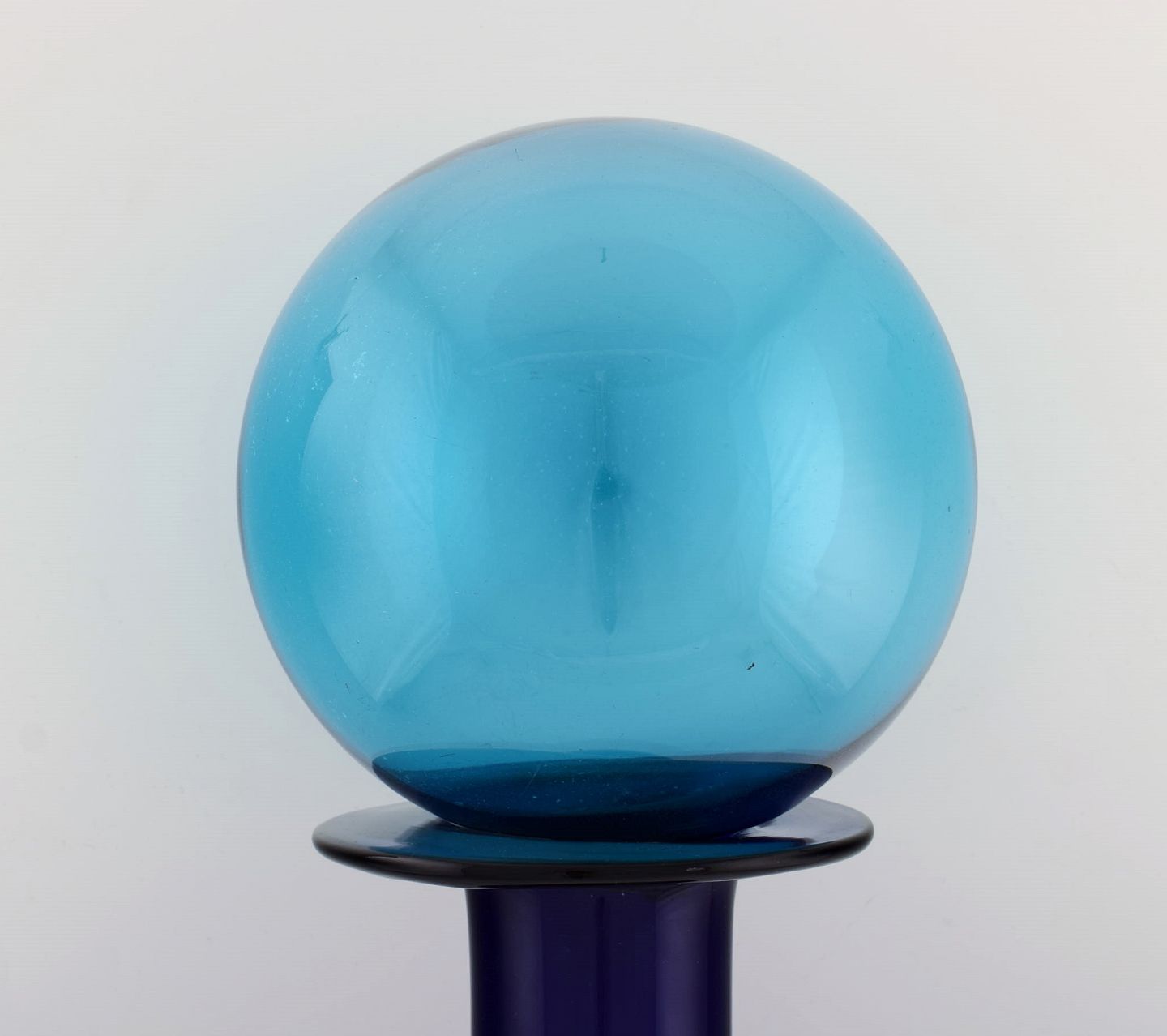 Otto Brauer for Holmegaard. Gigantisk vase/flaske i blåt kunstglas med blå kugle. 1960'erne. Måler: 68,5 x 21 cm (inkl kugle). I perfekt stand.