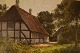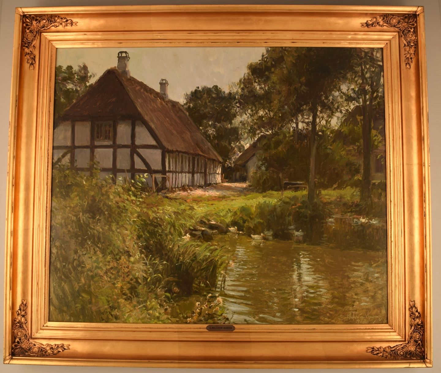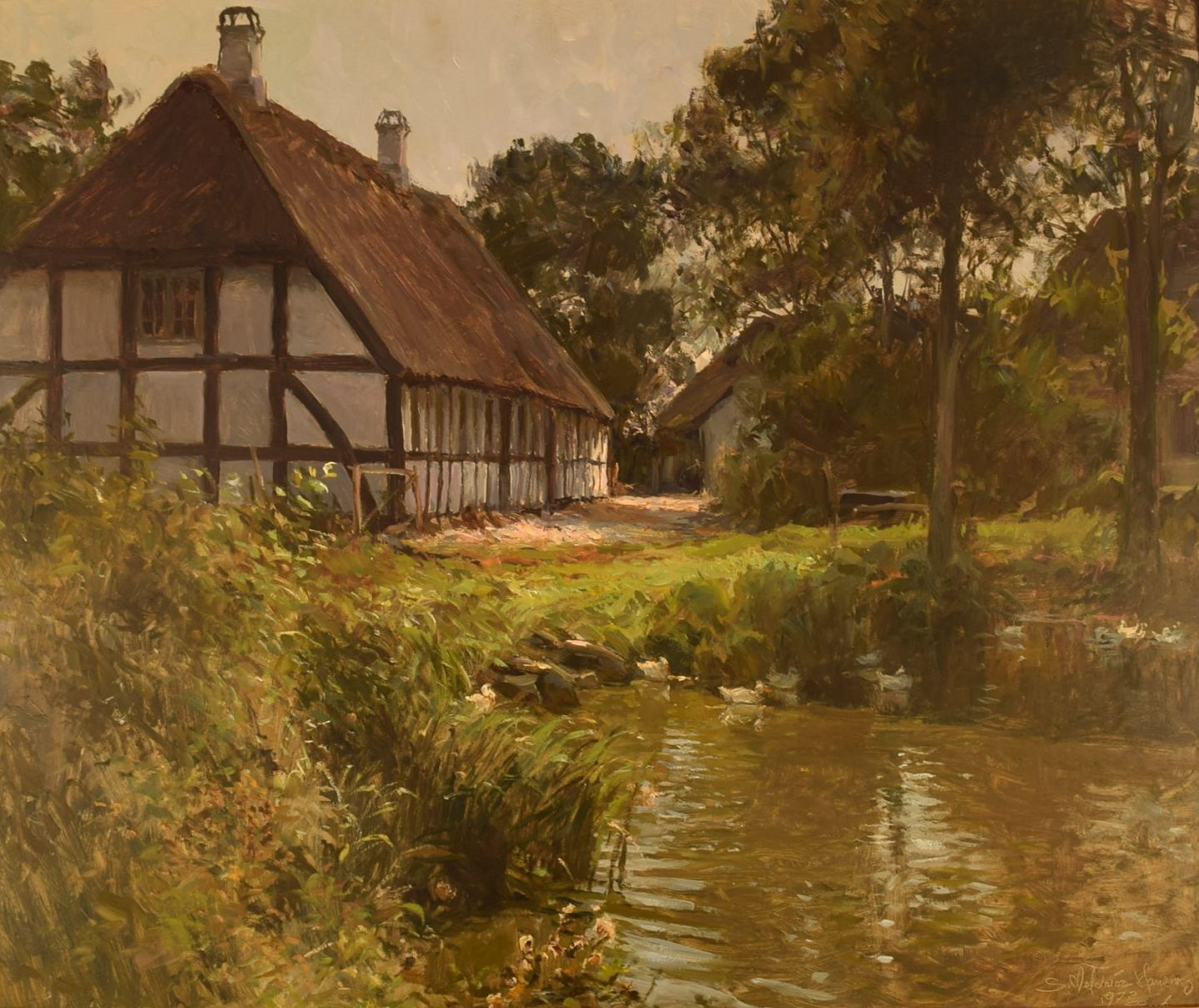 Søren Melchior Hansen (1908-1977), Danmark. Olie på plade. Dansk sommeridyl med stråtækt bindingsværkshus. Dateret 1972.
