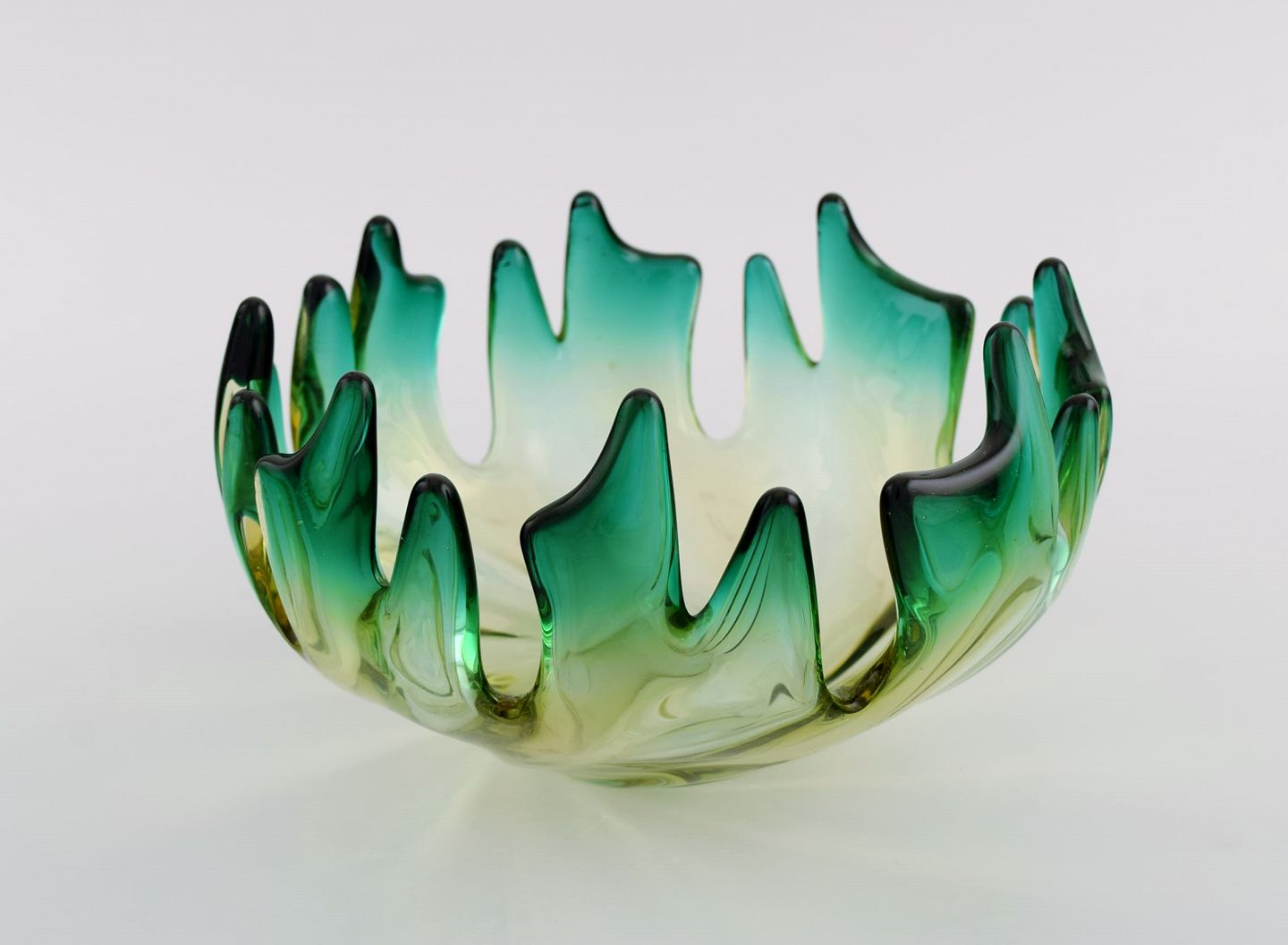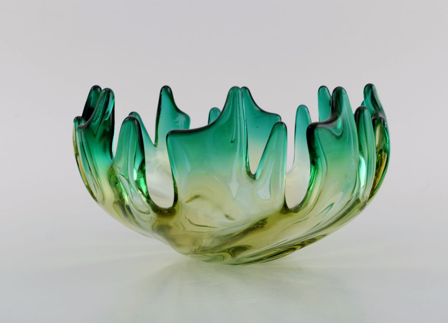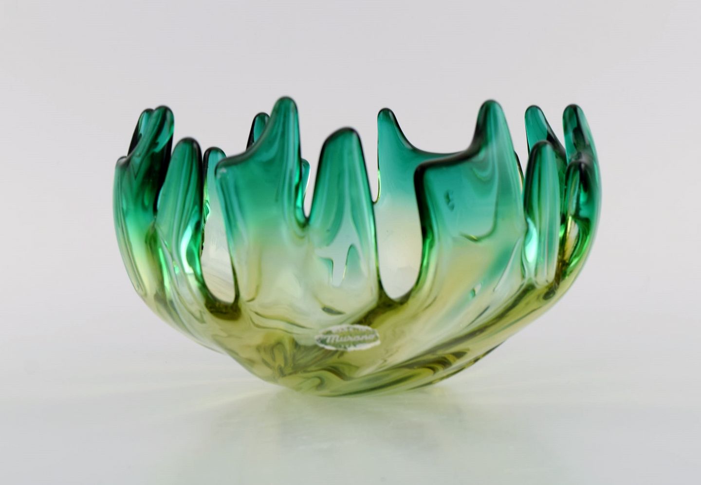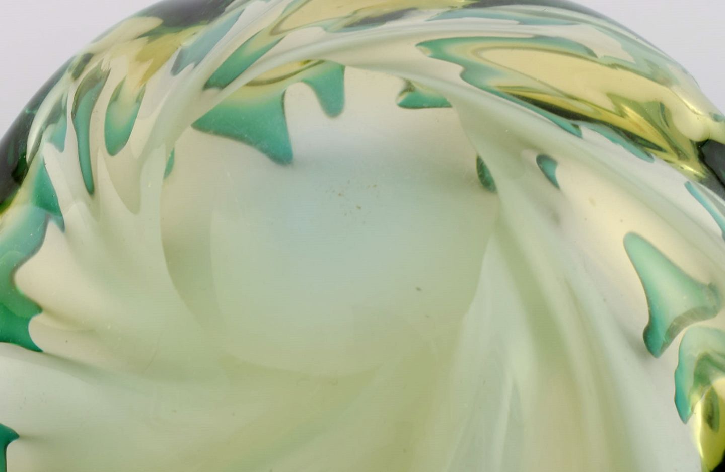 Murano skål i mundblæst kunstglas. Grønne og gule nuancer. 1960'erne. Måler: 20 x 11,5 cm. I flot stand. Mærkat.