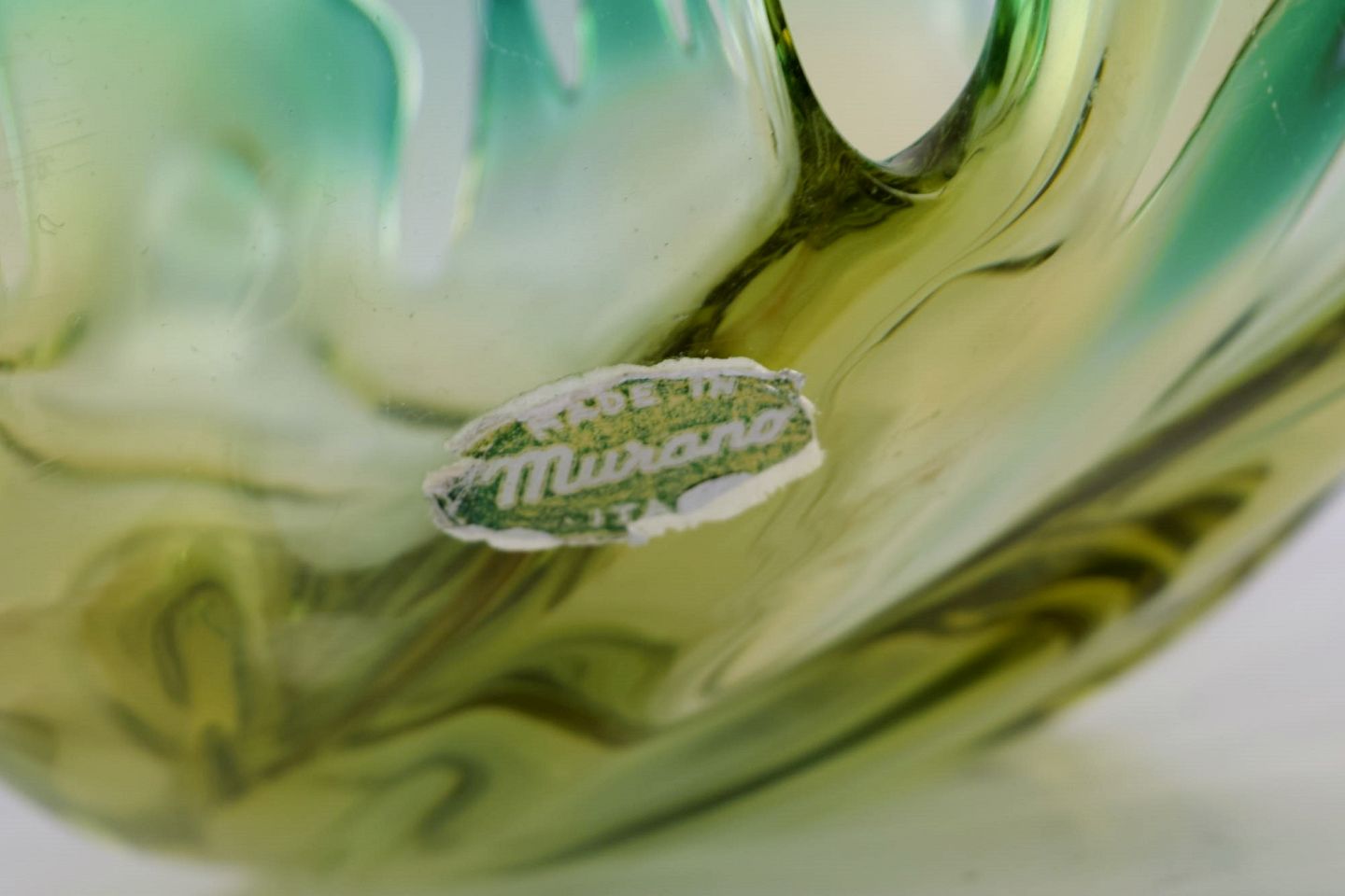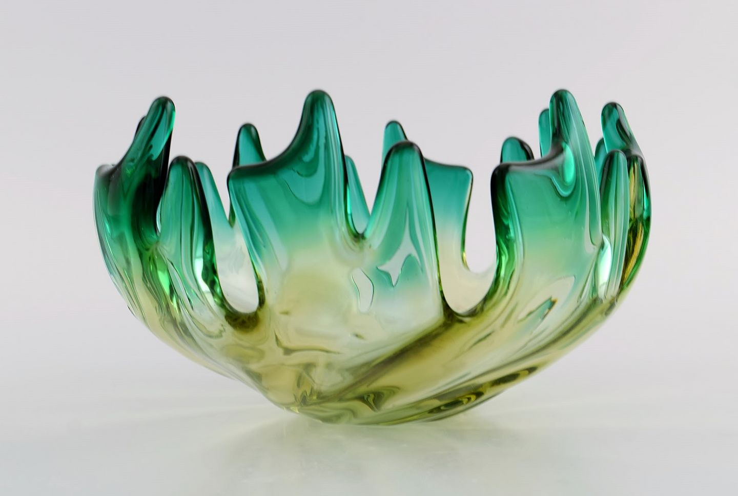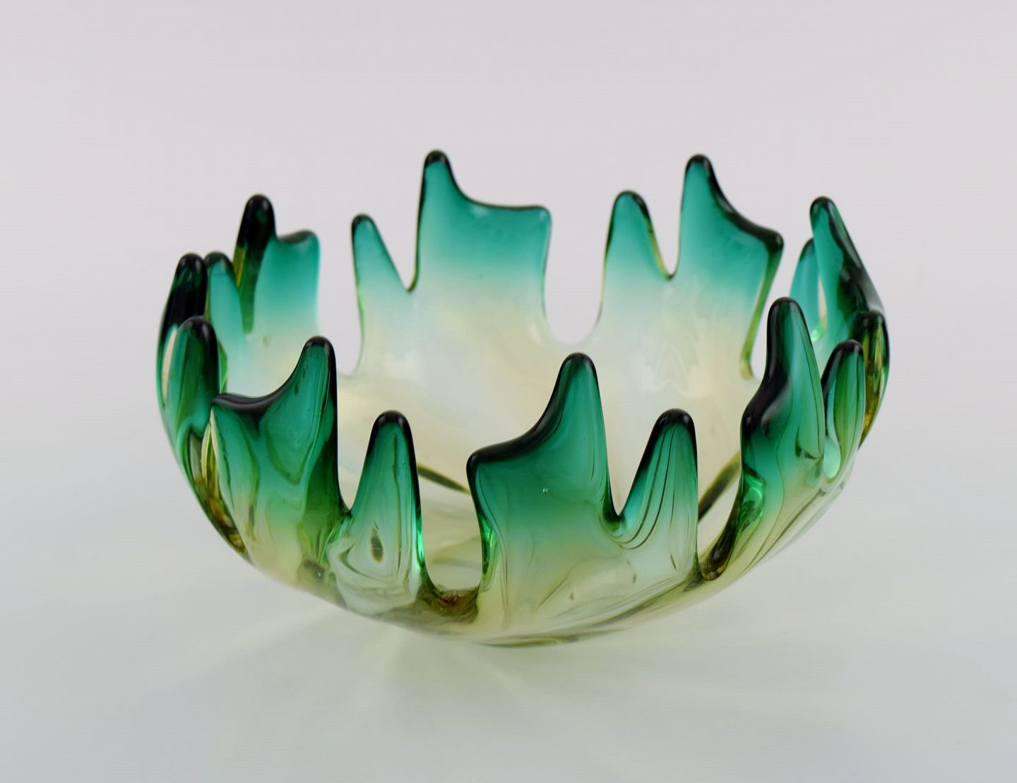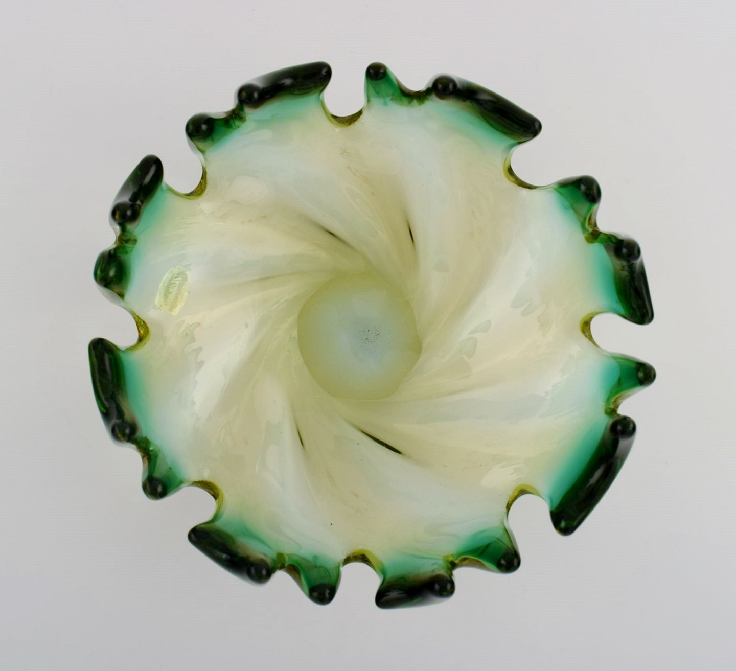 Murano skål i mundblæst kunstglas. Grønne og gule nuancer. 1960'erne. Måler: 20 x 11,5 cm. I flot stand. Mærkat.