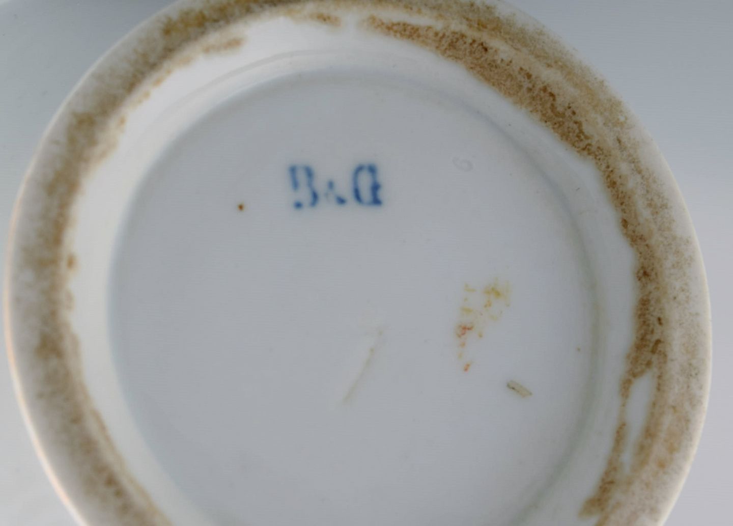Antik Bing & Grøndahl chokoladekande i porcelæn modeleret med løve på hanken. Håndmalede blomster og gulddekoration. 1870'erne.