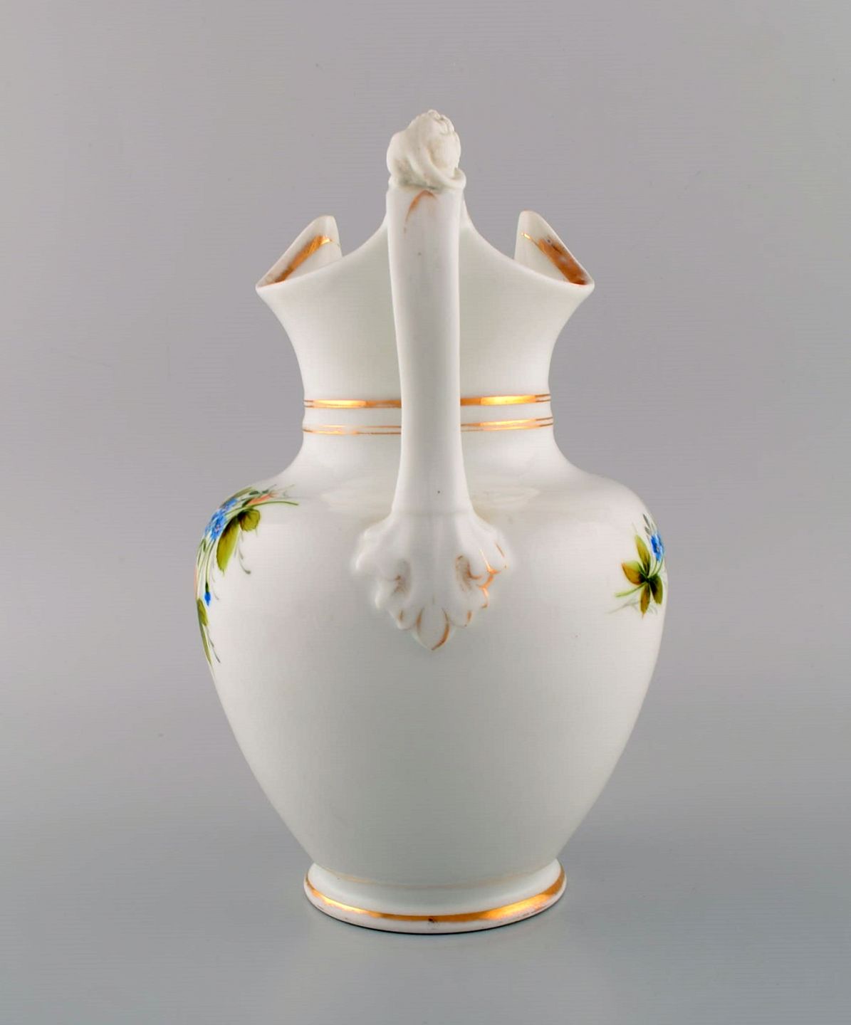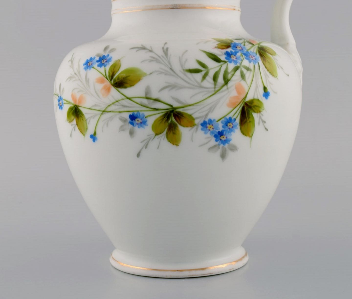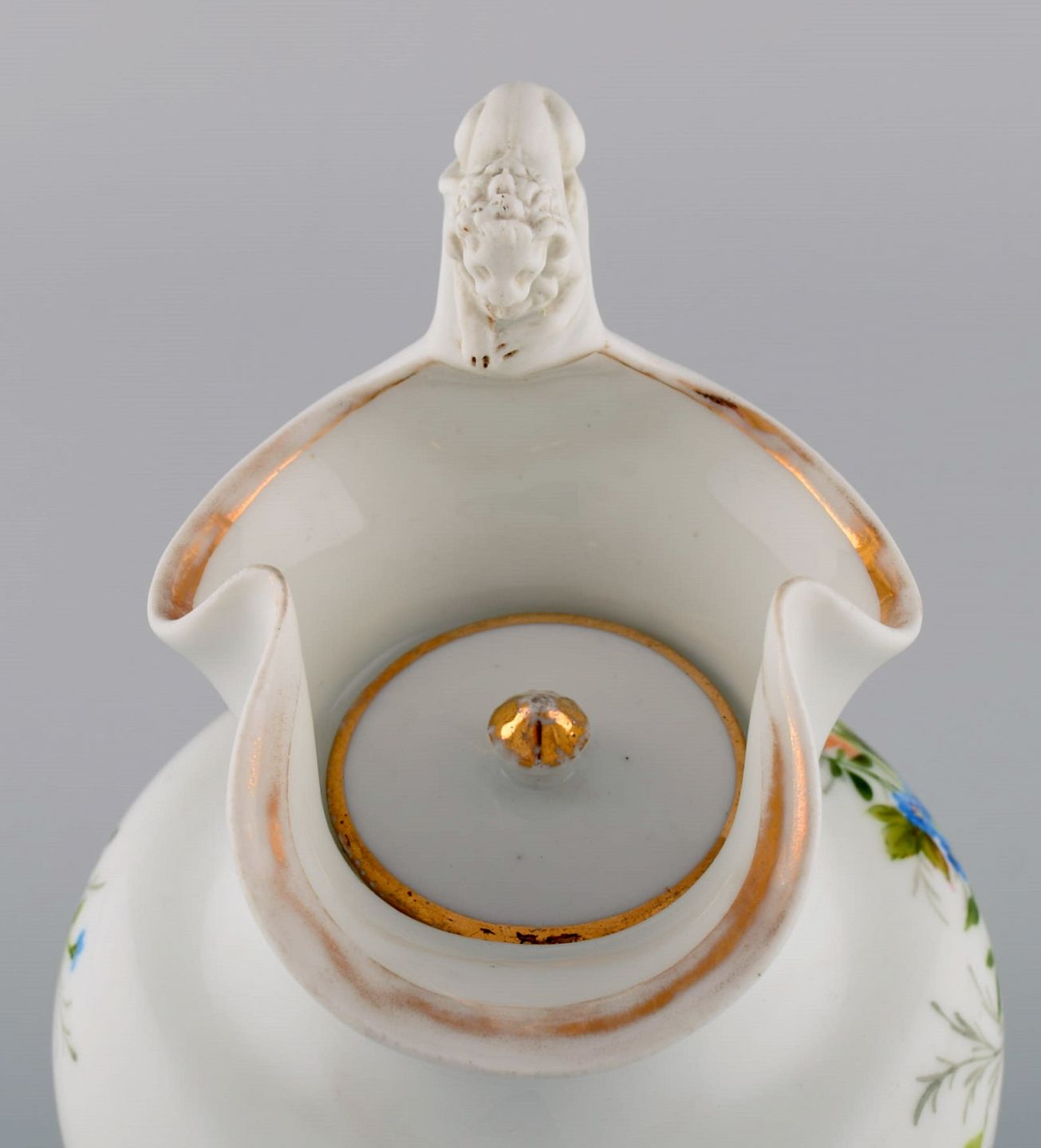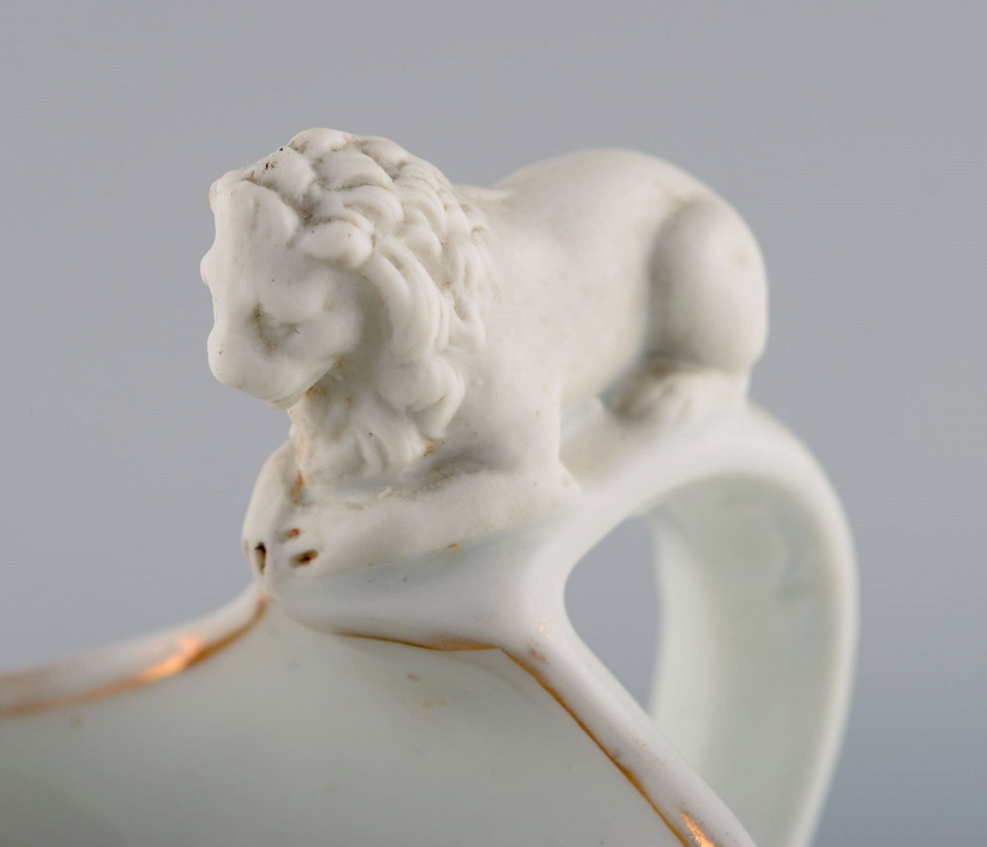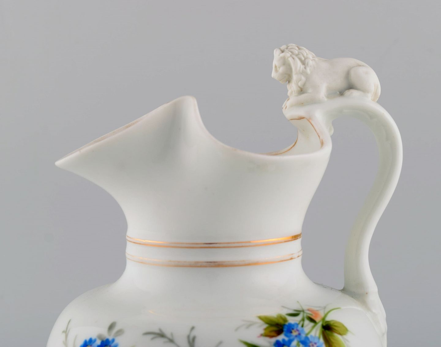 Antik Bing & Grøndahl chokoladekande i porcelæn modeleret med løve på hanken. Håndmalede blomster og gulddekoration. 1870'erne.