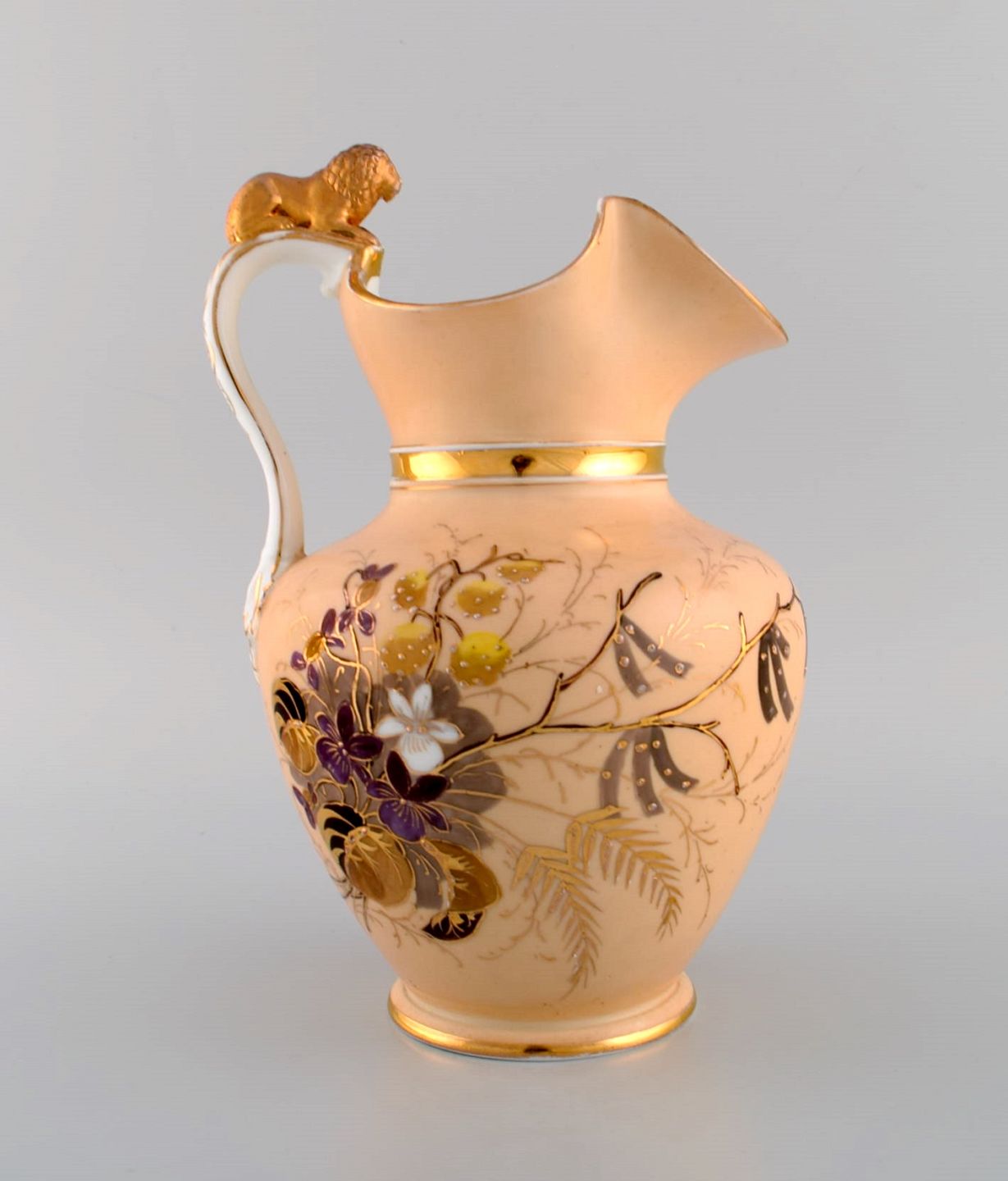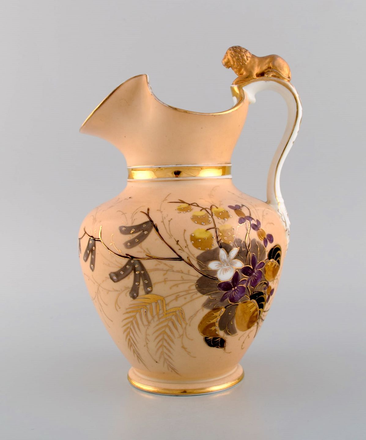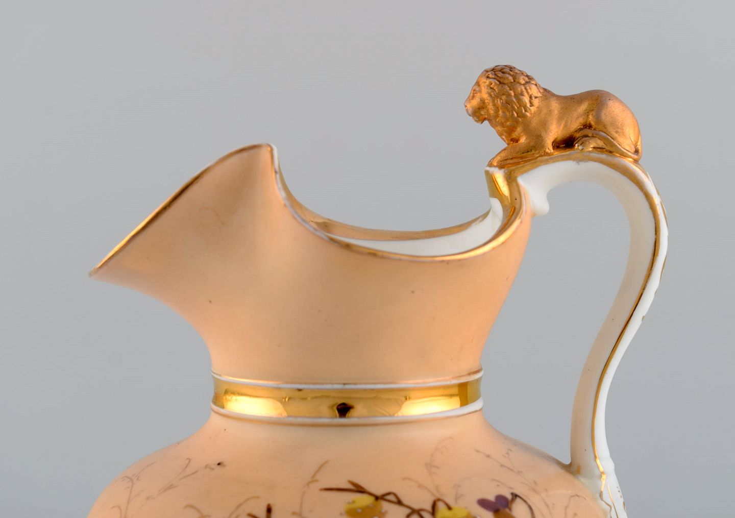 Antique Altwasser chocolate jug in porcelain modeled with a lion on the handle. Hand-painted flowers and gold decoration. Late 19th century.