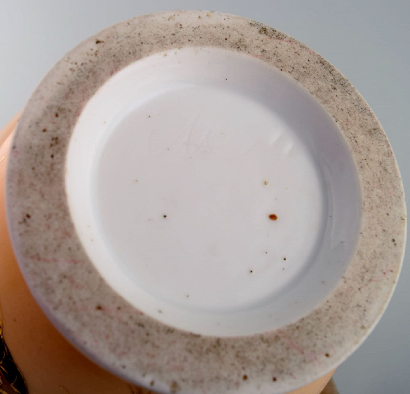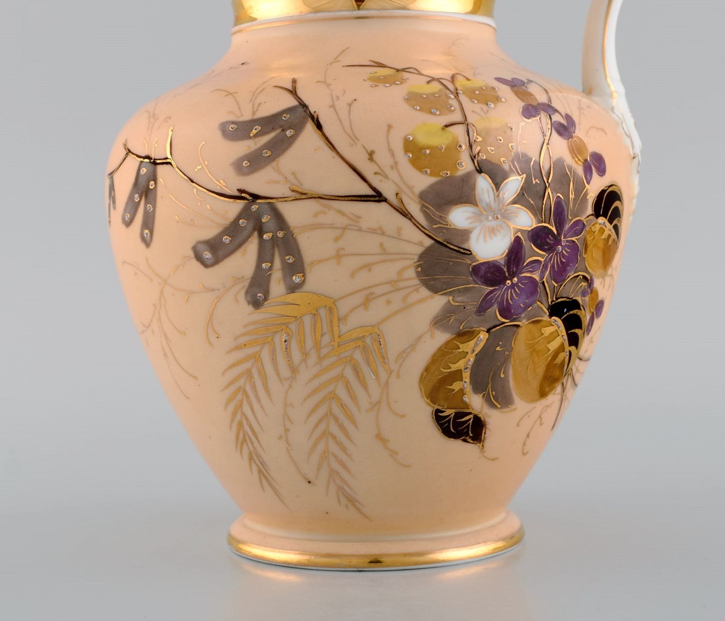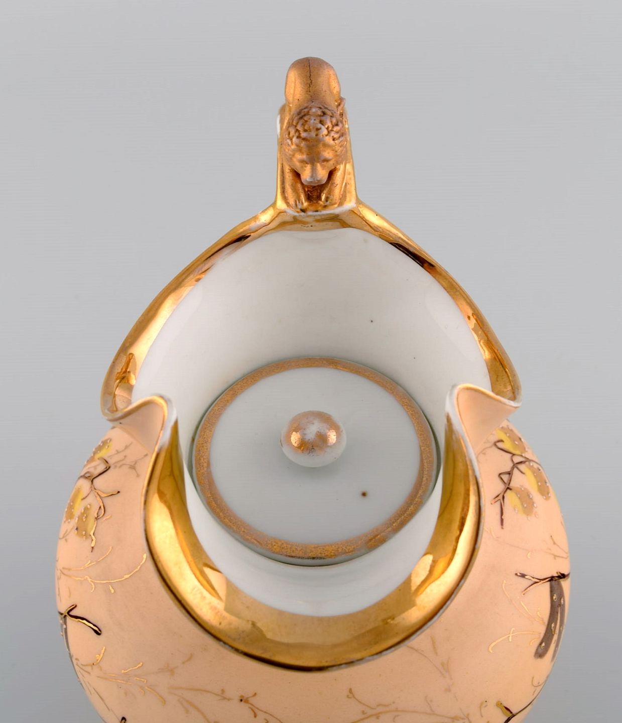 Antique Altwasser chocolate jug in porcelain modeled with a lion on the handle. Hand-painted flowers and gold decoration. Late 19th century.