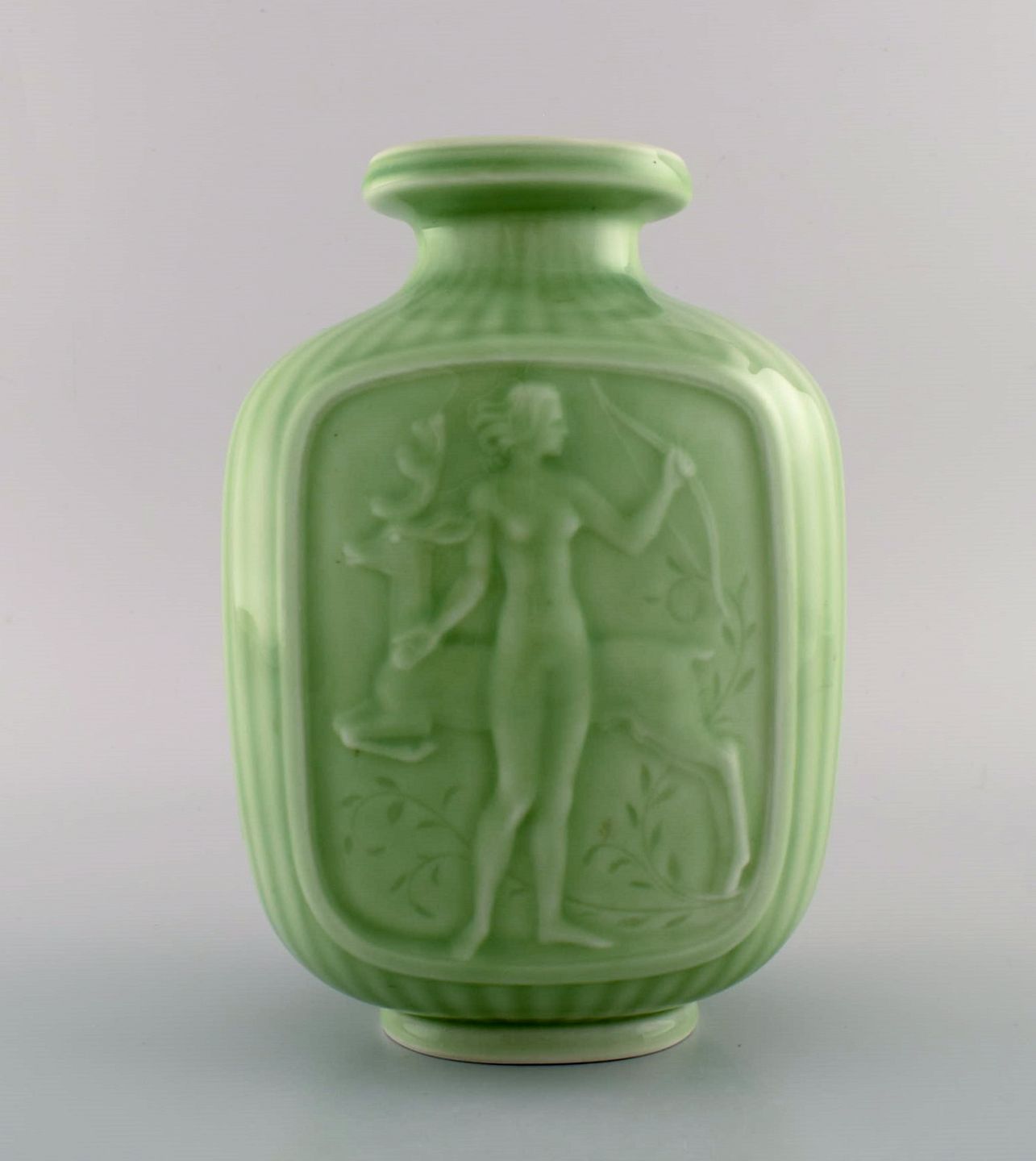 Gunnar Nylund and Harald Salomon for Rörstrand. Art deco vase in glazed ceramics with motifs of the hunting goddess Diana. Beautiful celadon glaze. 1940s.