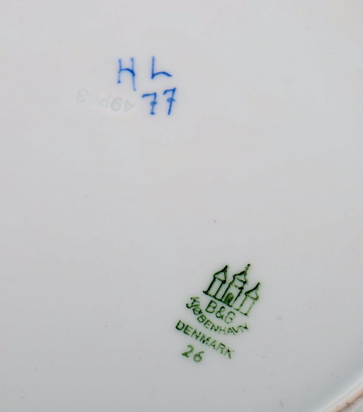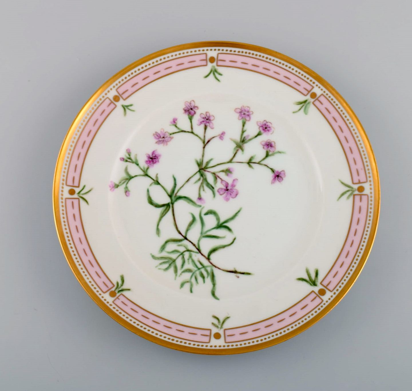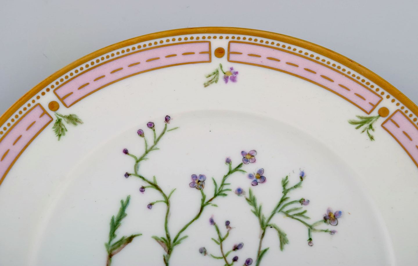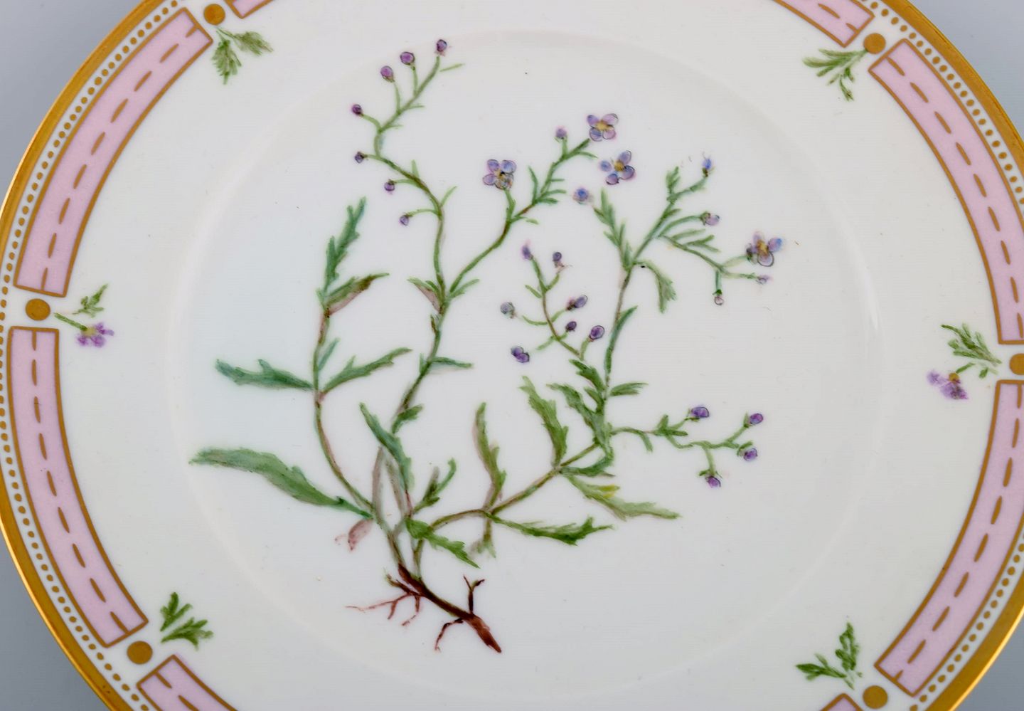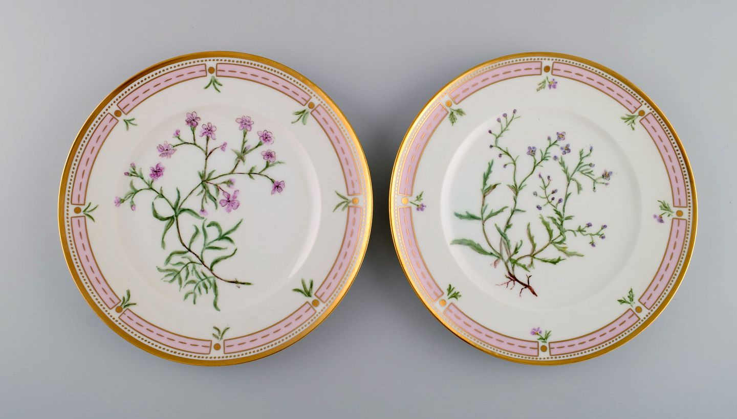 To Bing & Grøndahl tallerkener i porcelæn med håndmalede blomster og gulddekoration. Flora Danica stil, 1920/30'erne. Diameter: 21,7 cm. I flot stand. Stemplet. 2. Sortering.