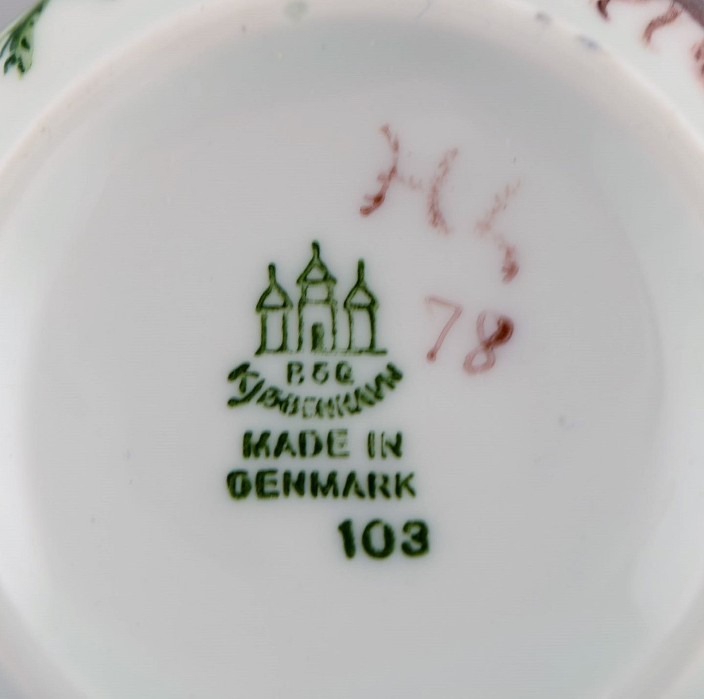To Bing & Grøndahl kaffekopper med underkopper i håndmalet porcelæn. Blomster og gulddekoration. Flora Danica stil, 1920/30'erne.