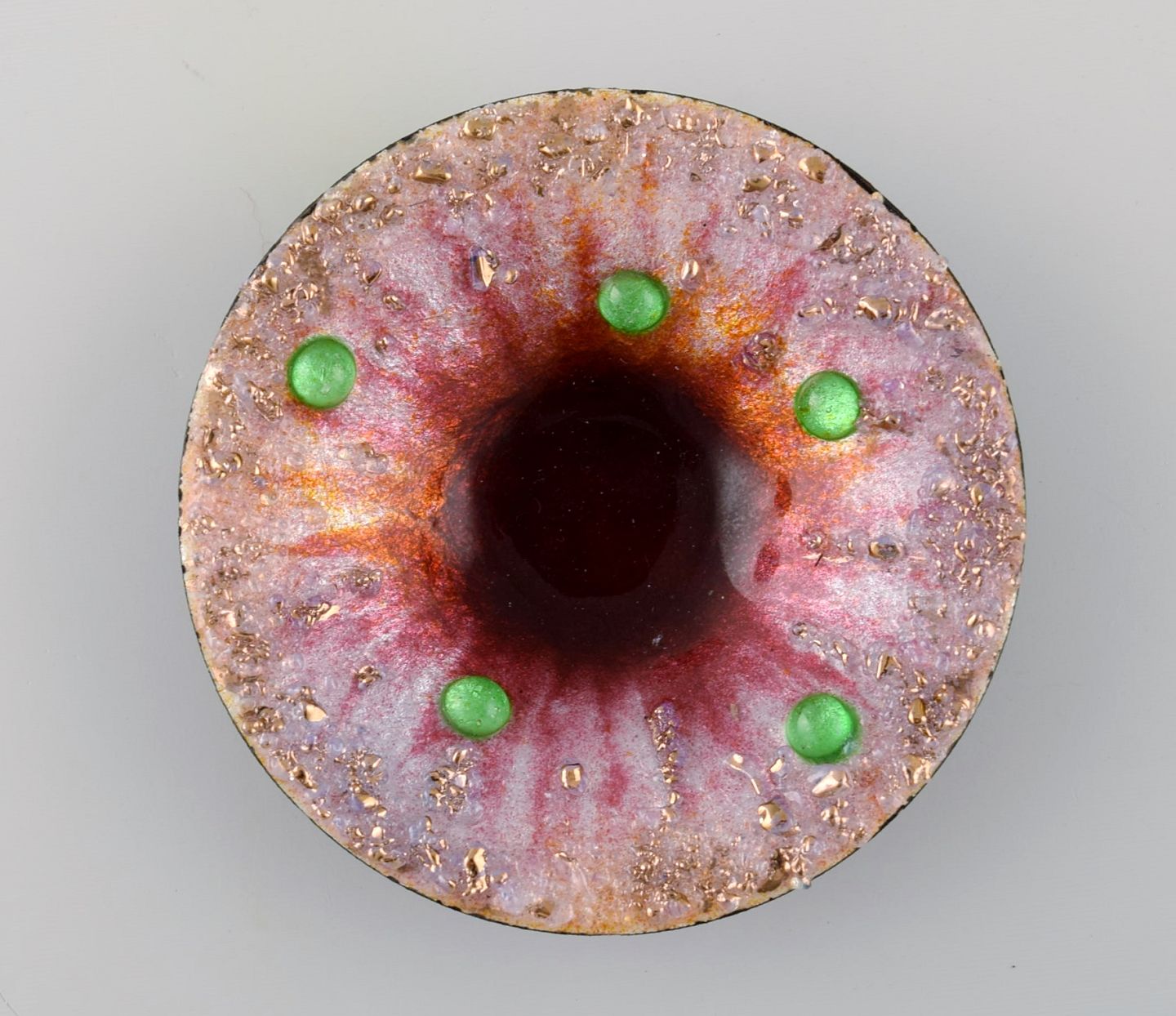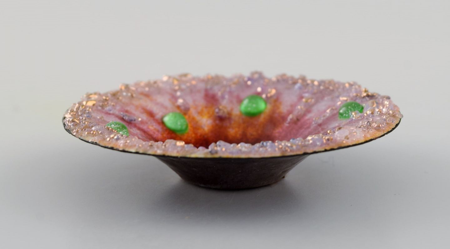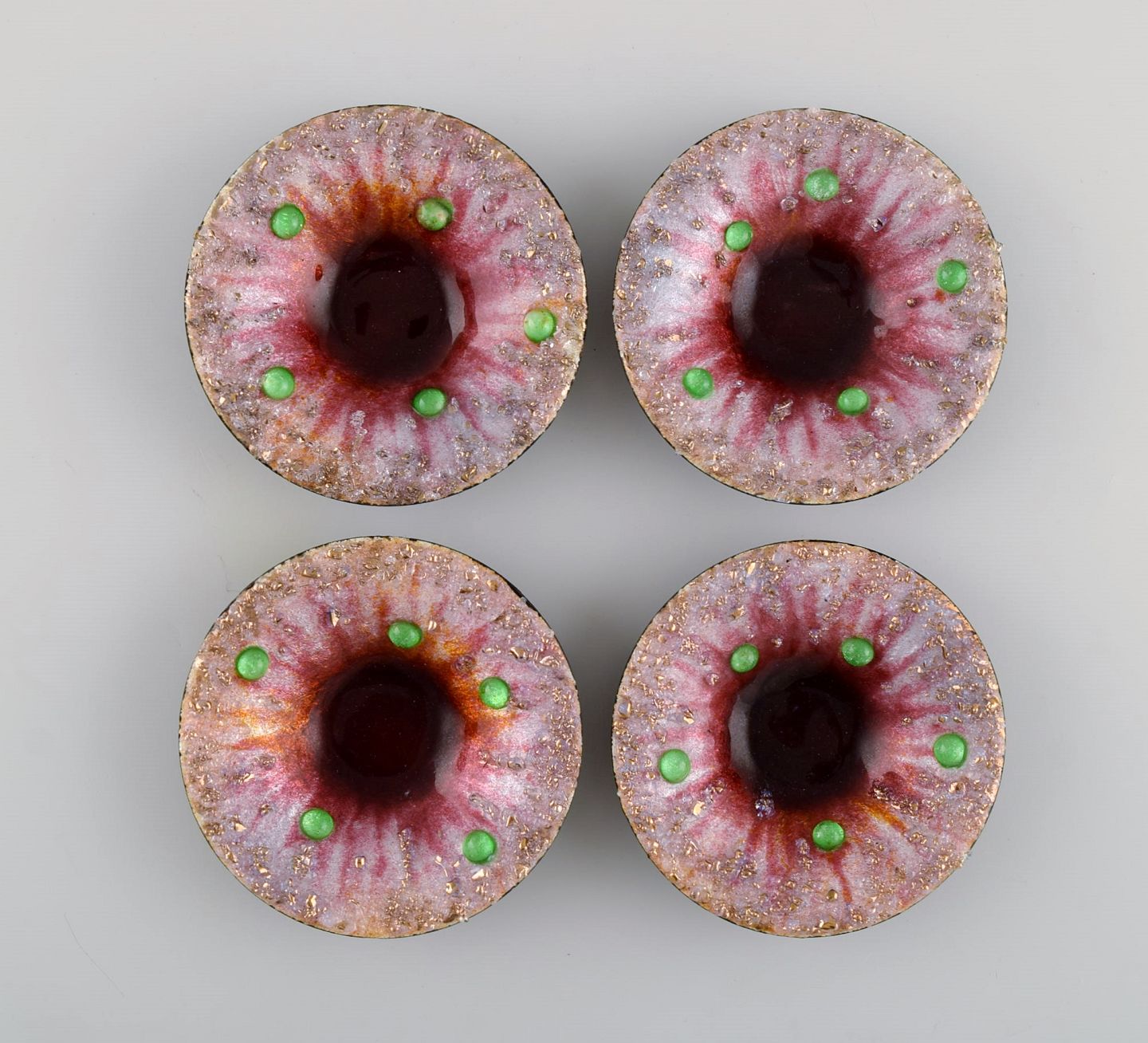 Camille Fauré for Limoges, Frankrig. Fire art nouveau bronzeskåle i emaljearbejde. Grønne kunstglas-sten indlagt på lyserød baggrund. Ca. 1910.