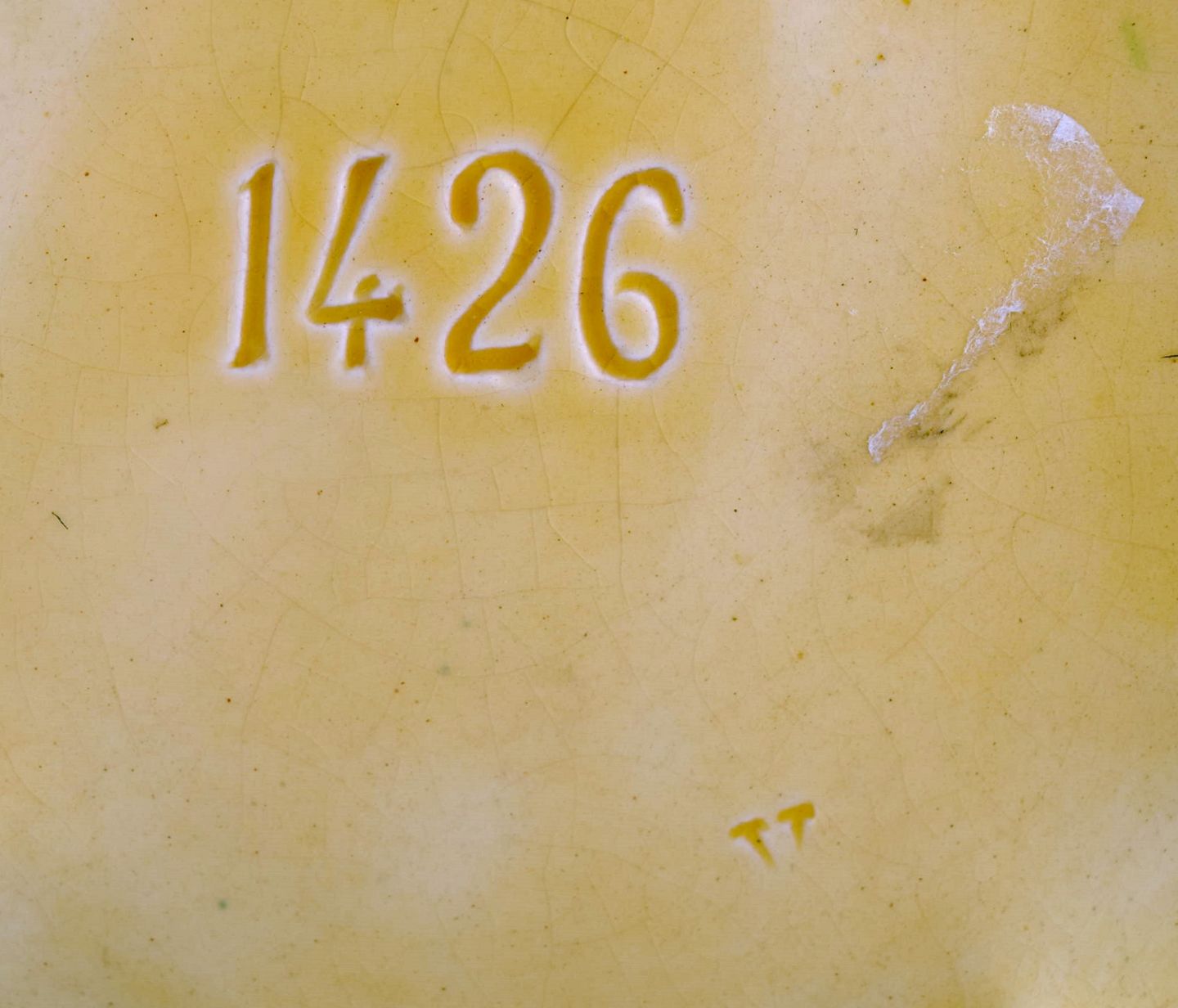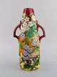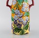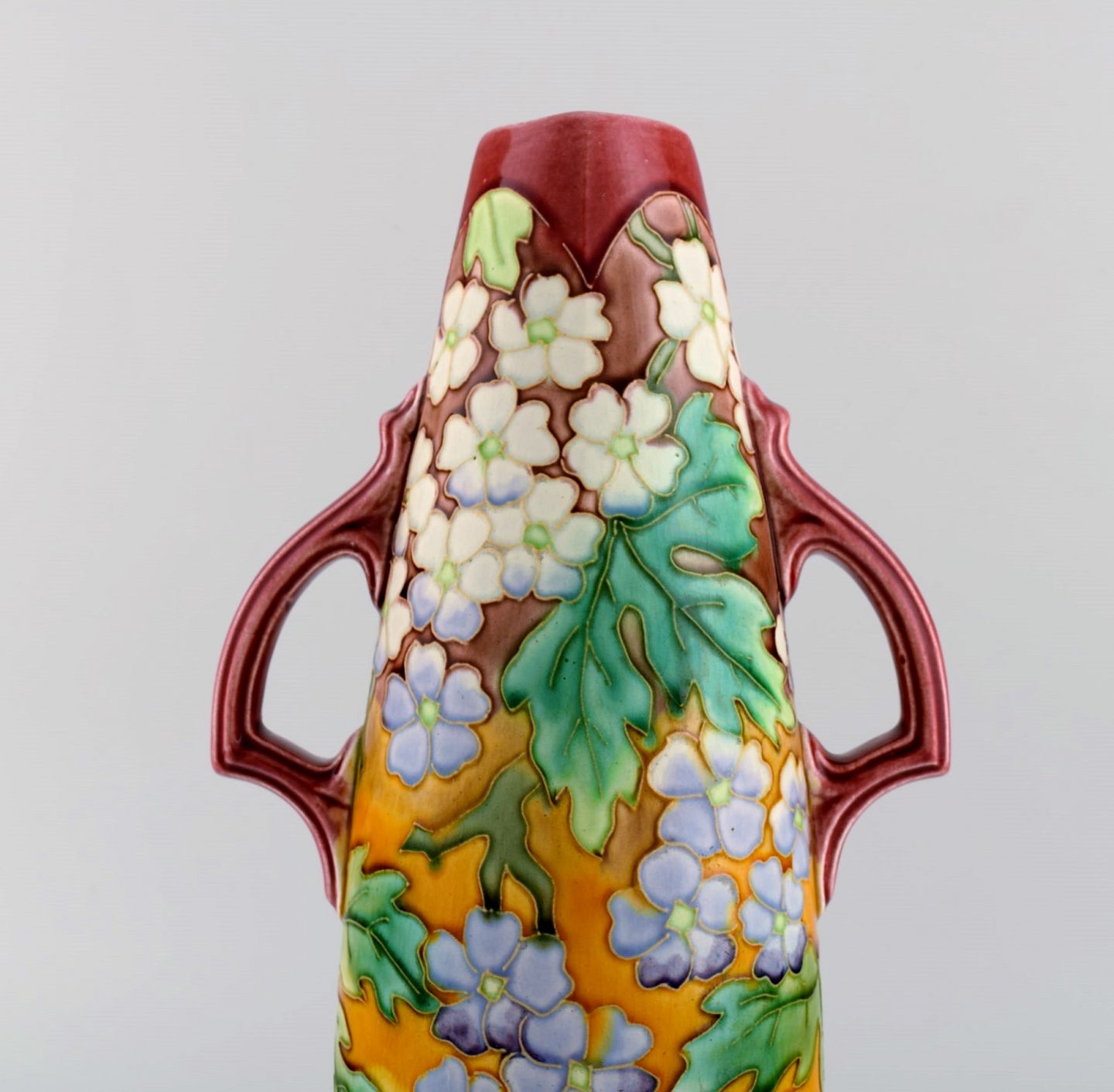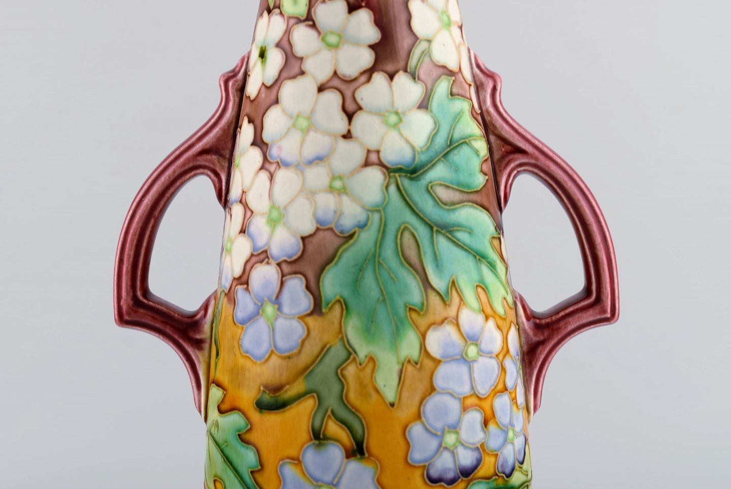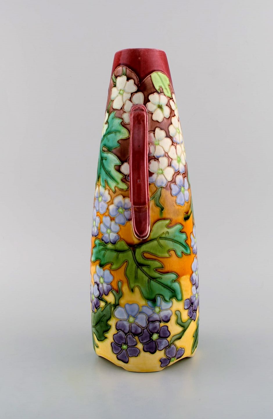 Stor antik art nouveau vase med hanke i glaseret keramik. Håndmalede blomster og bladværk på rød baggrund. Tidligt 1900-tallet.