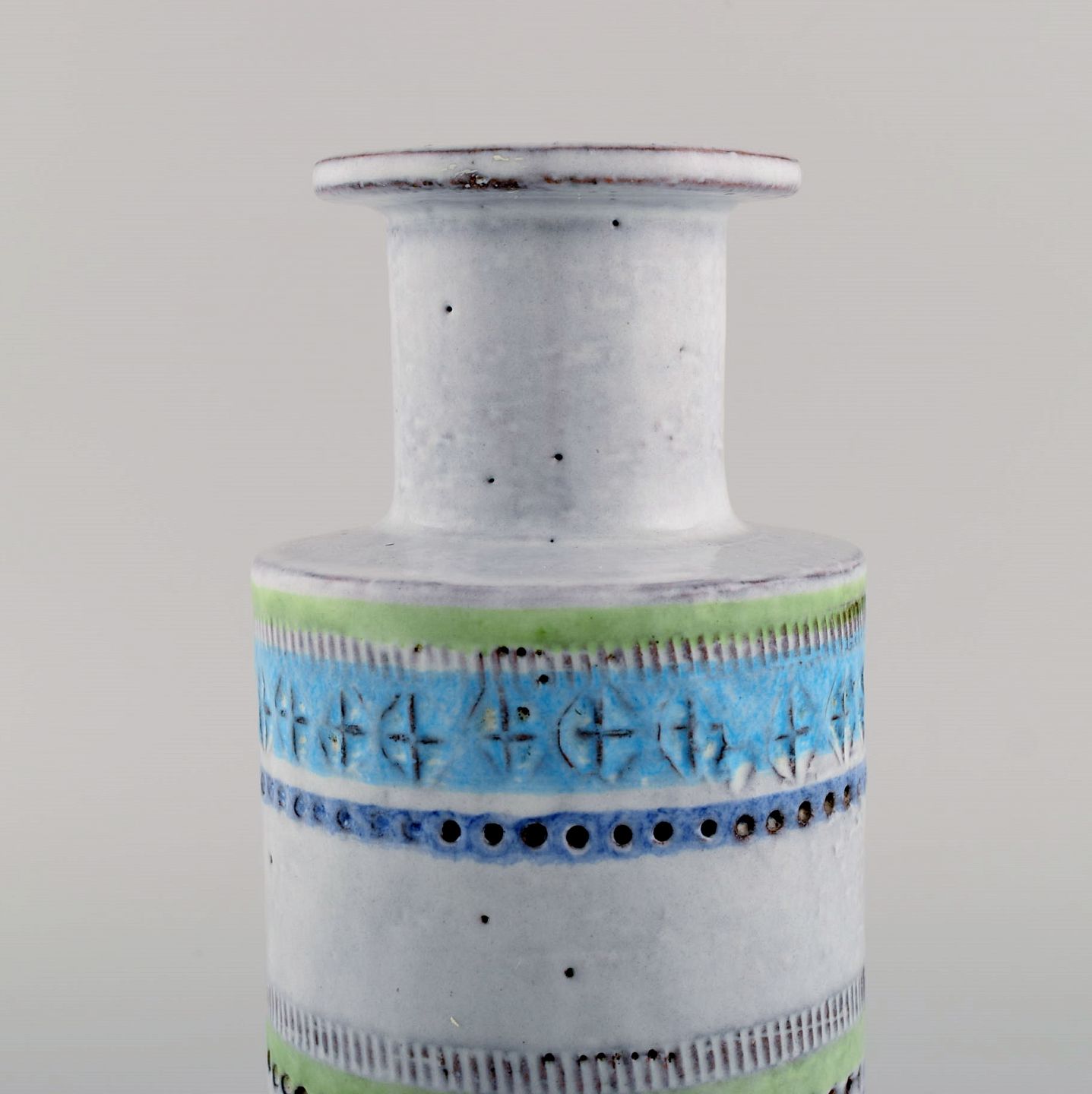 Bitossi vase i glaseret keramik. Smuk glasur i lyse blå nuancer. Stribet design. Midt 1900-tallet. Måler: 19,5 x 10 cm. I flot stand.