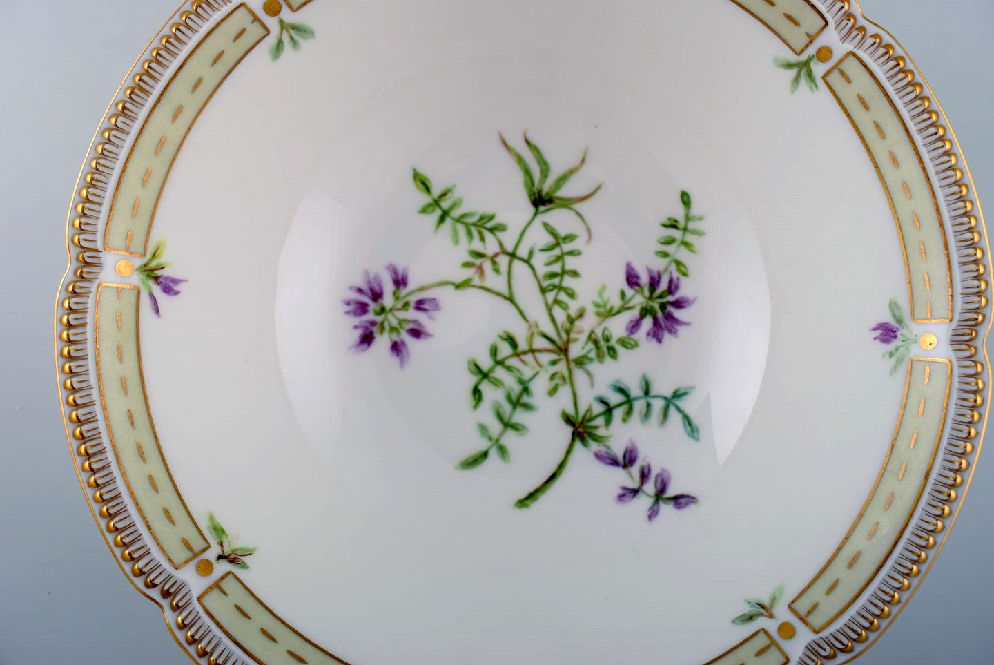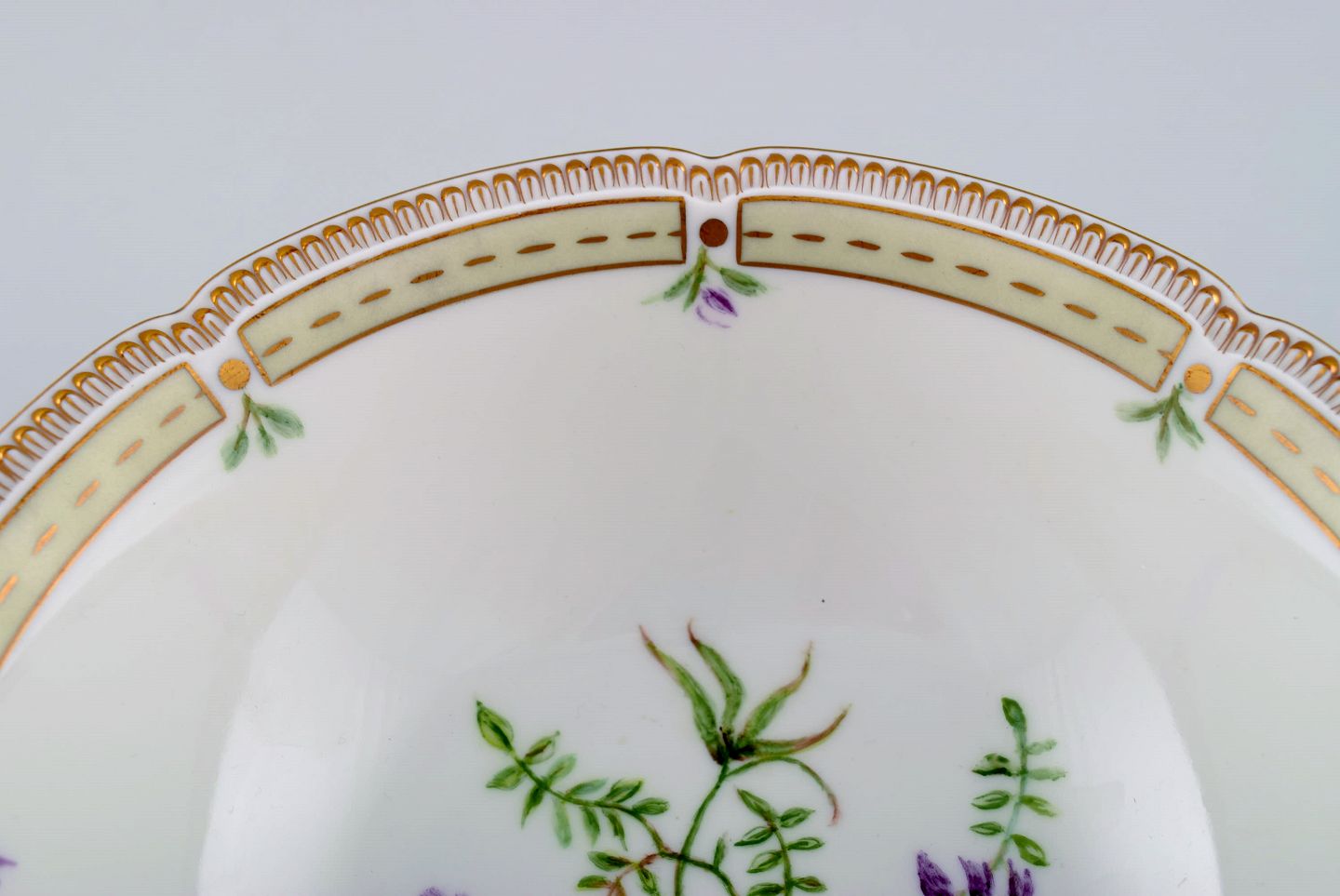 Porcelænsskål med håndmalede blomster og gulddekoration. Flora Danica stil. Dateret 1979. Måler: 21 x 7 cm. I flot stand. Stemplet.