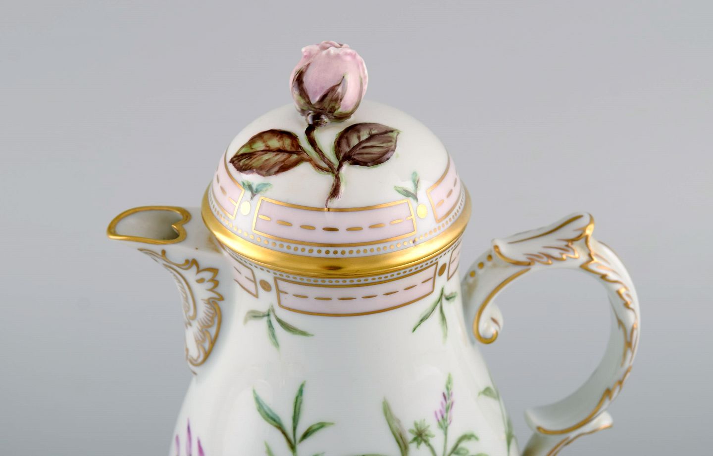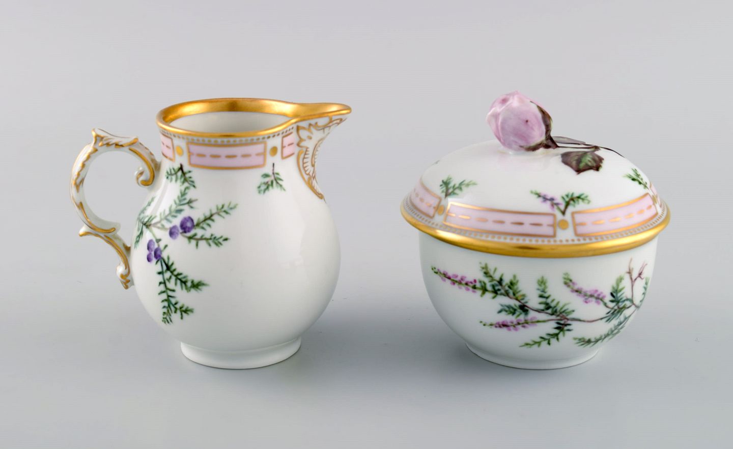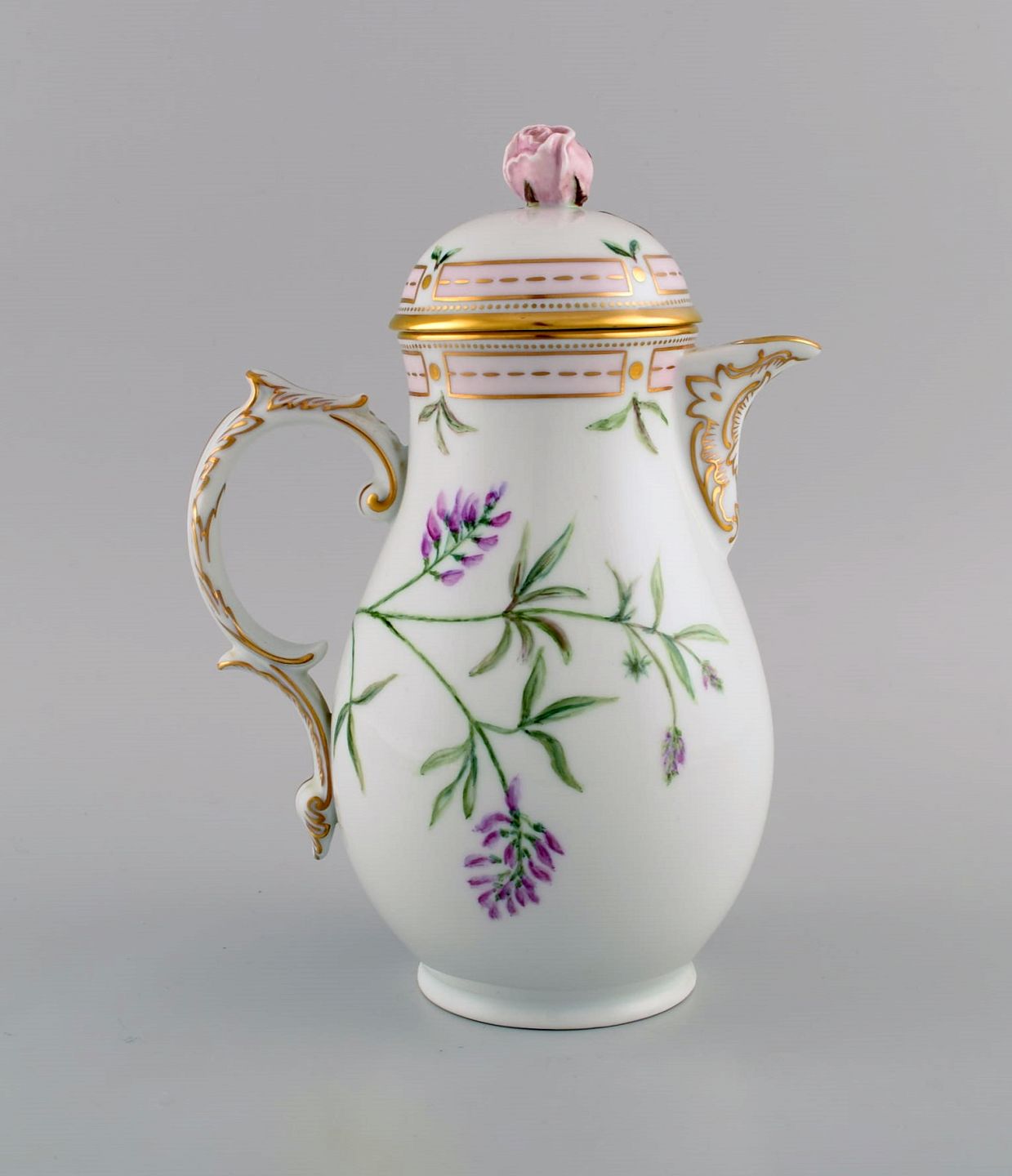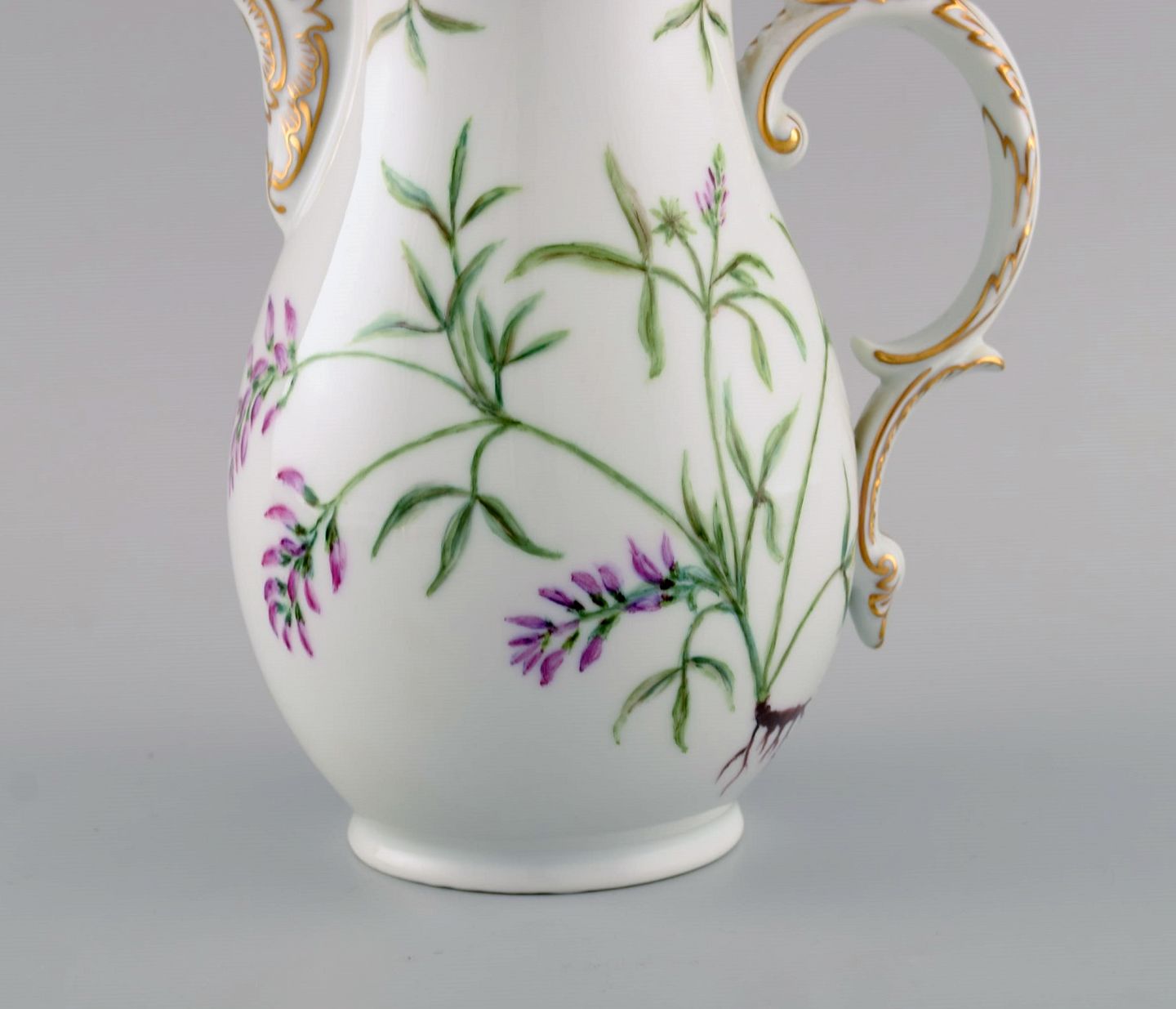 Fürstenberg, Tyskland. Kaffekande, sukkerskål og flødekande i håndmalet porcelæn med blomster og gulddekoration. Flora Danica stil. Midt 1900-tallet.