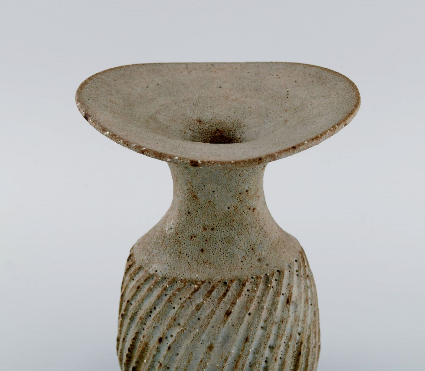 Lucie Rie (f. 1902, d. 1995, østrigsk-født britisk keramiker. Stor modernistisk unika vase i glaseret keramik / stentøj. Smuk glasur i lyse jordnuancer. Rillet korpus. Trumpet formet munding. Eget værksted, ca. 1970.