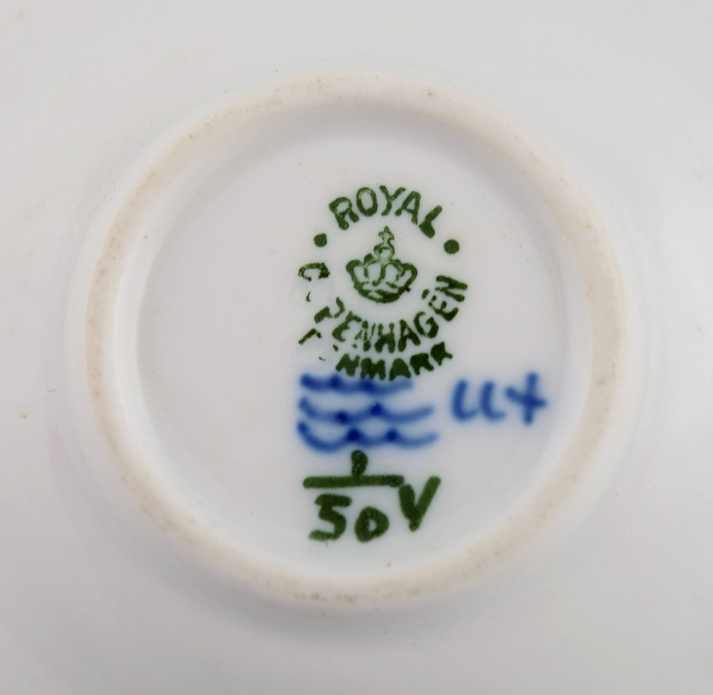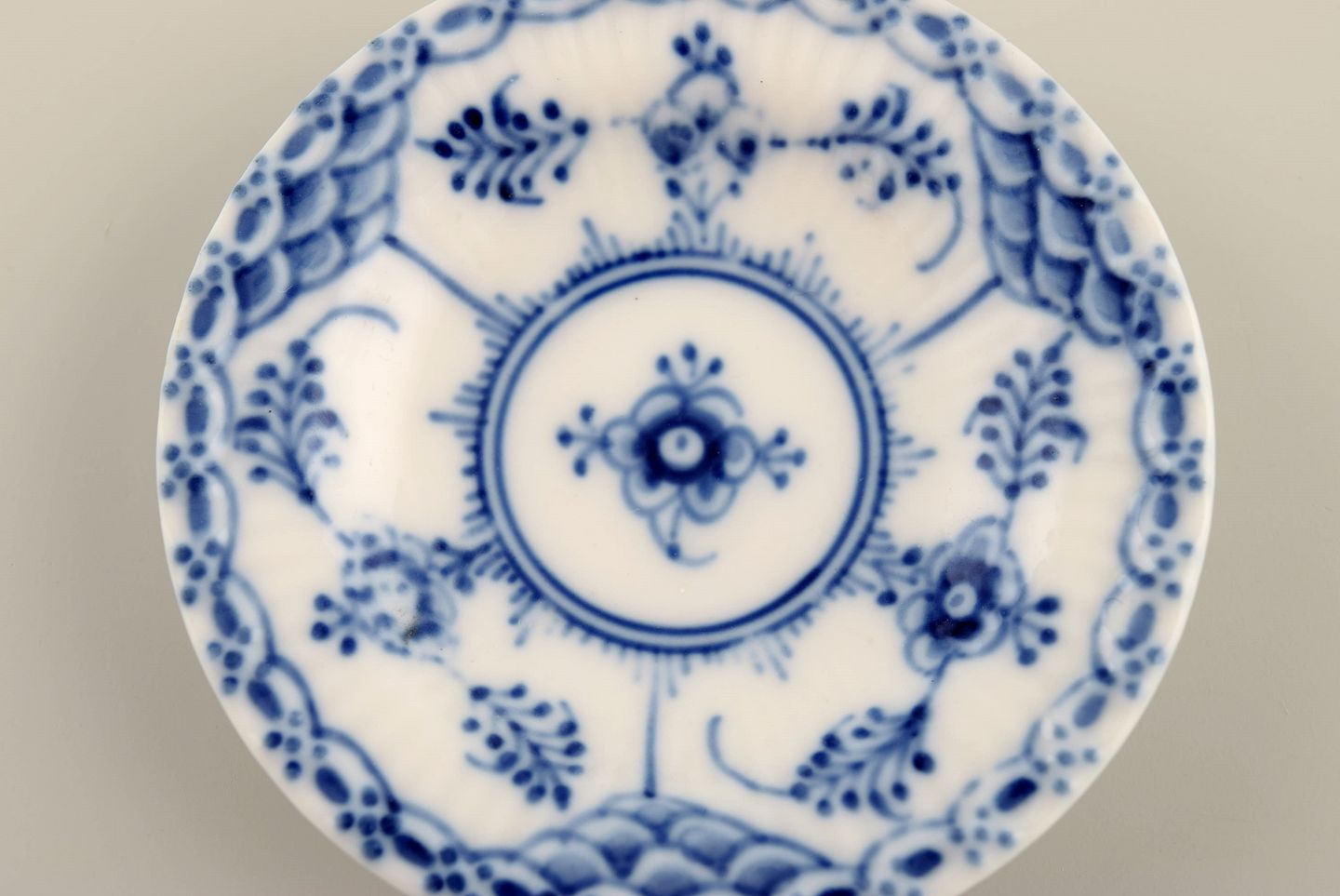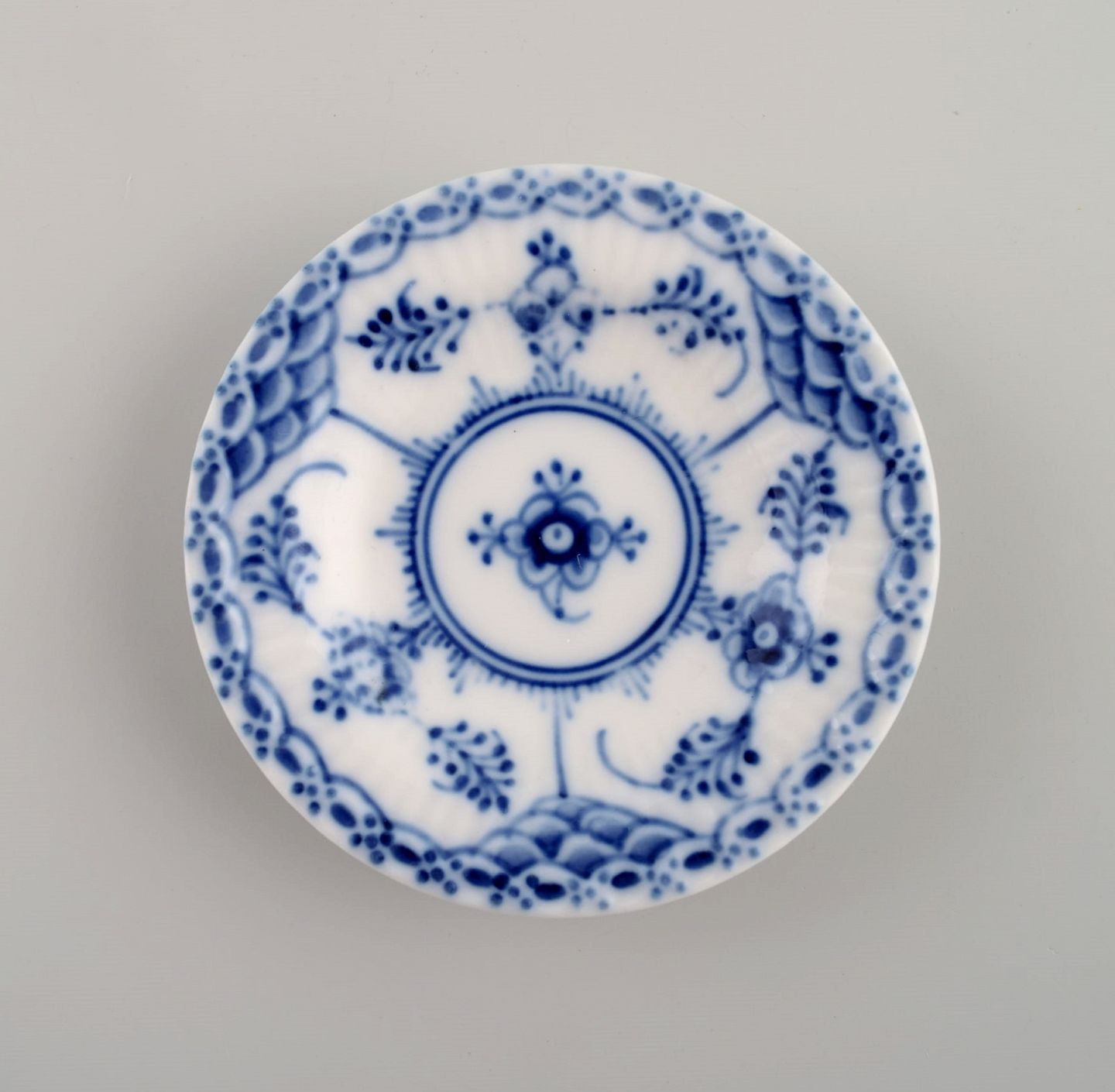Fire Royal Copenhagen Musselmalet Halvblonde kuvertsmør. Modelnummer 1/504. Diameter: 7,5 cm. I flot stand. Stemplet. 1.Sortering.