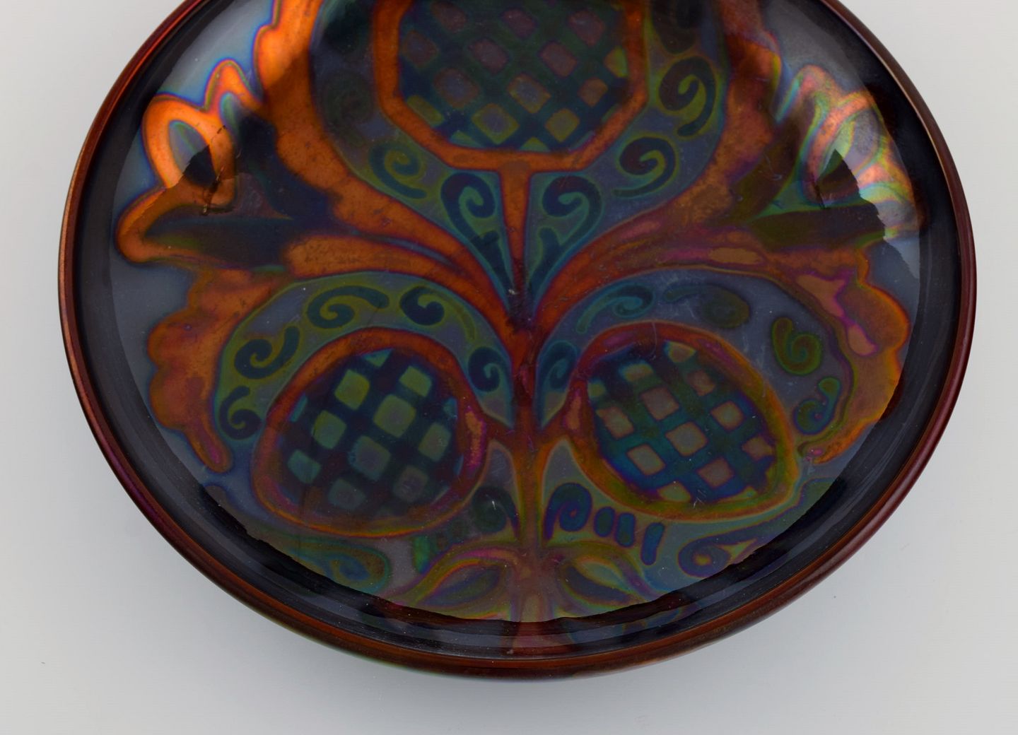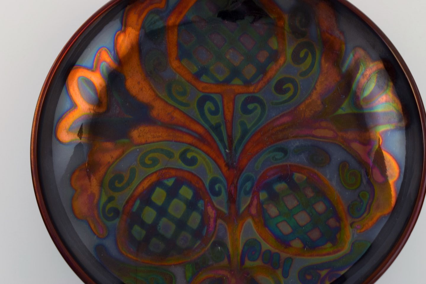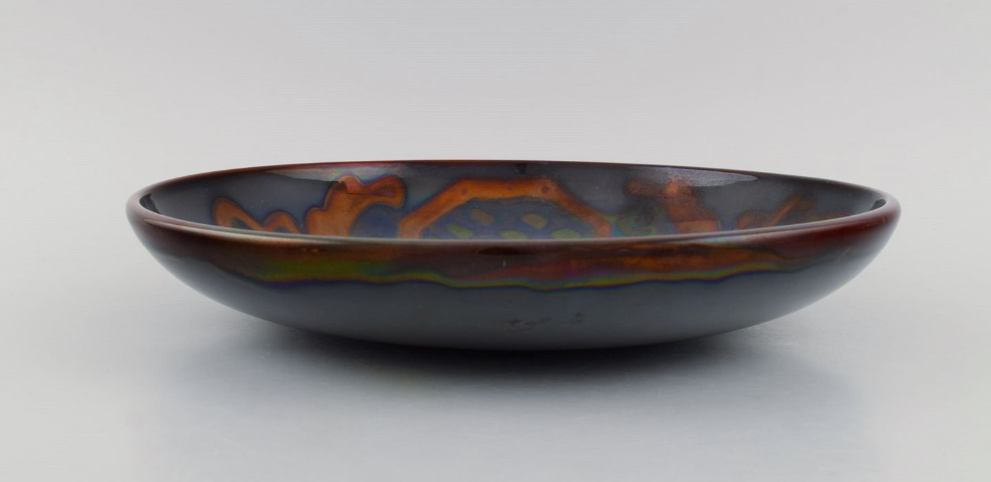 Stort Höganäs fad i glaseret stentøj med håndmalet blomsterdekoration. Smuk lustreglasur. 1920/30'erne. Måler: 30,5 x 5 cm. I flot stand. Stemplet.