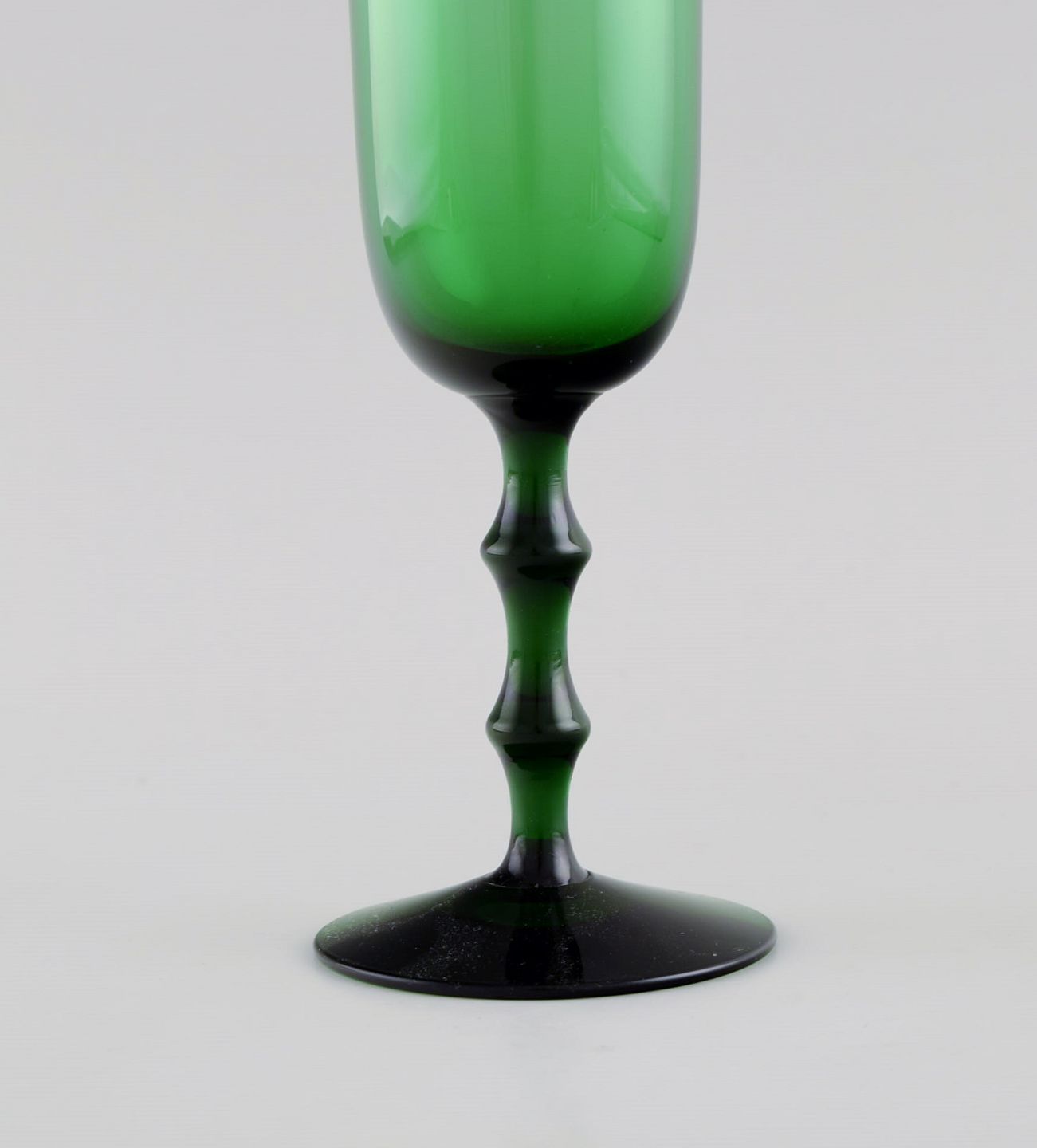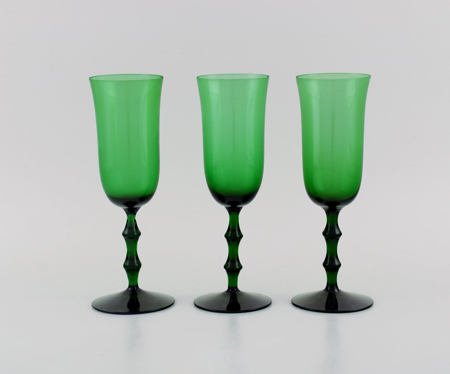 Simon Gate for Orrefors. Tre Salut champagneglas i grønt mundblæst kunstglas. Svensk design, 1920/30'erne. Måler: 18 x 5,7 cm. I perfekt stand.