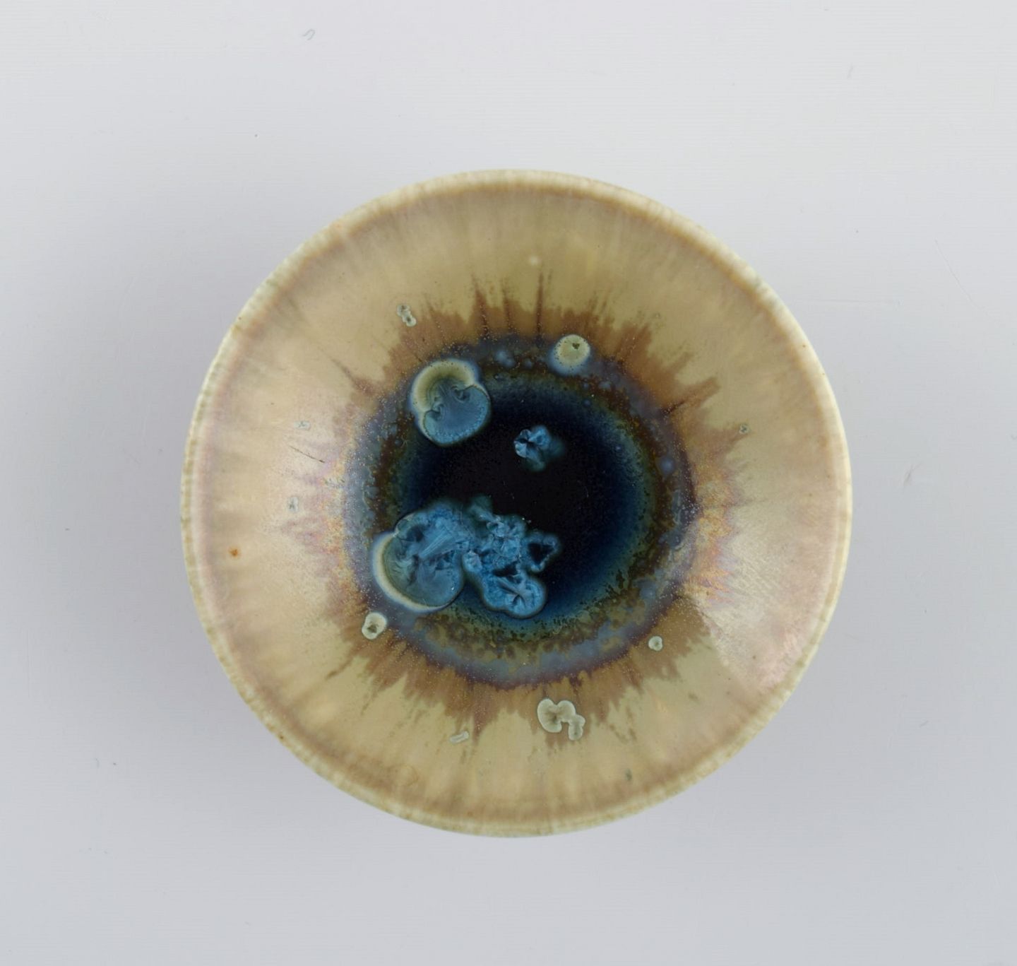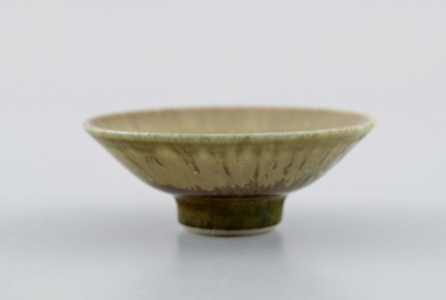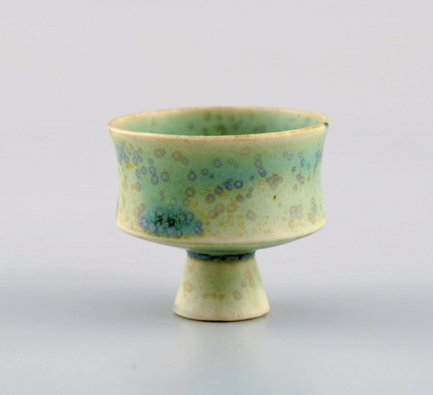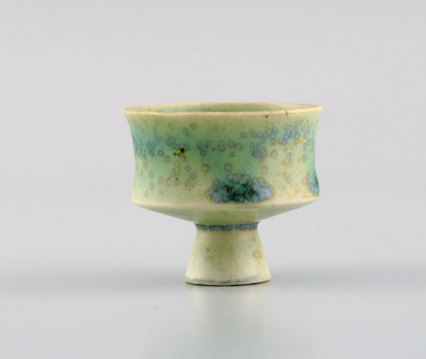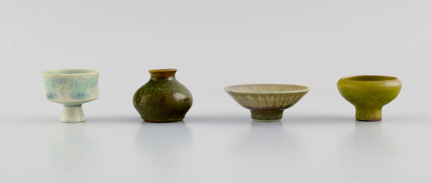 Svensk studiokeramik. Fire unika miniaturevaser i glaseret stentøj. Sent 1900-tallet. Skålen måler: 5,7 x 2,3 cm. Største vase måler: 37 x 3,5 cm. I flot stand. Stemplet.