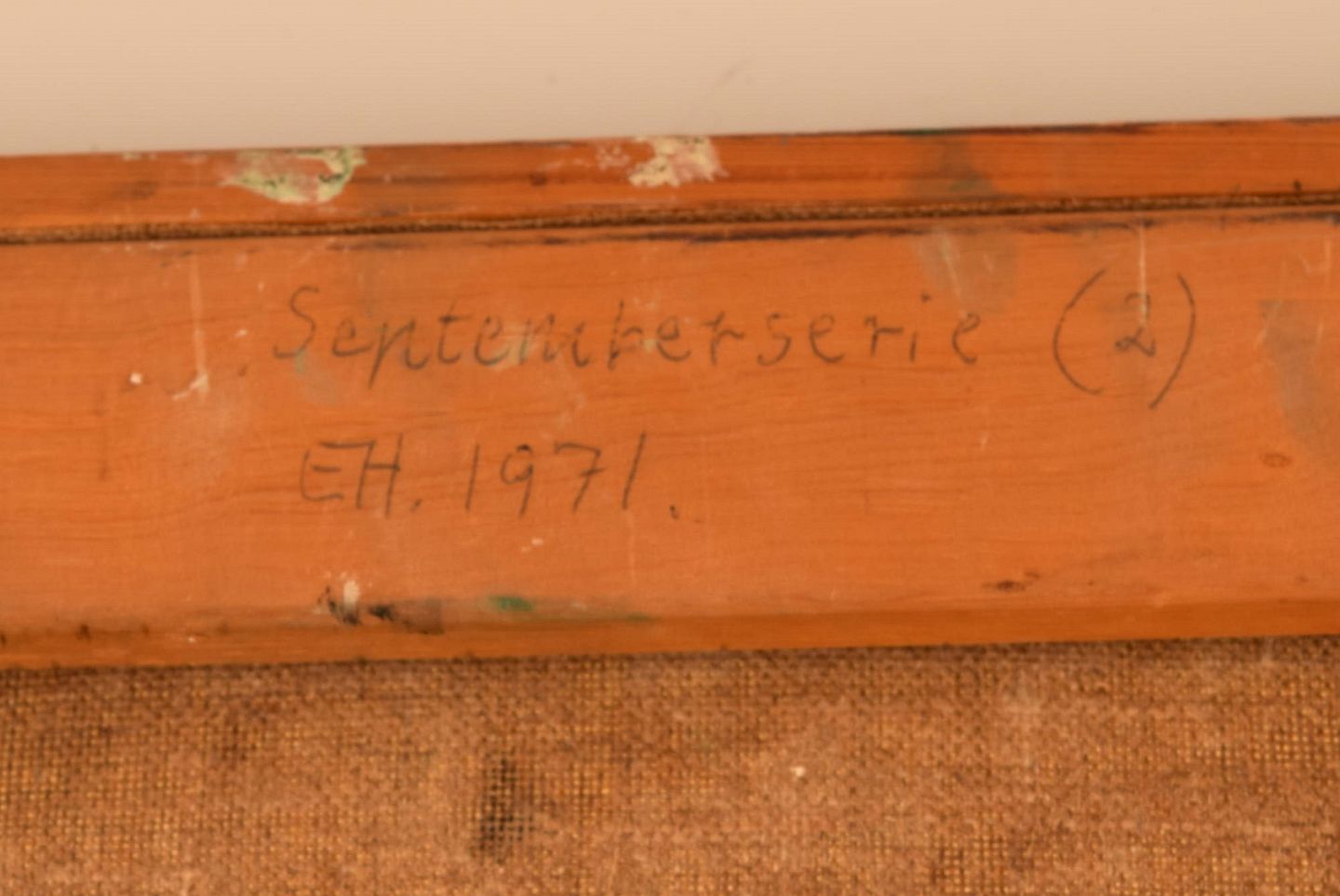 Else Hyldahl (b. 1930), Danish artist. Oil on canvas. "September Series". Dated 1971. The canvas measures: 73 x 60.5 cm. The frame measures: 0.5 cm. In excellent condition. Signed and dated