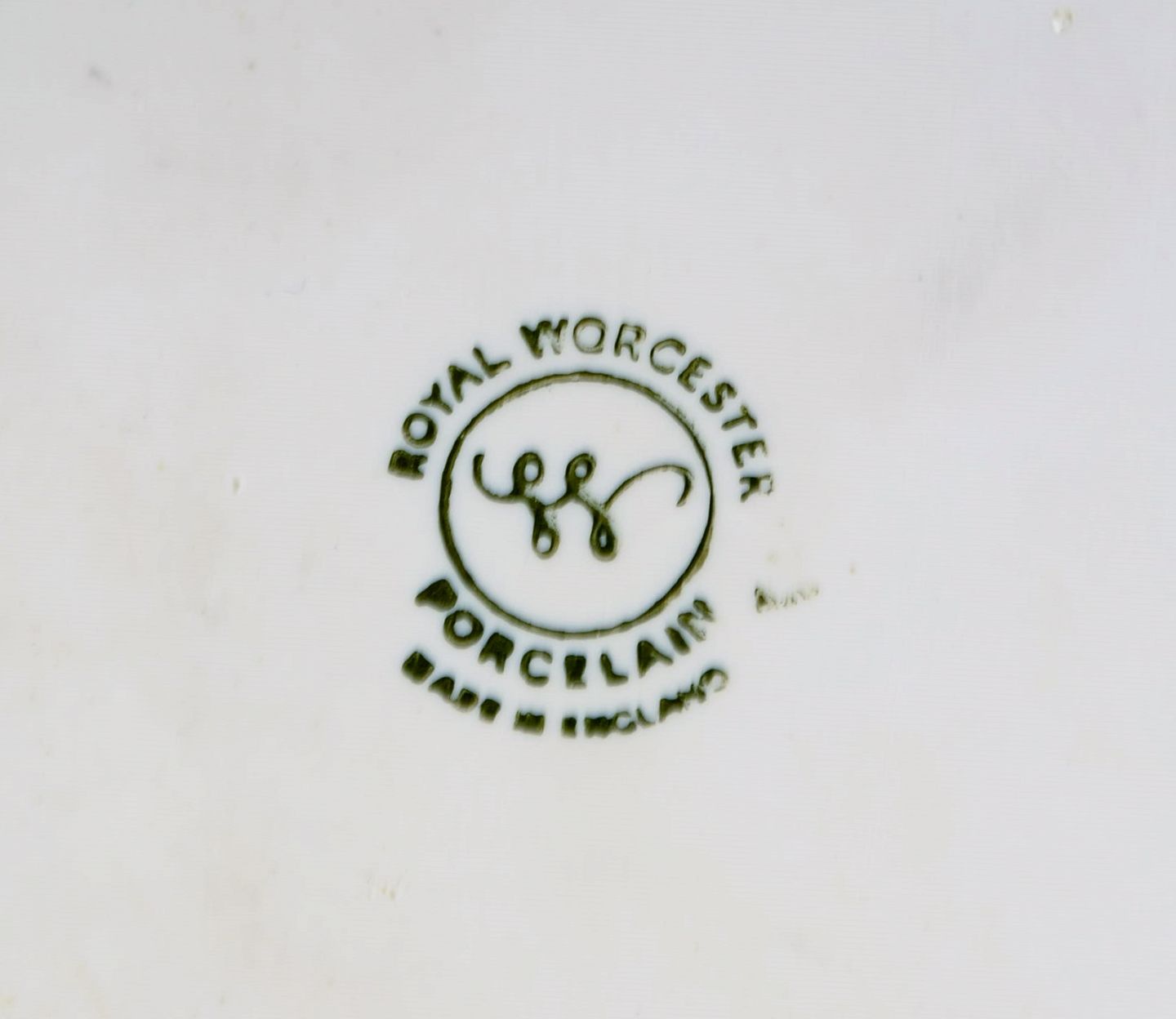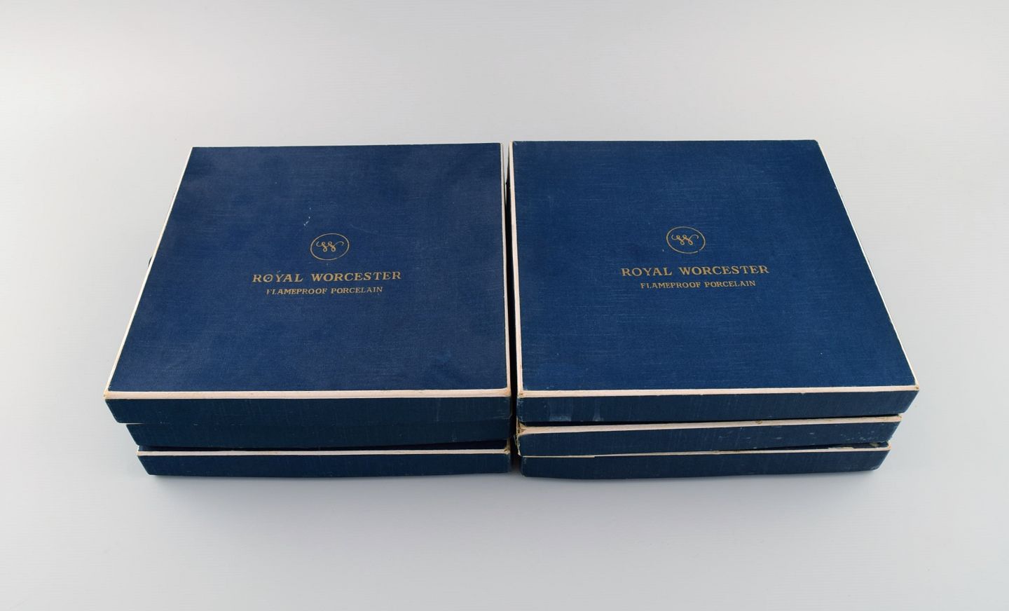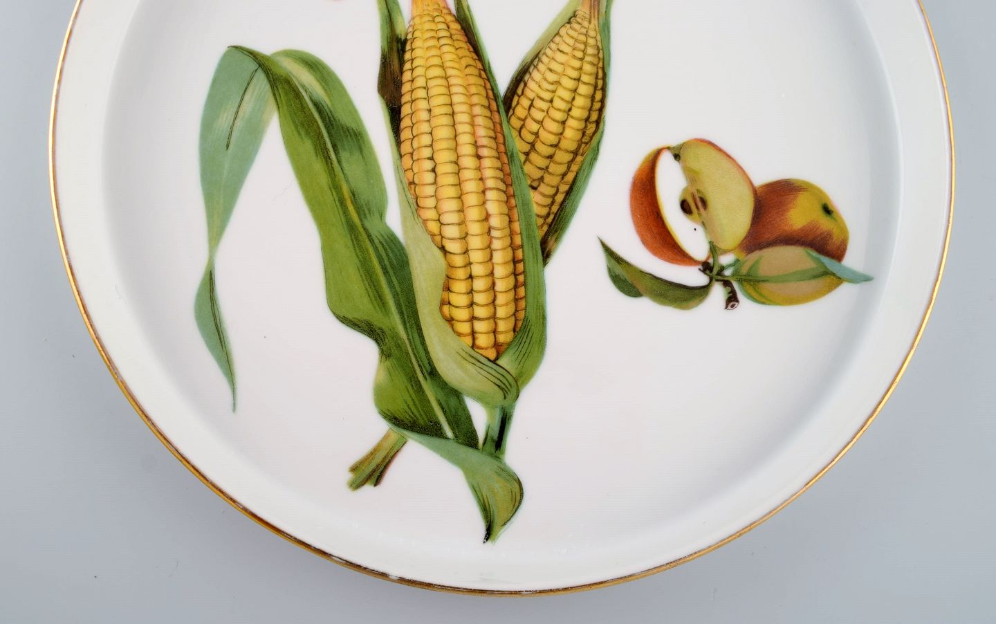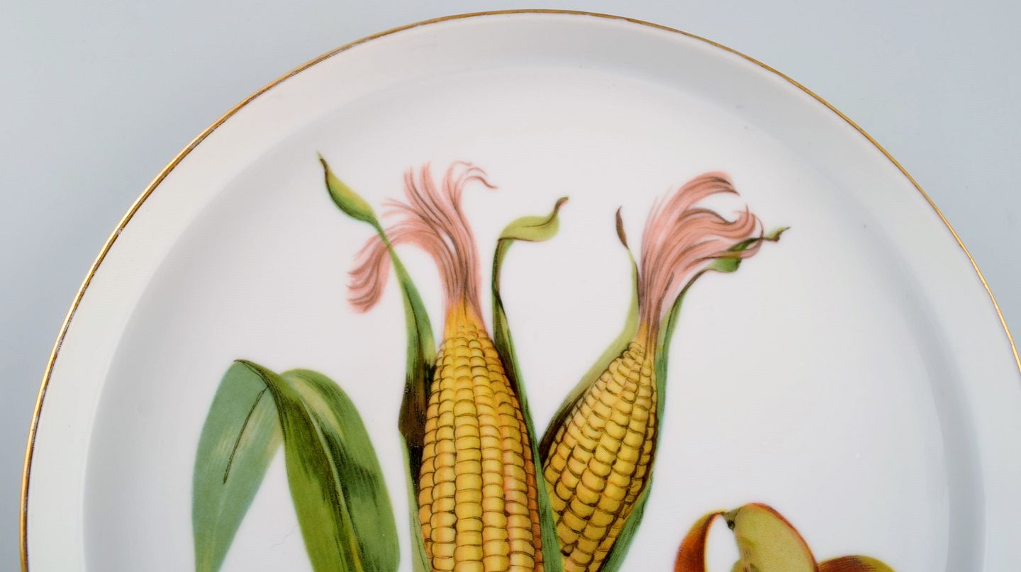 Royal Worcester, England. Seks runde porcelænsfade dekoreret med majskolber, æbler og guldkant. 1960'erne. Måler: 21,5 x 2 cm. I flot stand. Stemplet.