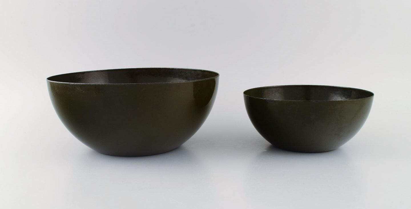 Kaj Franck (1911-1989) for Finel. To mørkegrønne skåle i emaljeret metal. Finsk design, midt 1900-tallet.