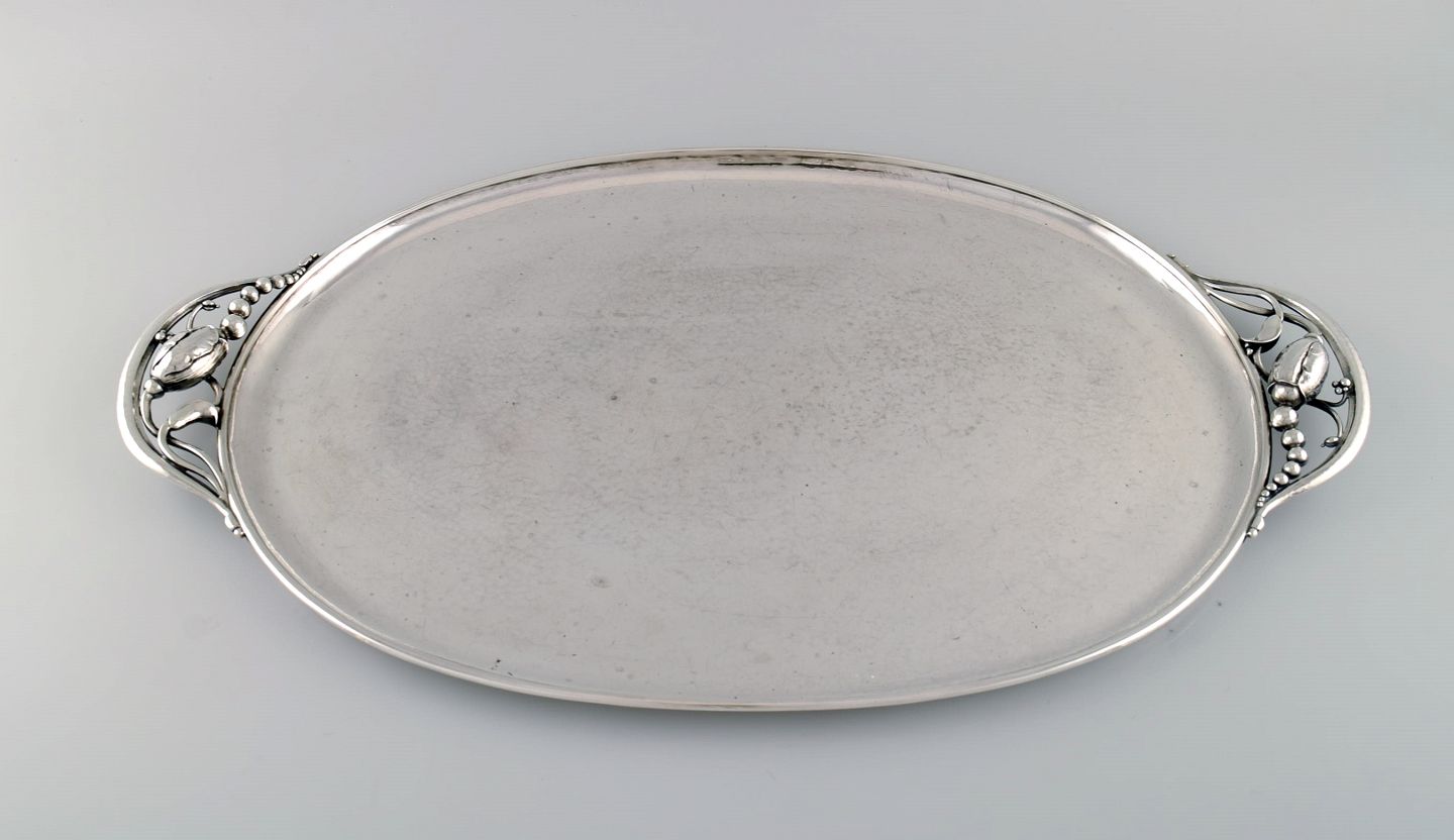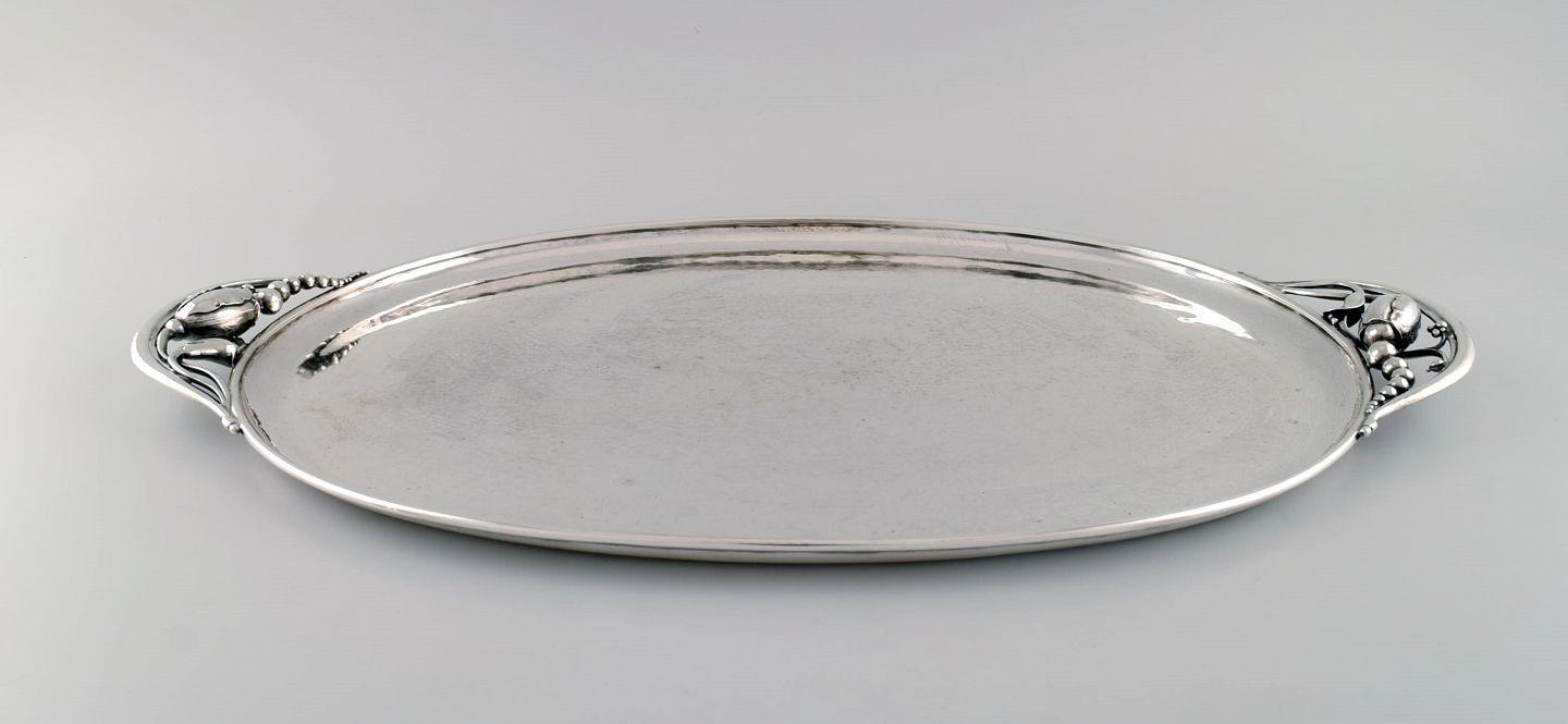 Kolossal Georg Jensen Magnolia serveringbakke i hammerslået sterlingsølv. Model 2E. Dateret 1915-1930.