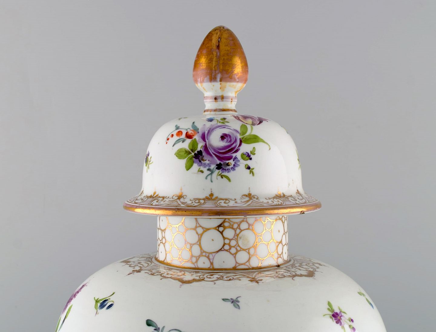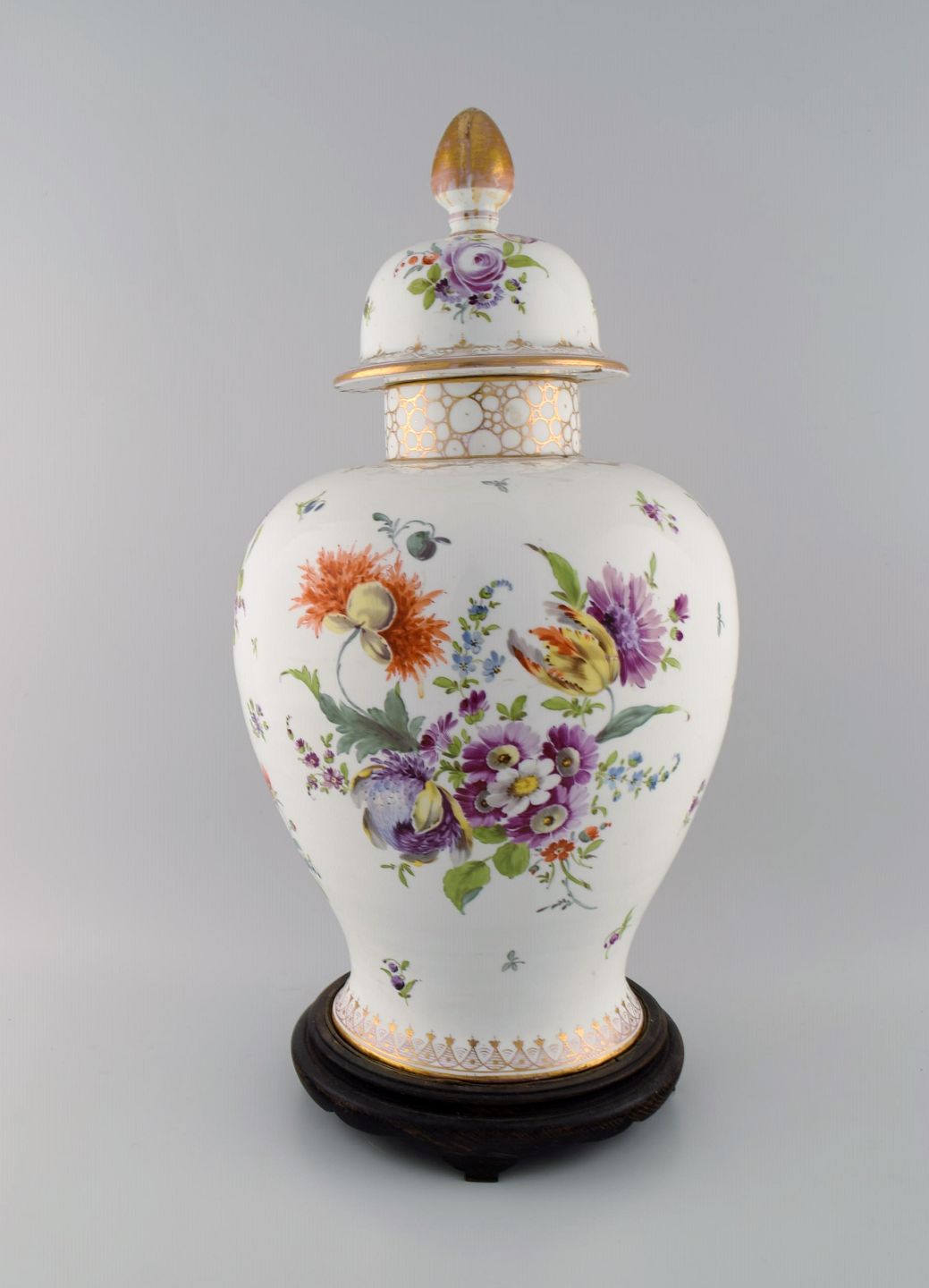 To kolossale Dresden lågbojaner i porcelæn på træstand. Håndmalede blomster og gulddekoration. 1800-tallet. Måler: 54 x 27 cm (inkl træstand). I flot stand. Én lille reparation på halsen. Signeret.