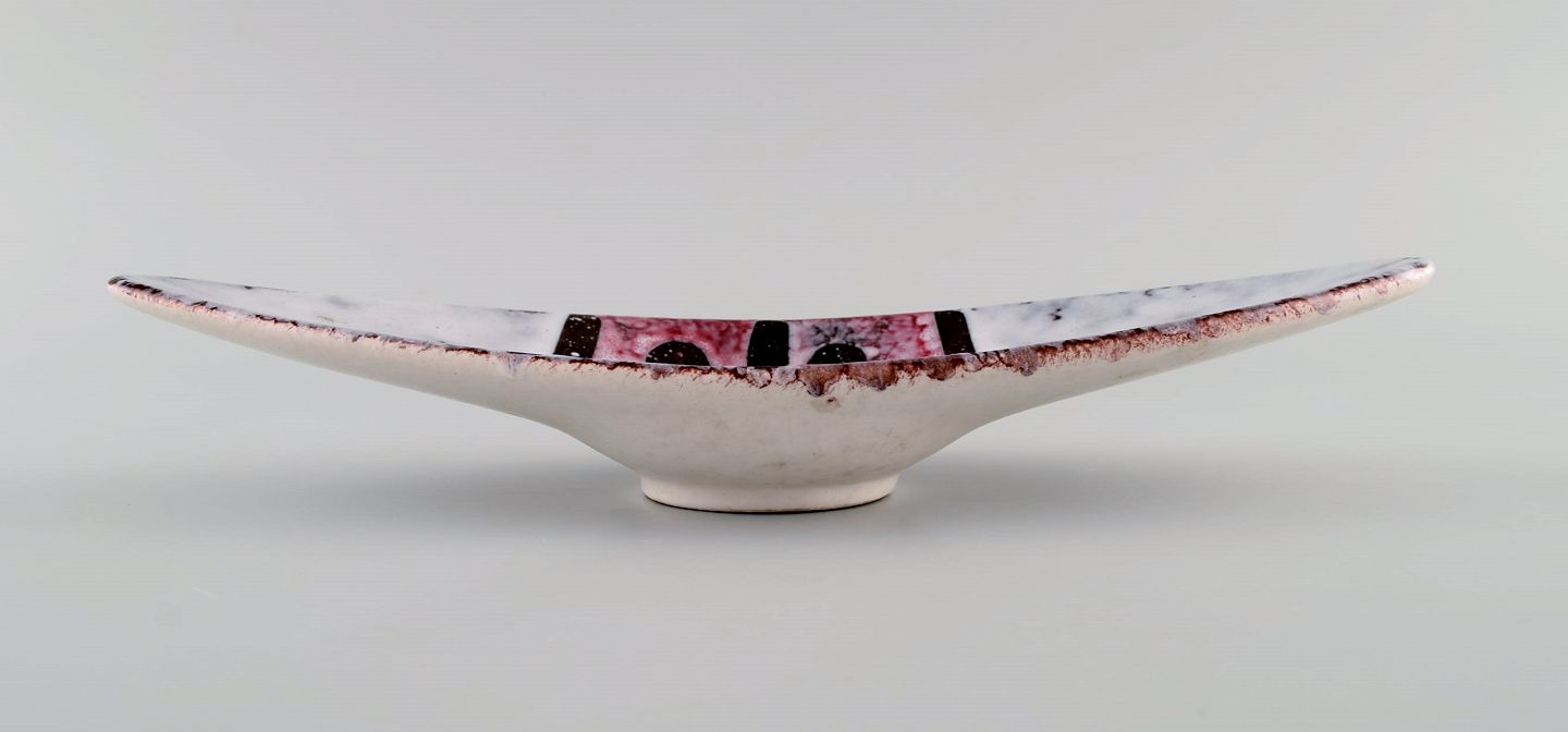 Europæisk studiokeramiker. Aflang unika skål / fad i glaseret keramik. Mønstret design i lyserøde, hvide og brune nuancer. 1960/70'erne.