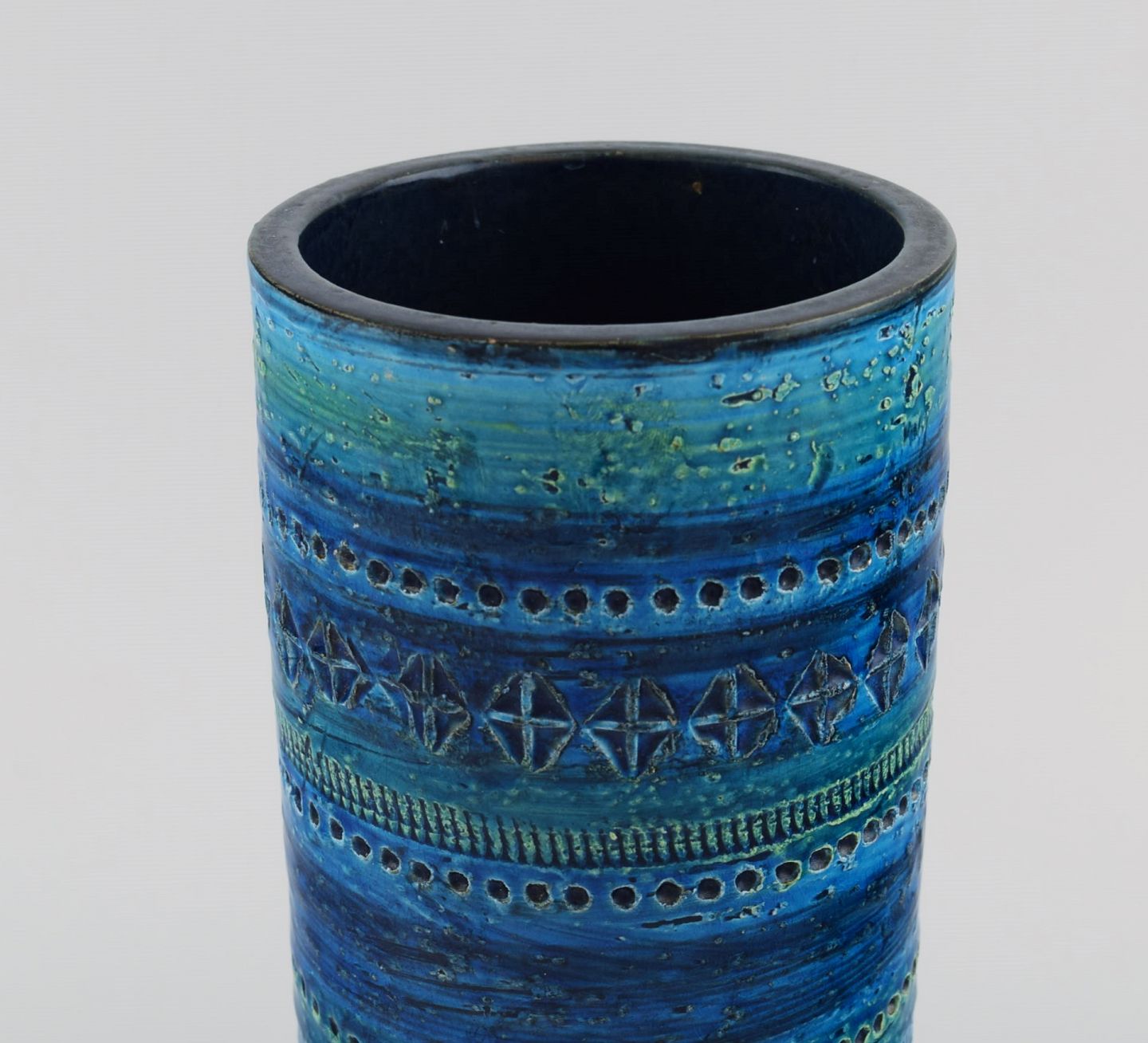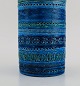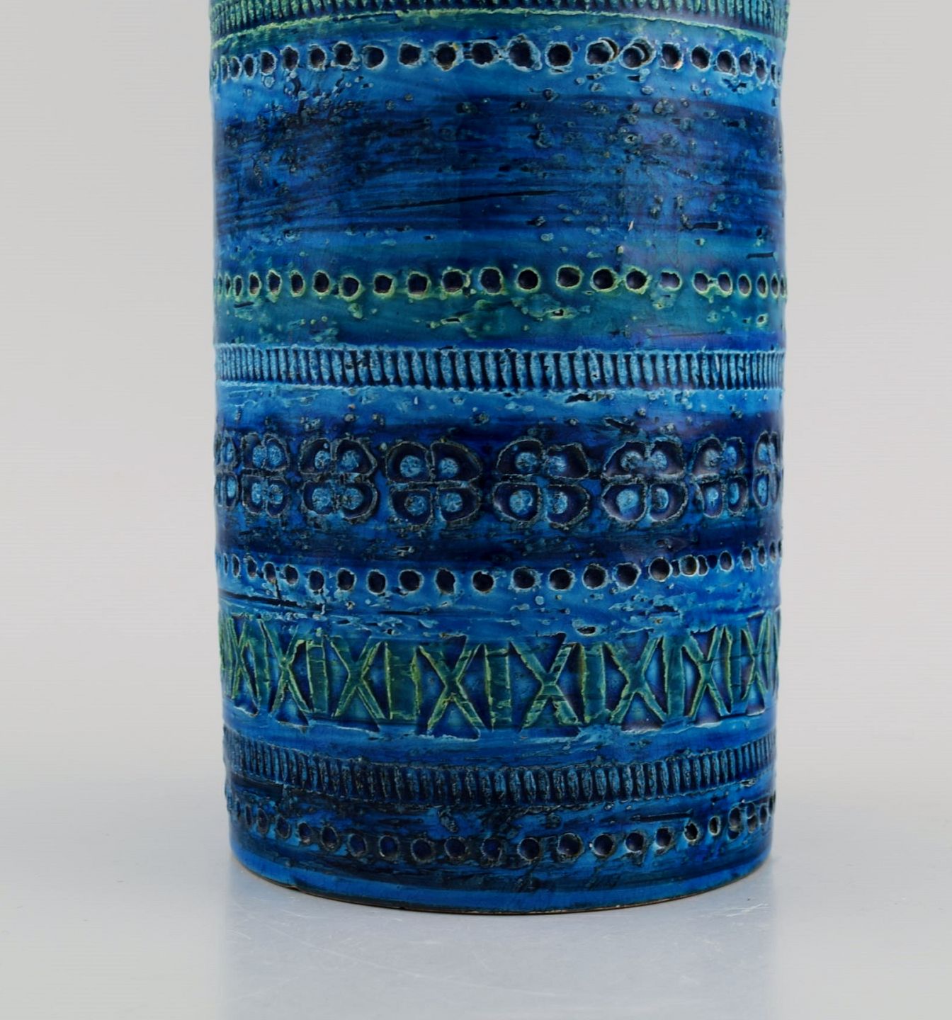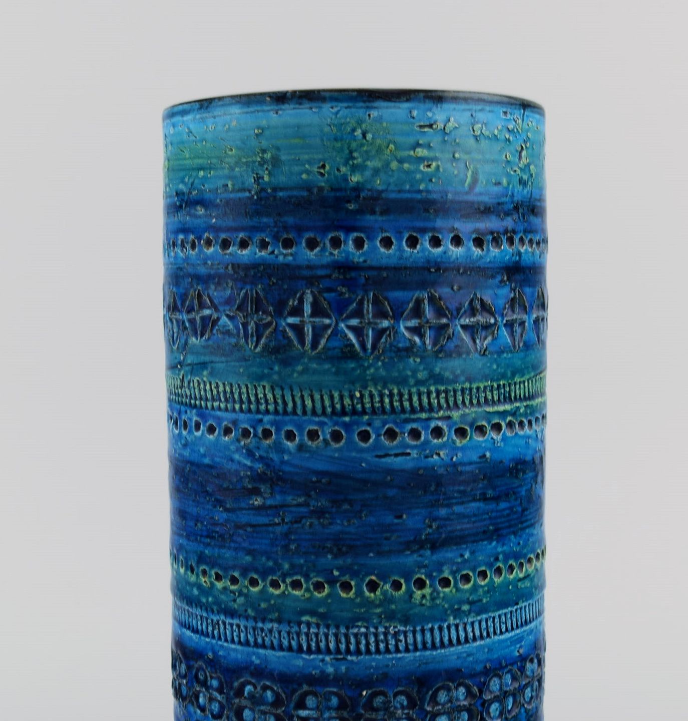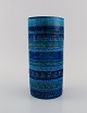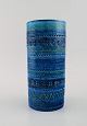 Aldo Londi for Bitossi. Cylindrical vase in Rimini-blue glazed ceramics with geometric patterns. 1960s. Measures: 22.5 x 11 cm. In excellent condition. Stamped.