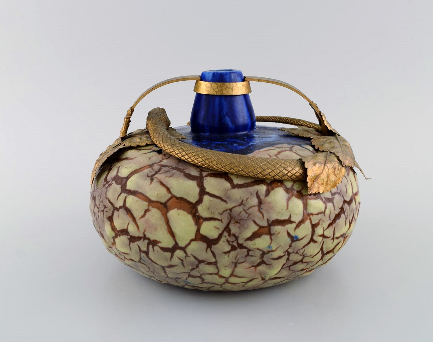 Louis Dage (1885 - 1961), fransk keramiker. Art nouveau vase i glaseret keramik med bronze montering formet som slange og bladværk. 1930'erne. Måler: 21,5 x 15 cm. I flot stand. Signeret.