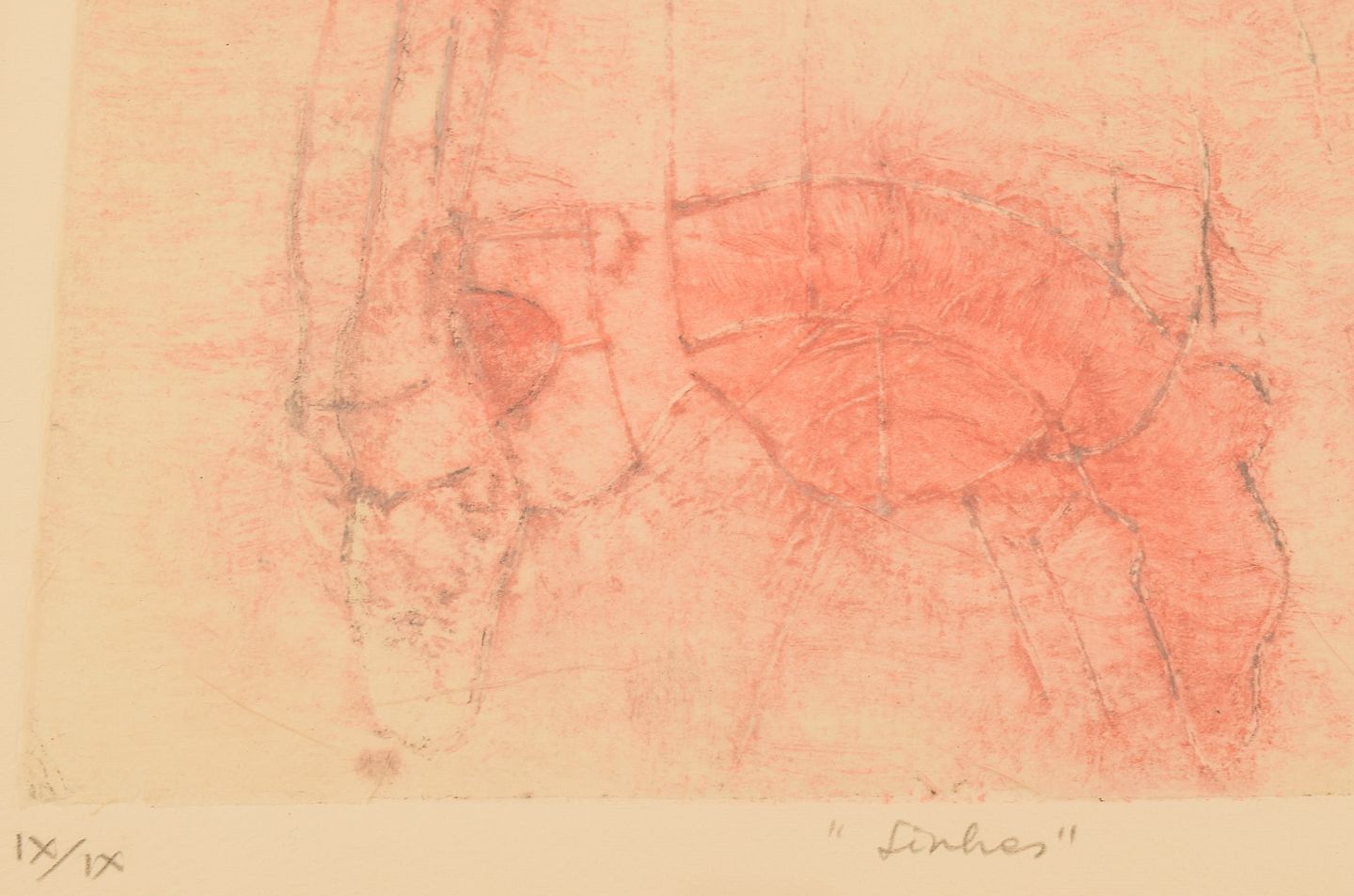 Selma Daffre (f. 1951), brasiliansk kunstner. Collografi på papir. "Linhas". Nummereret 9/9. Dateret 1997.