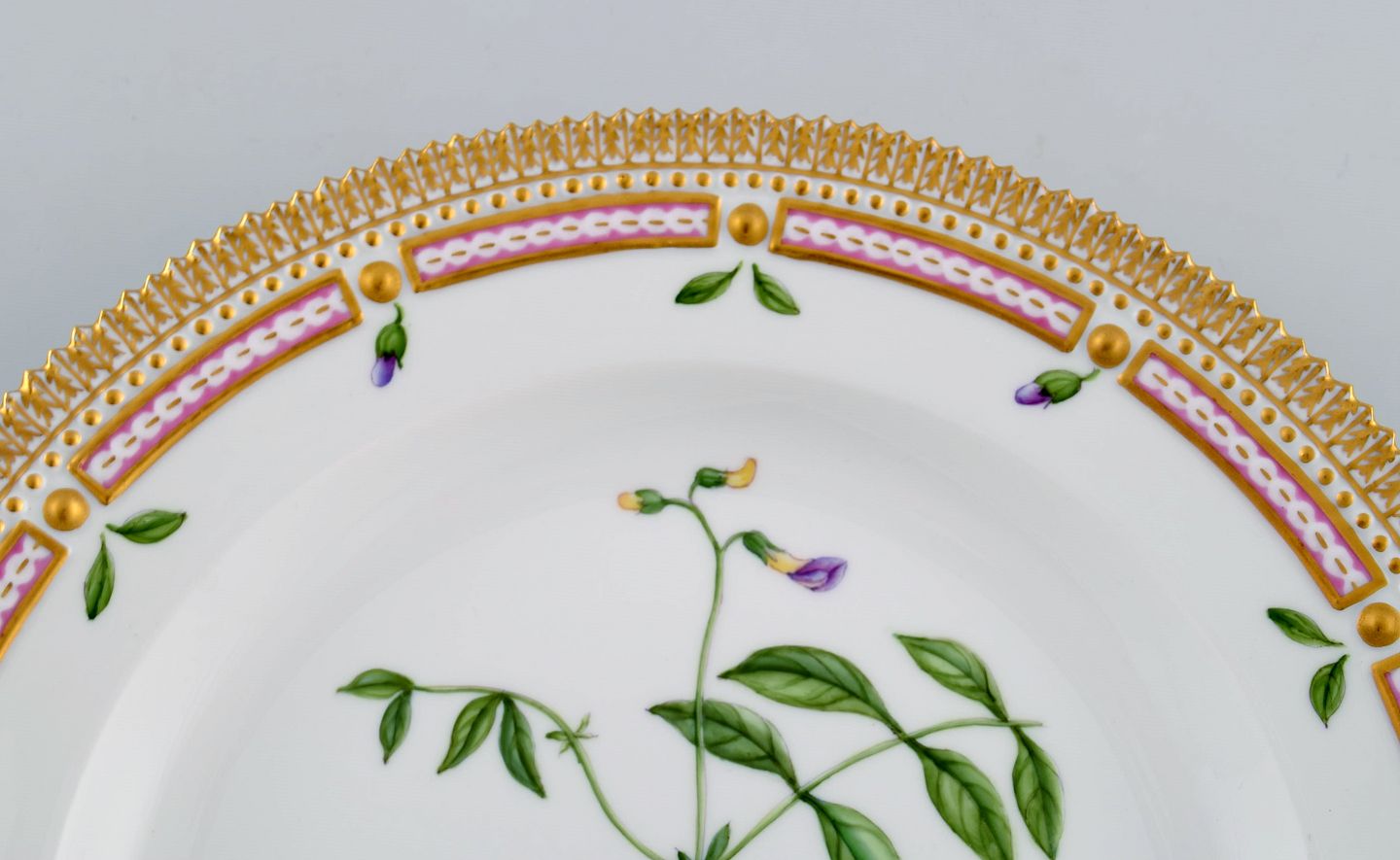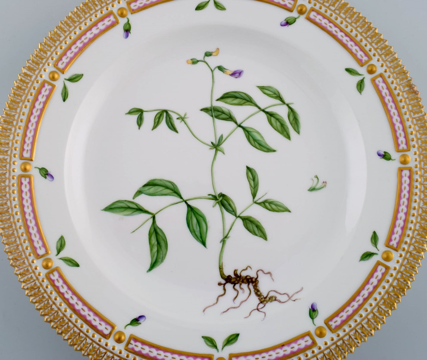 Royal Copenhagen Flora Danica middagstallerken i håndmalet porcelæn med blomster og gulddekoration. Modelnummer 20/3549.