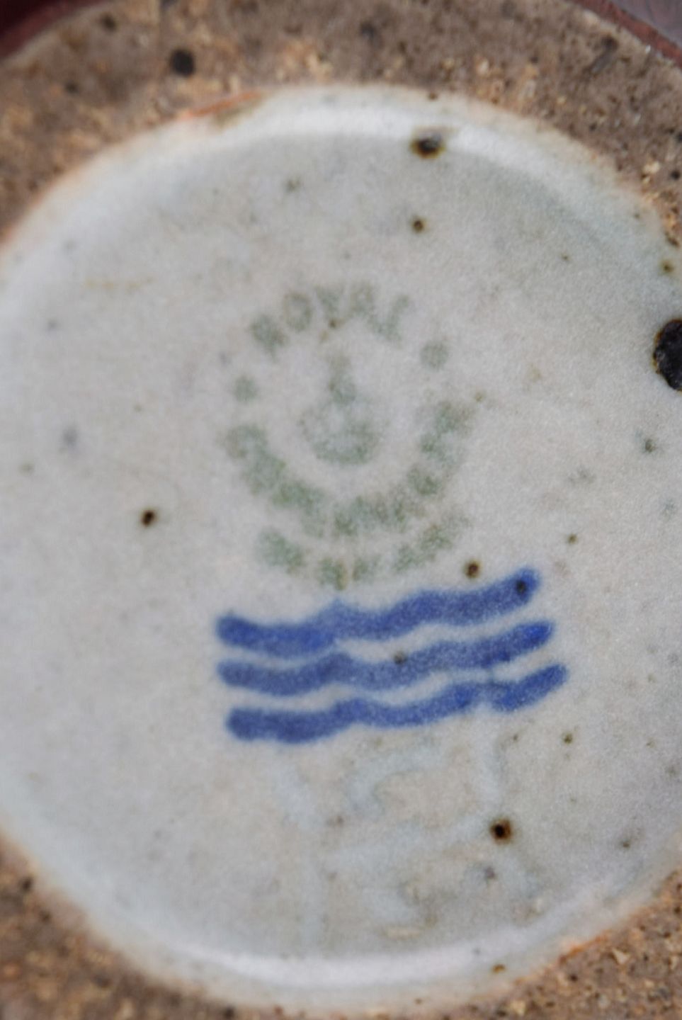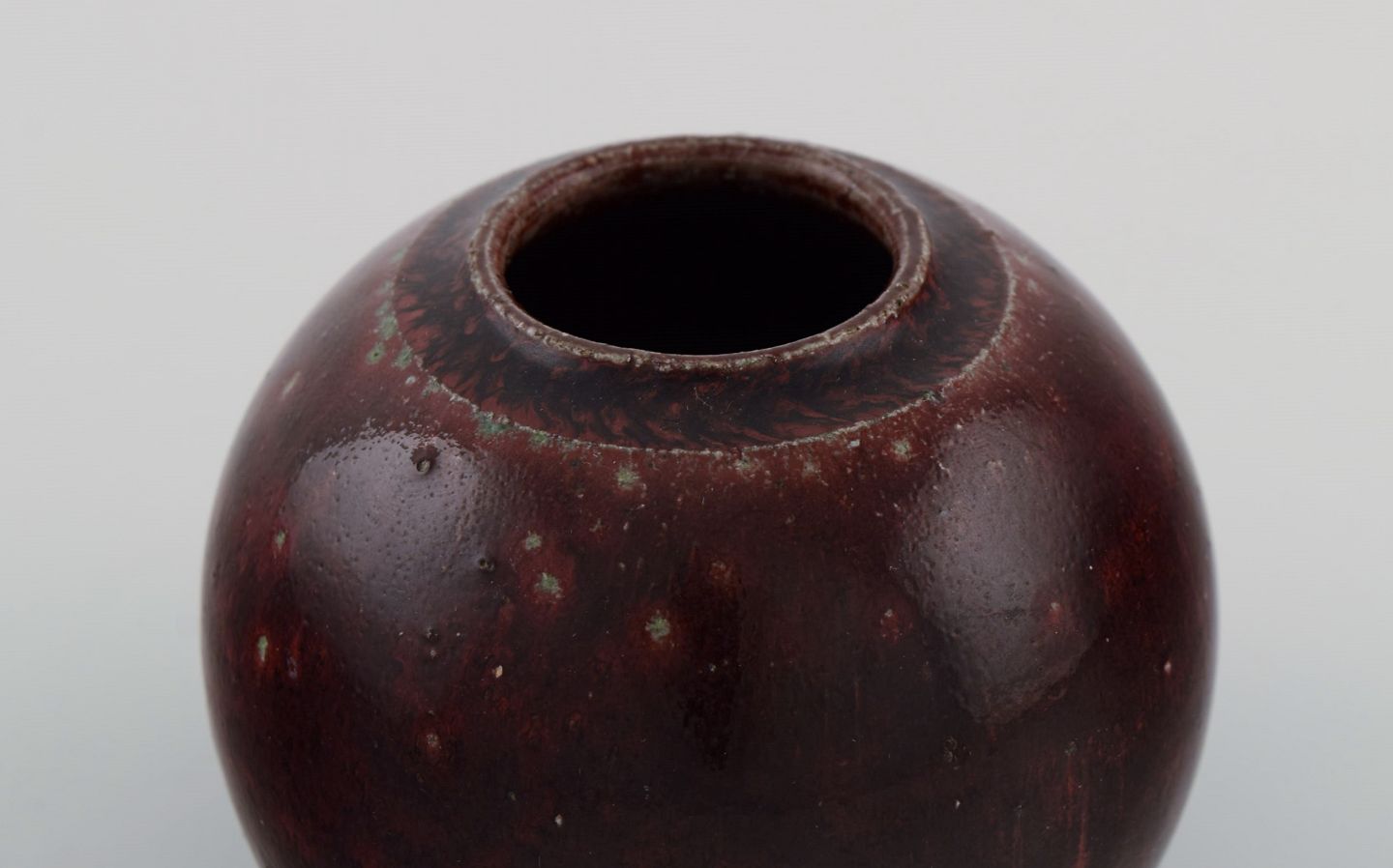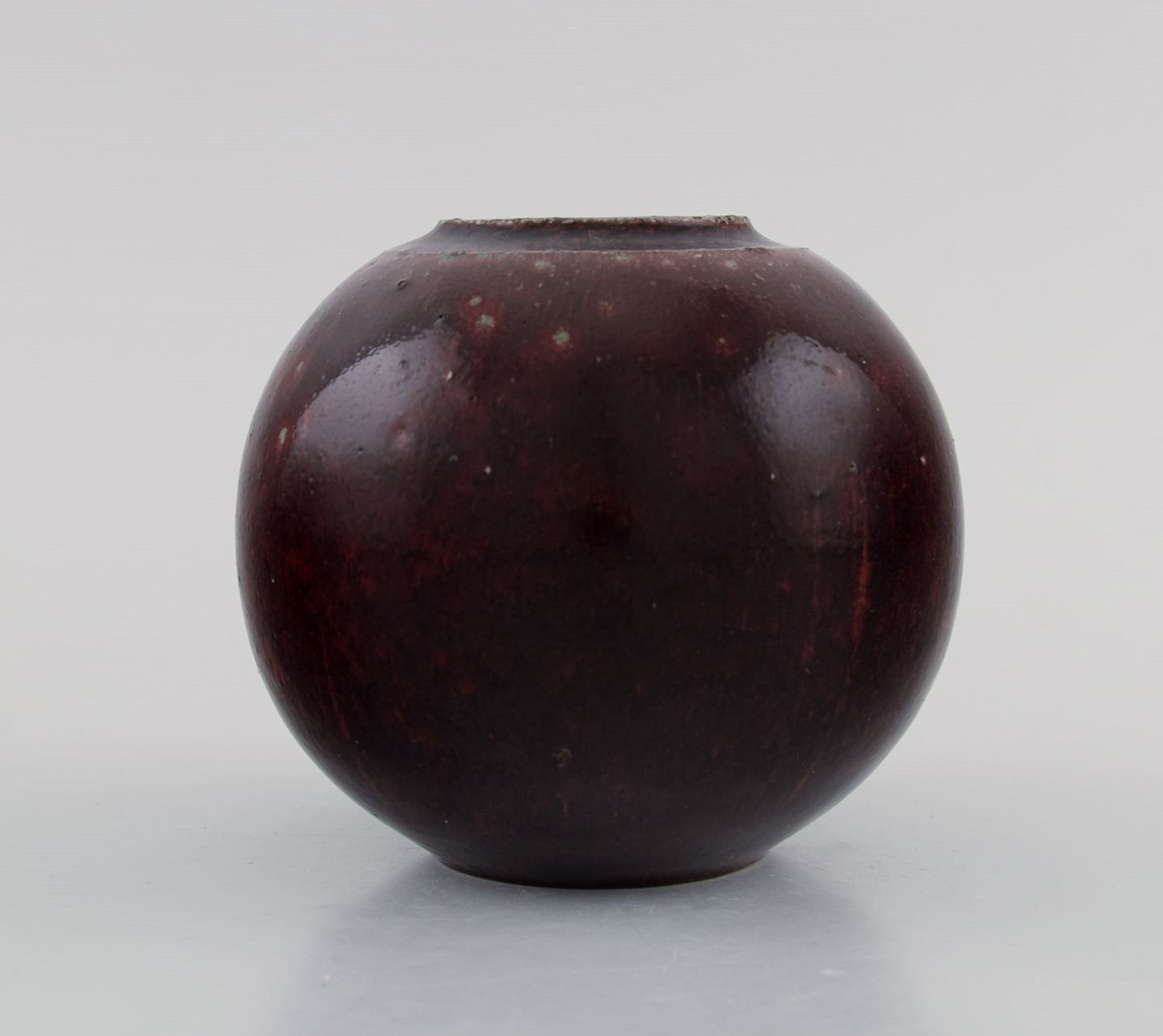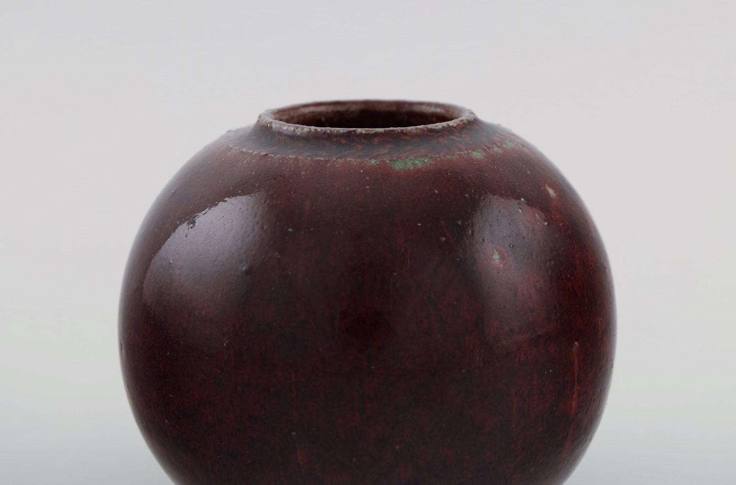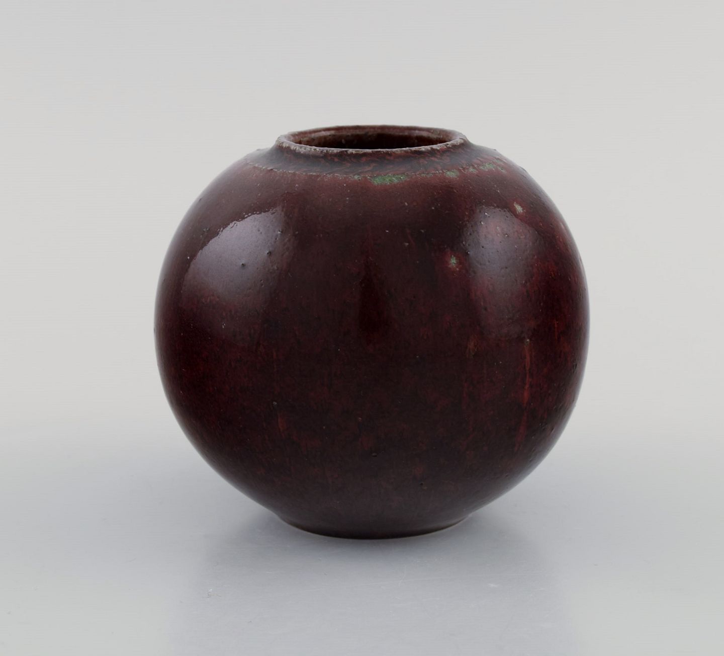 Rund Royal Copenhagen vase i glaseret keramik. Smuk okseblodsglasur. Midt 1900-tallet.