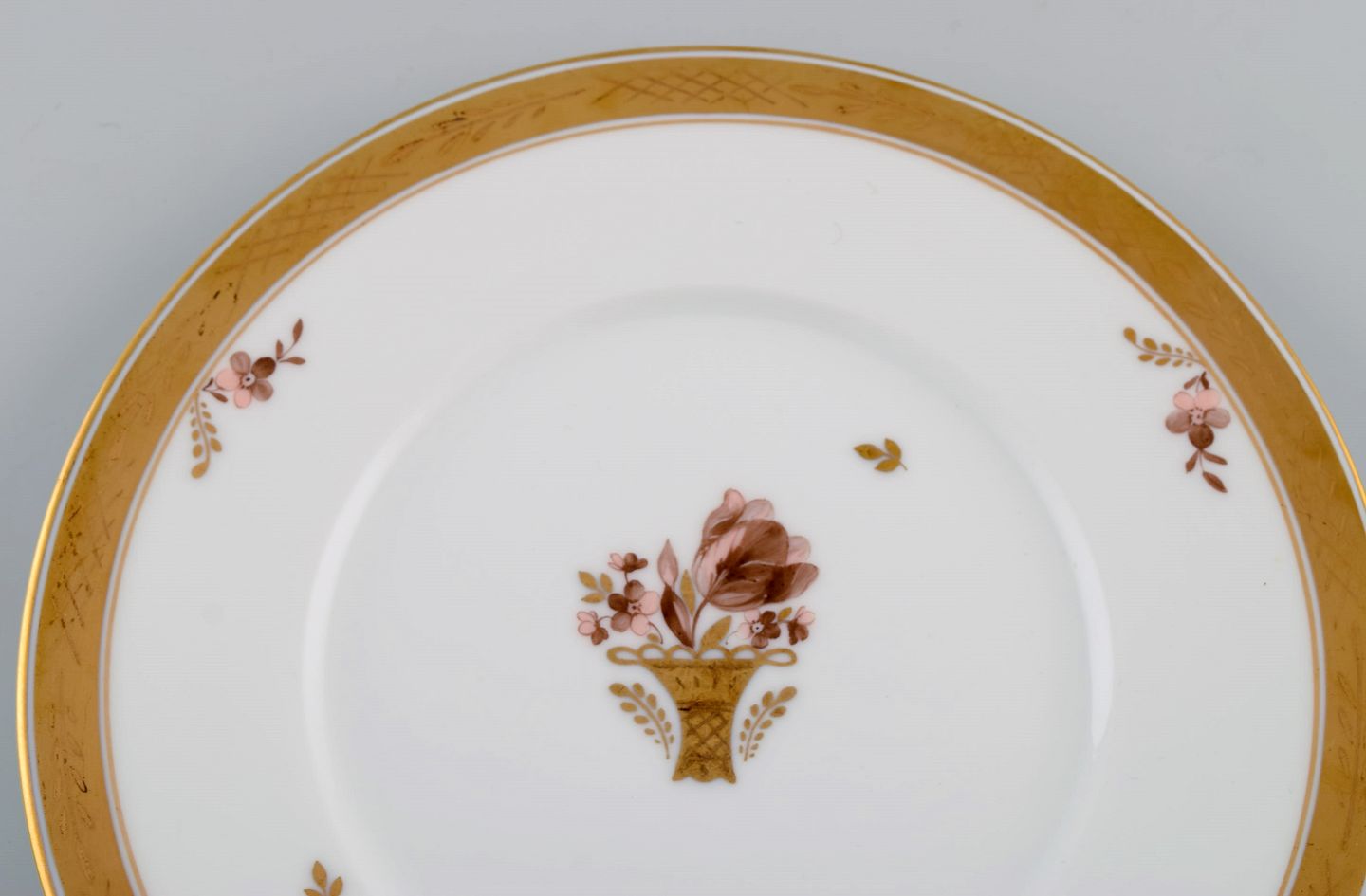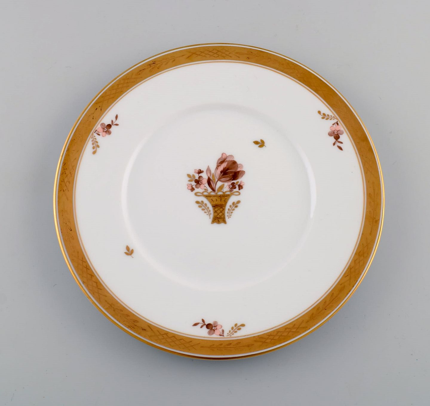 Otte Royal Copenhagen Guldkurv tallerkener i porcelæn med blomster og gulddekoration. Modelnummer 595/10520. Diameter: 23 cm. I flot stand. Stemplet.