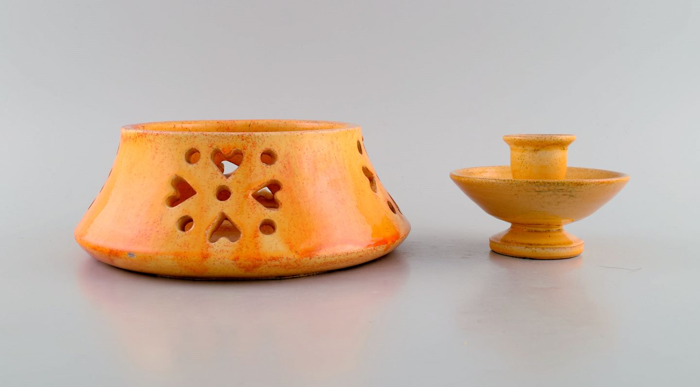 Kähler, HAK. Lysestage med varmer i glaseret stentøj. Smuk orange uranglasur. Midt 1900-tallet. Varmer måler: 20 x 8 cm. Lysestagen måler: 10,5 x 7 cm. I flot stand. Signeret.