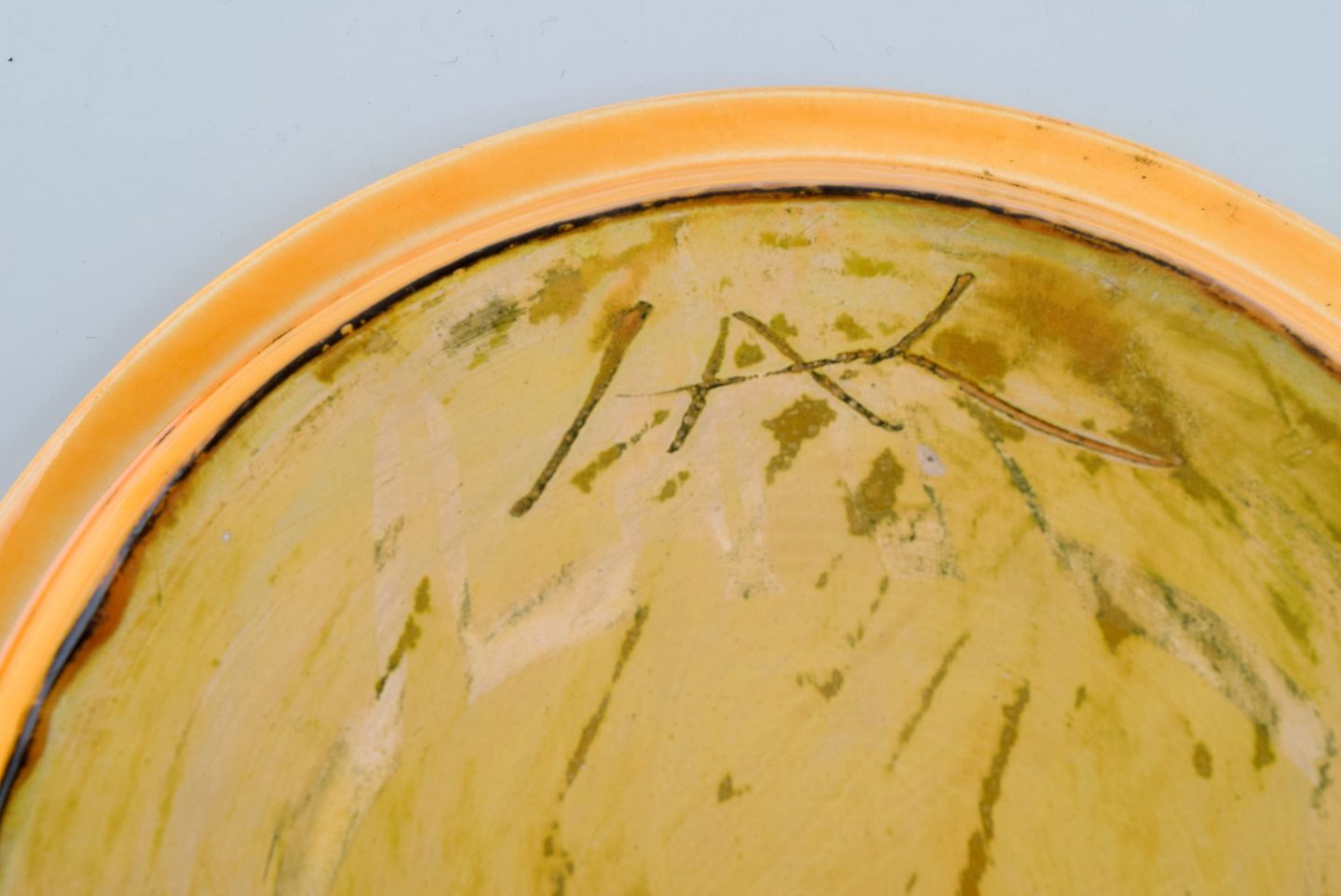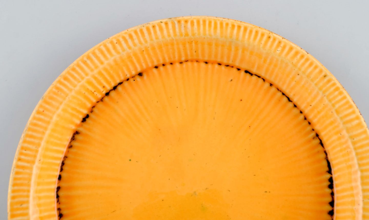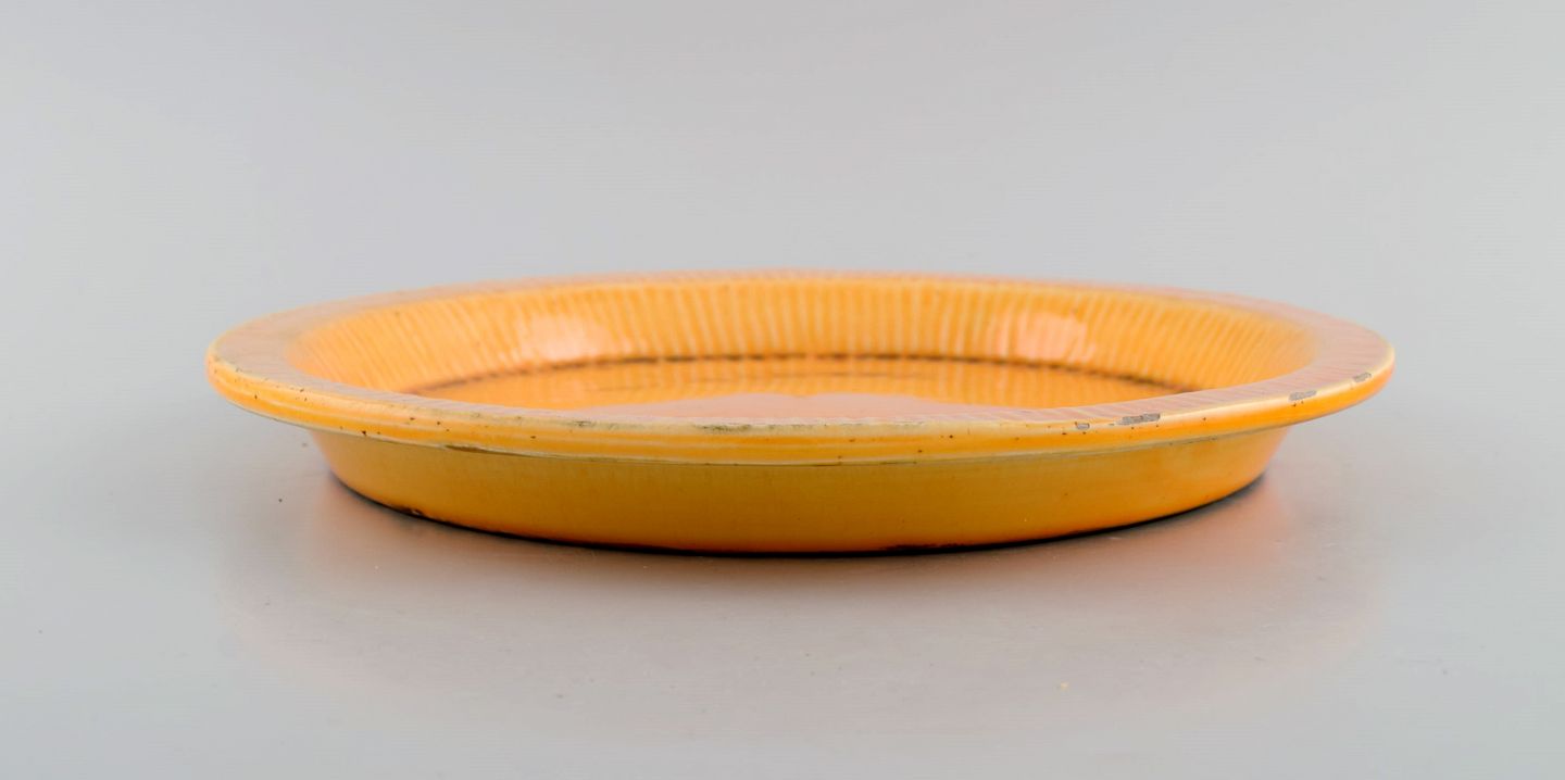 Svend Hammershøi for Kähler, HAK. Riflet fad i glaseret stentøj. Smuk gul uranglasur. 1930/40'erne. Måler: 25,5 x 2,5 cm. Signeret. I flot stand. Enkelte glasur afskalninger langs kanten.