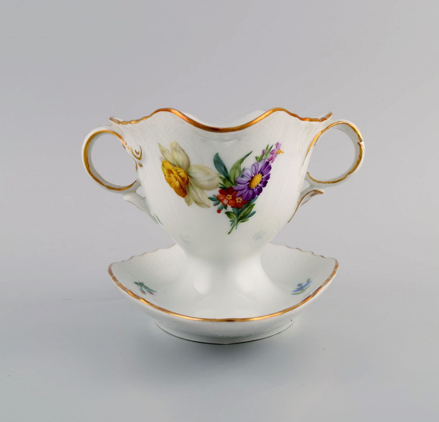 Royal Copenhagen Saksisk Blomst sovsekande i håndmalet porcelæn med blomster og gulddekoration. Modelnummer 493/1650. Tidligt 1900-tallet.