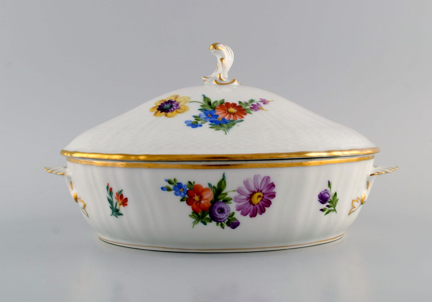 Royal Copenhagen Saksisk Blomst lågterrin i håndmalet porcelæn. Blomster og gulddekoration. Modelnummer 493/1702. Tidligt 1900-tallet. Måler: 27 x 18,5 x 14 cm. I flot stand. Stemplet. 2. sortering.