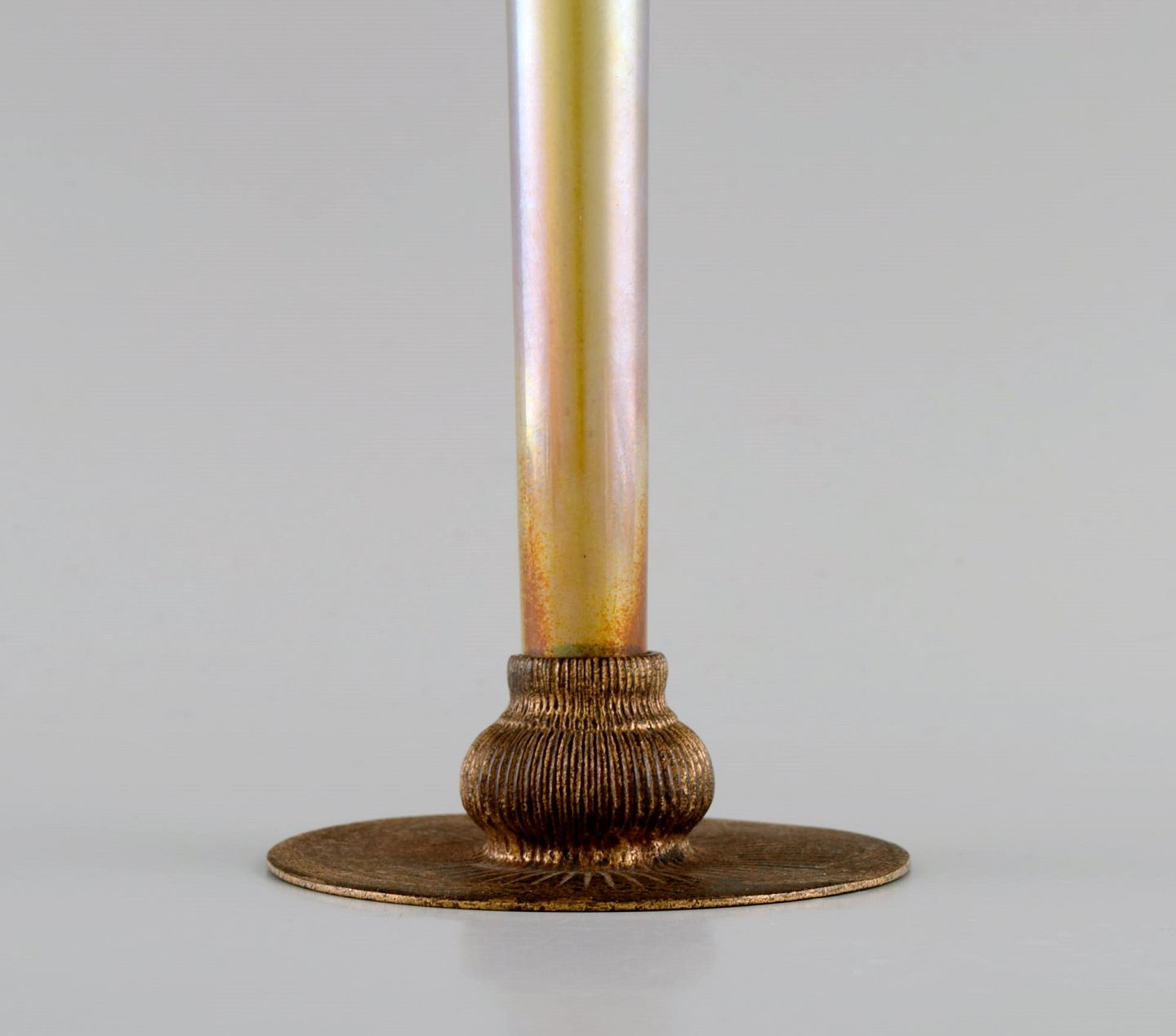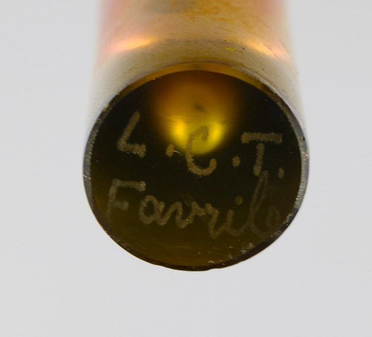 Antik Tiffany Favrile vase i iriserende mundblæst kunstglas med bronzefod. Tidligt 1900-tallet. Måler: 31 x 9,5 cm. I flot stand. Signeret.
