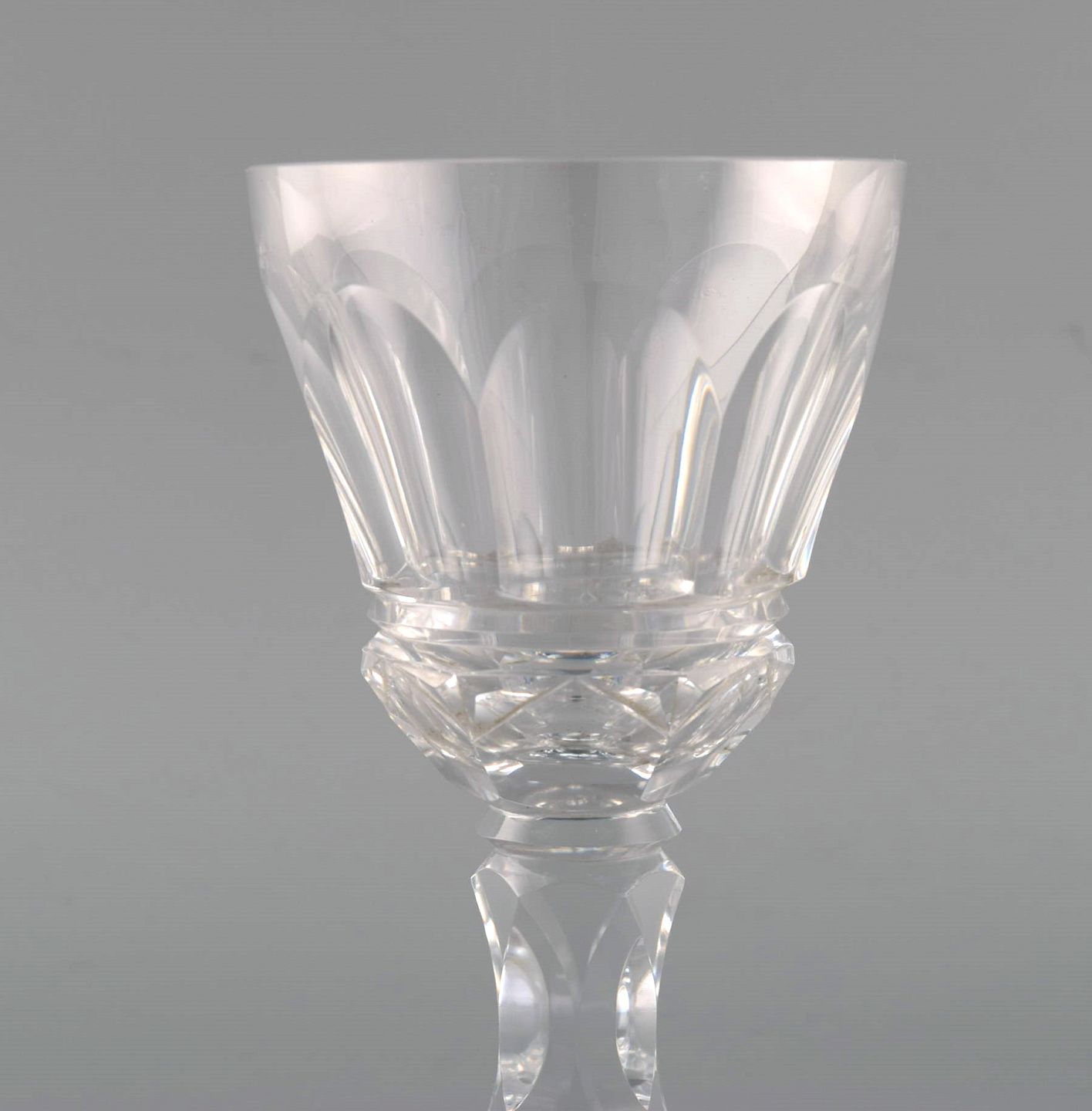 Baccarat, Frankrig. Syv art deco hvidvinsglas i klart mundblæst krystalglas. 1930'erne. Største måler: 14,5 x 8 cm. Mindste måler: 13,5 x 7 cm. Alle glas har et lille skår.