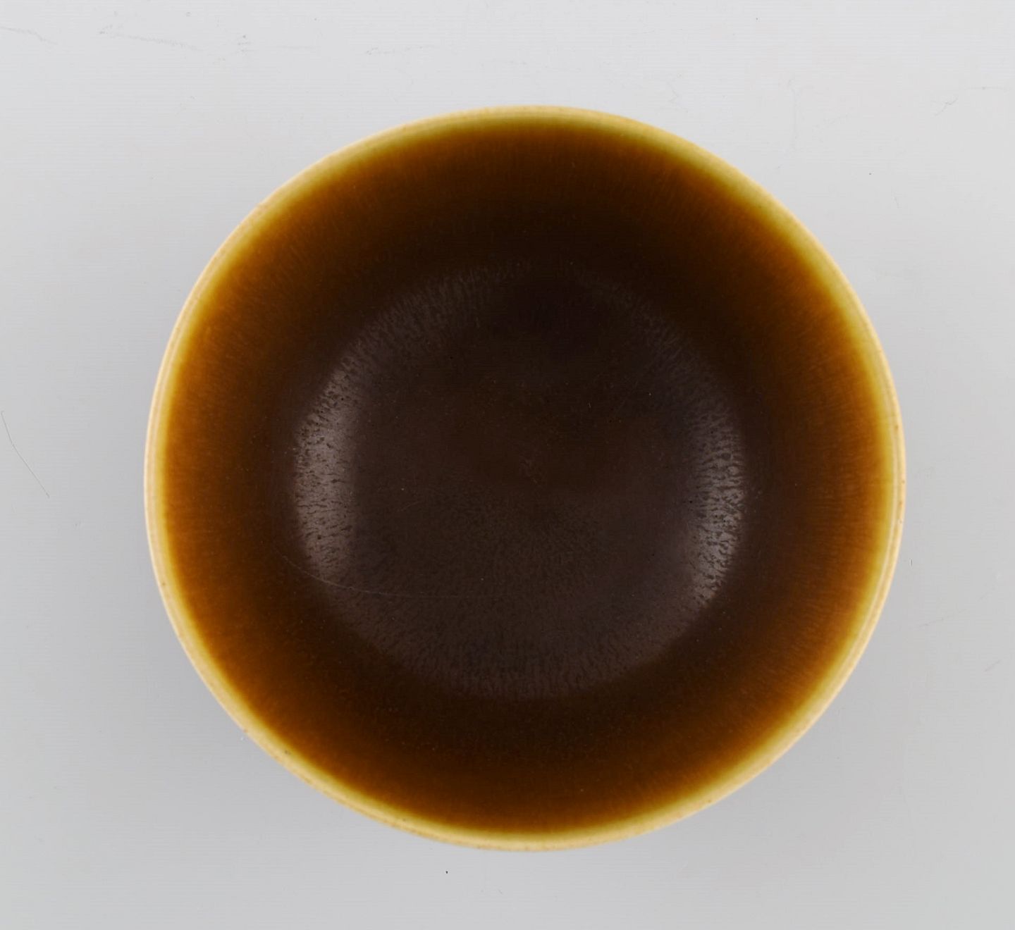 Palshus skål i glaseret keramik. Smuk harepels glasur i lyse brune nuancer. Dateret 1968. Måler: 13,3 x 6 cm. I flot stand. Signeret.