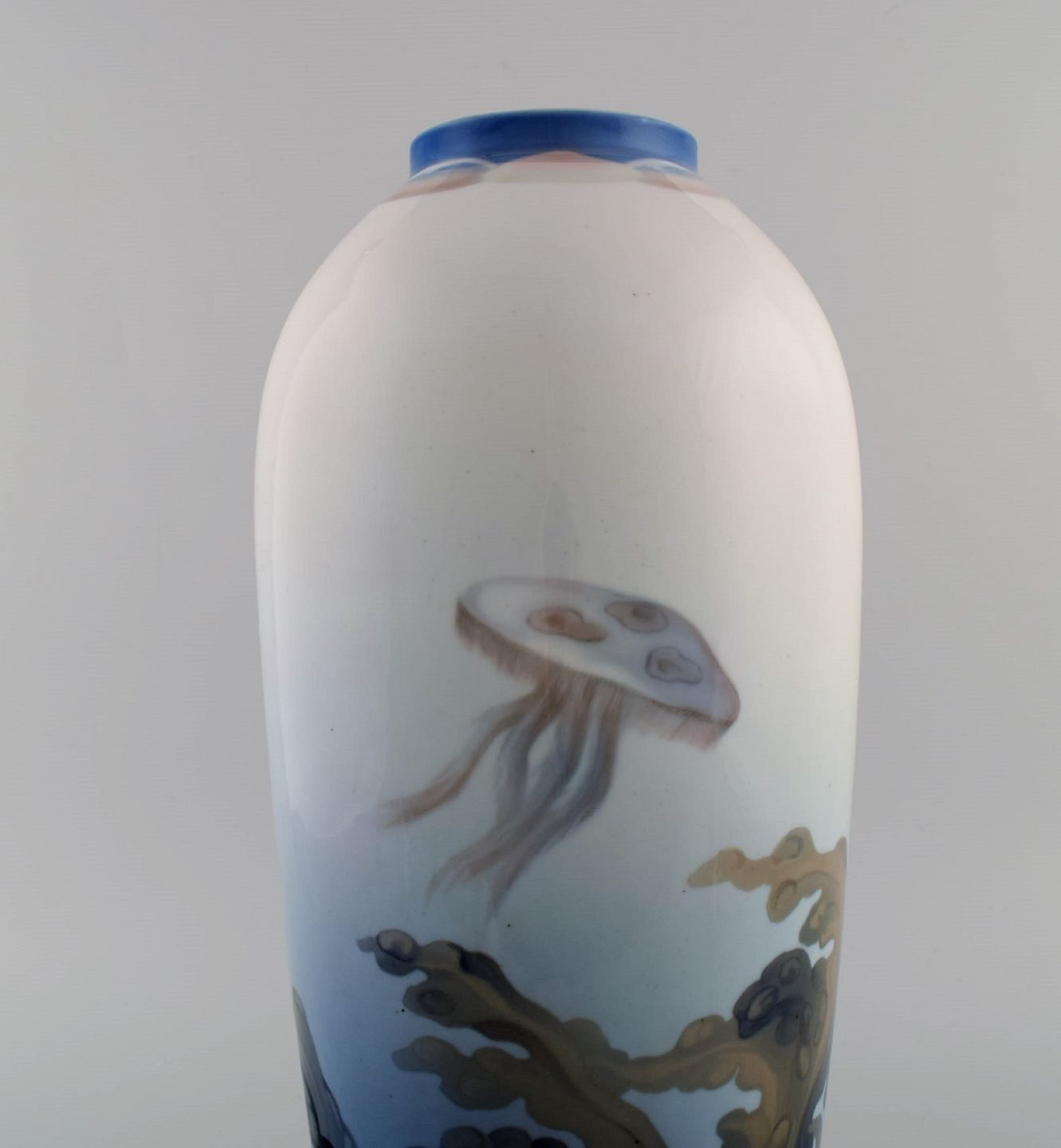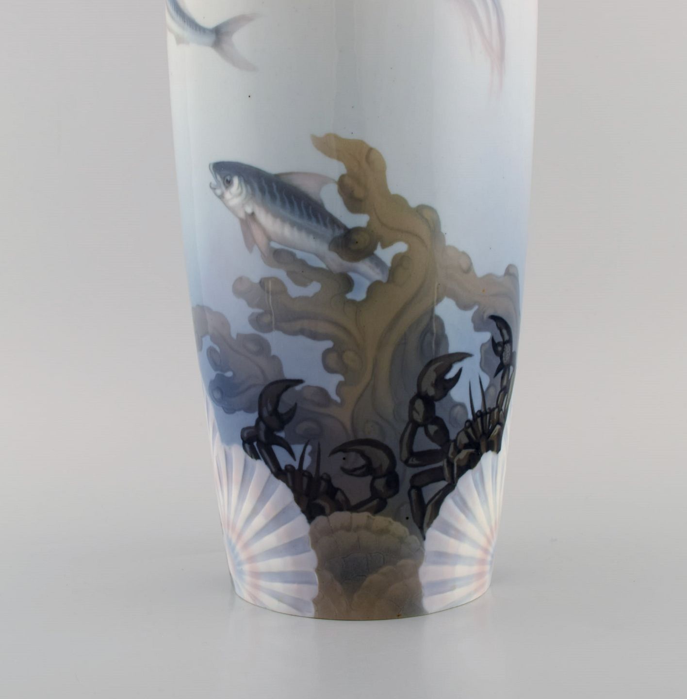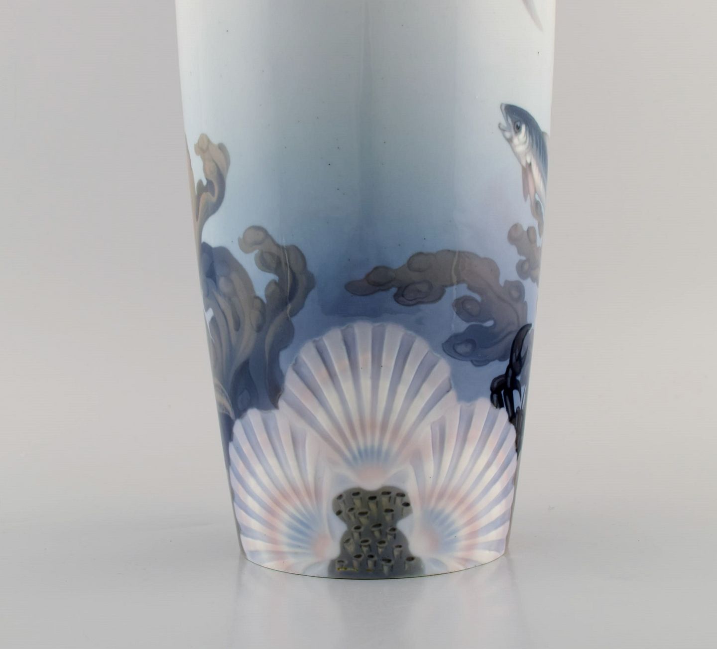 Effie Hegermann-Lindencrone for Bing & Grøndahl. Stor art nouveau porcelænsvase med håndmalede fisk, krabber og vandmænd. Muslingeskaller i relief. Tidligt 1900-tallet.