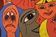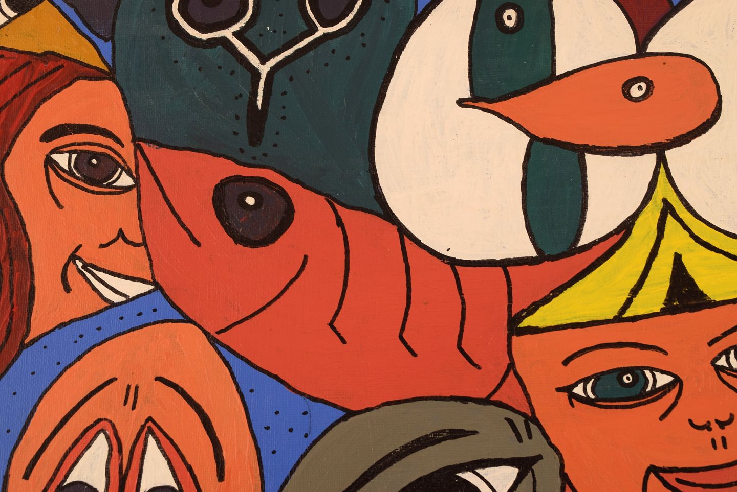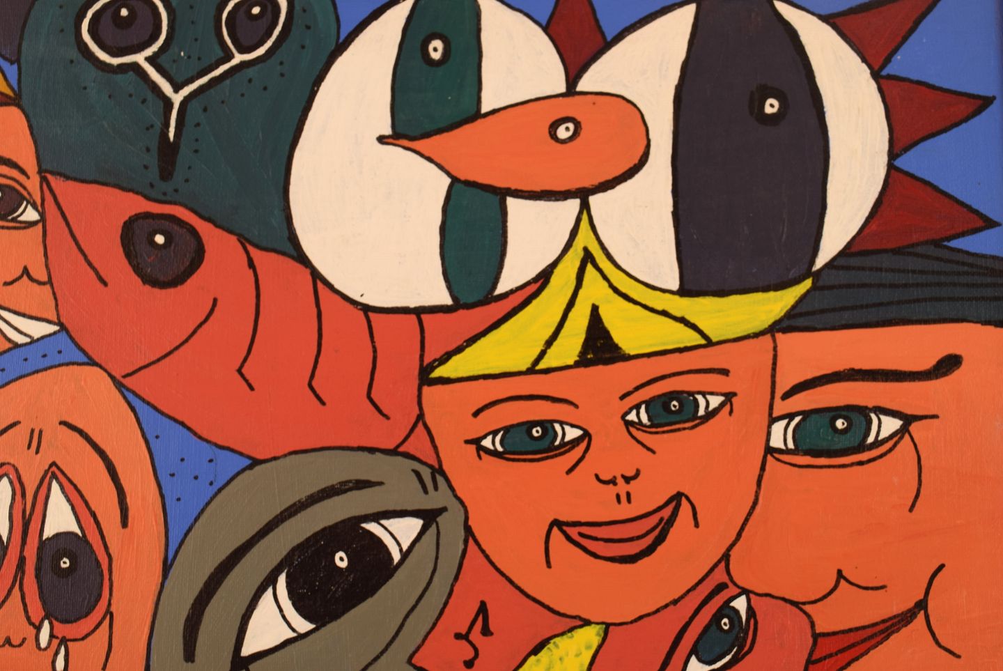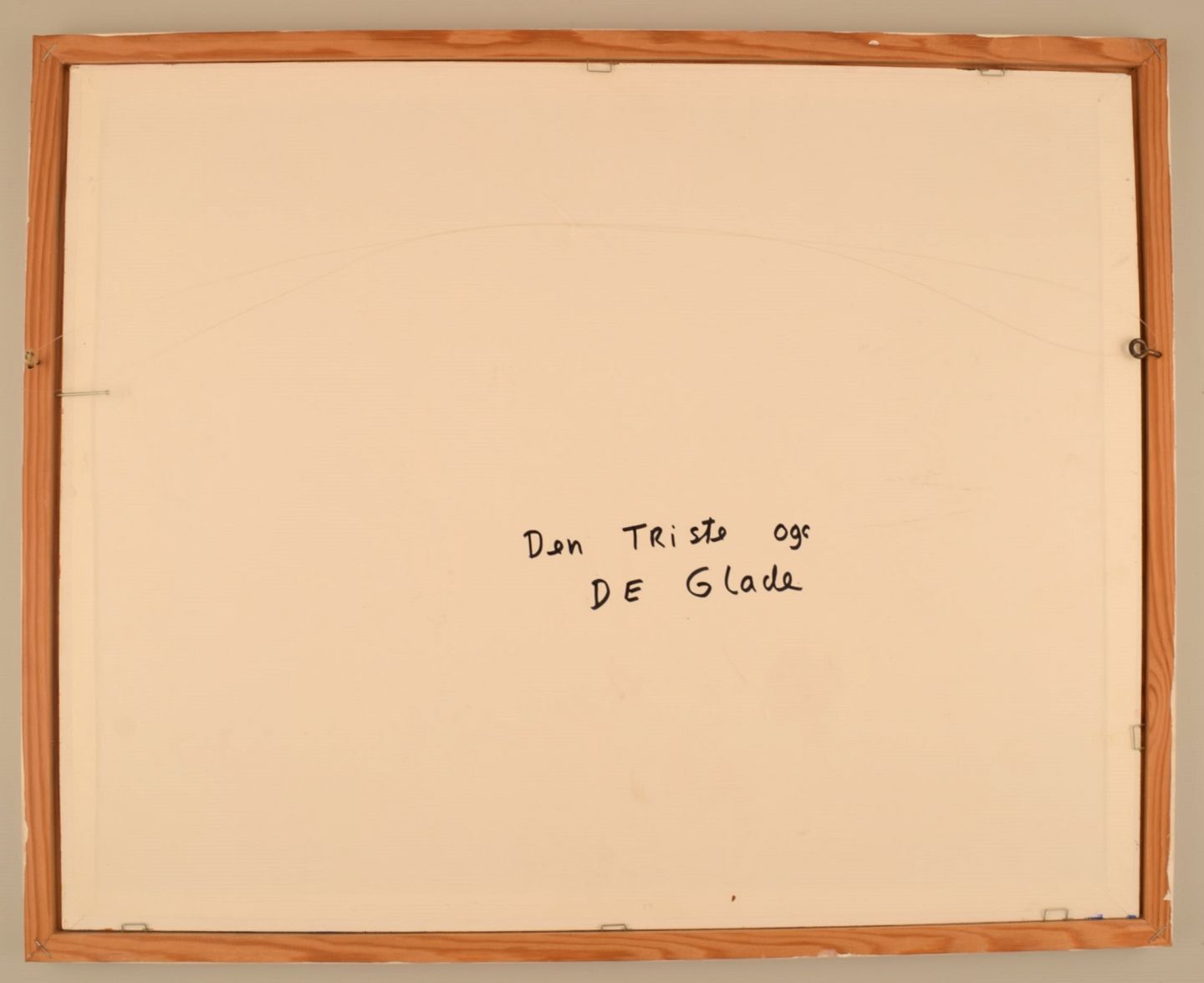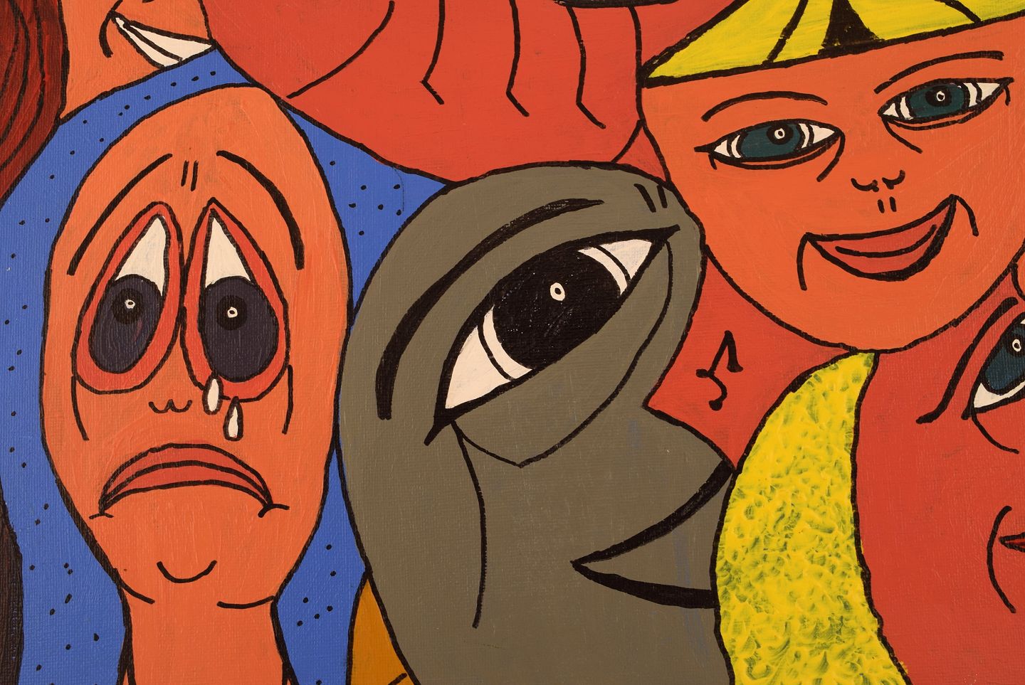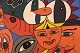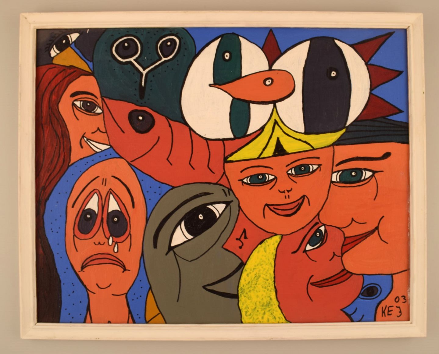 Elisabeth Jensen. Dansk kunstner. Akryl på lærred. "Den triste og de glade". Figurkomposition. Dateret 2003. Lærredet måler: 49 x 39 cm. Rammen måler: 2 cm. I flot stand. Signeret og dateret.