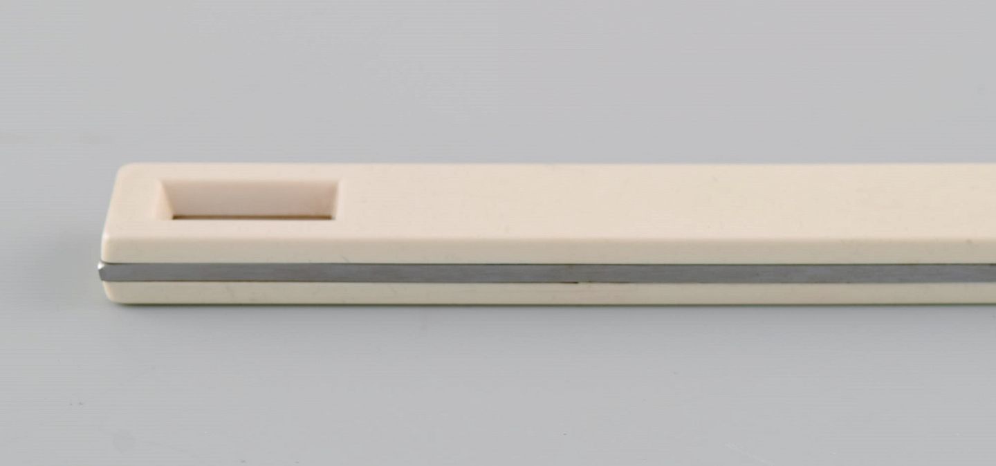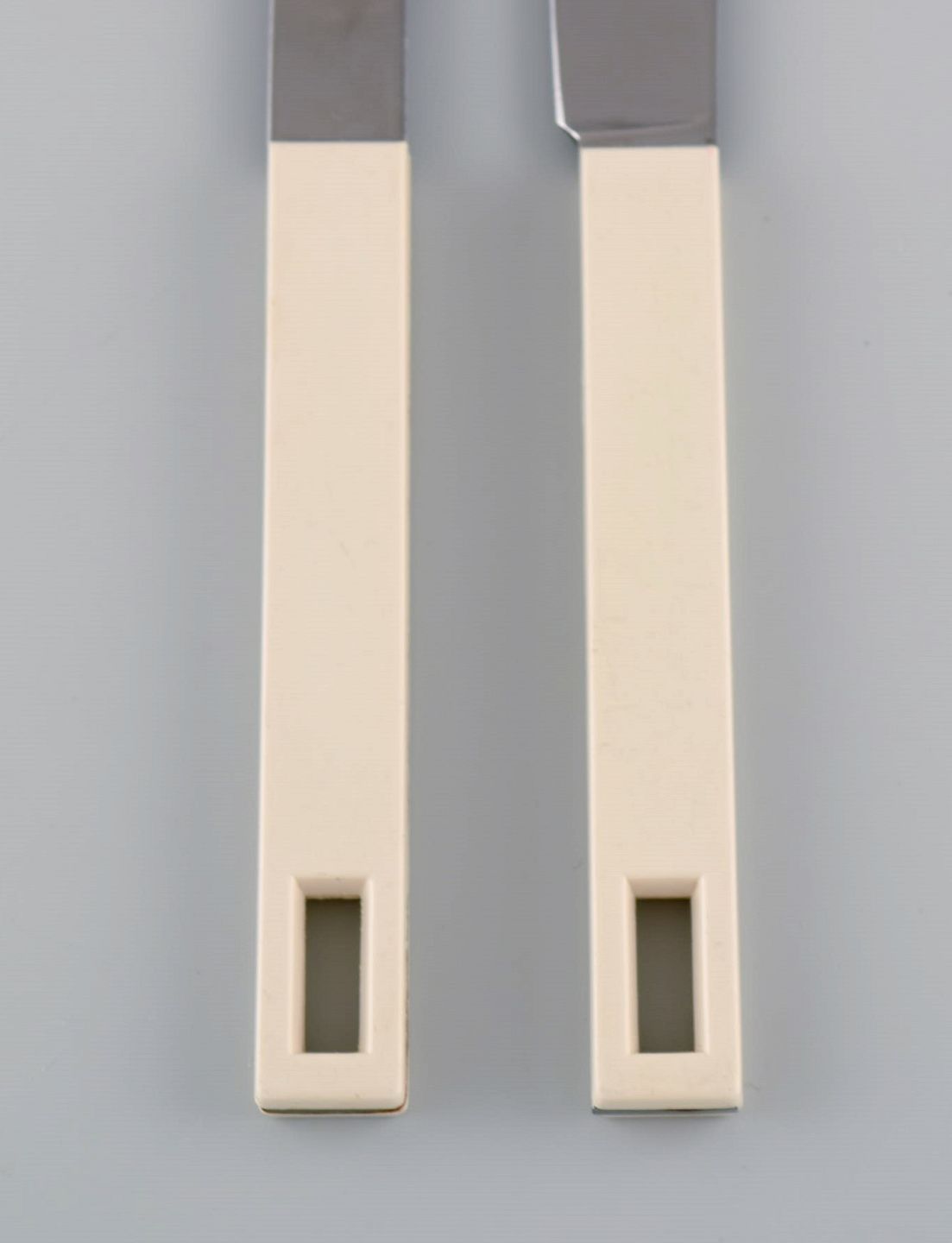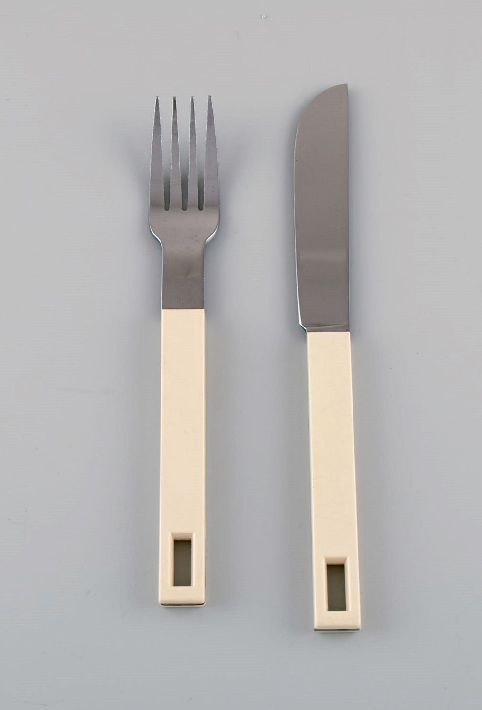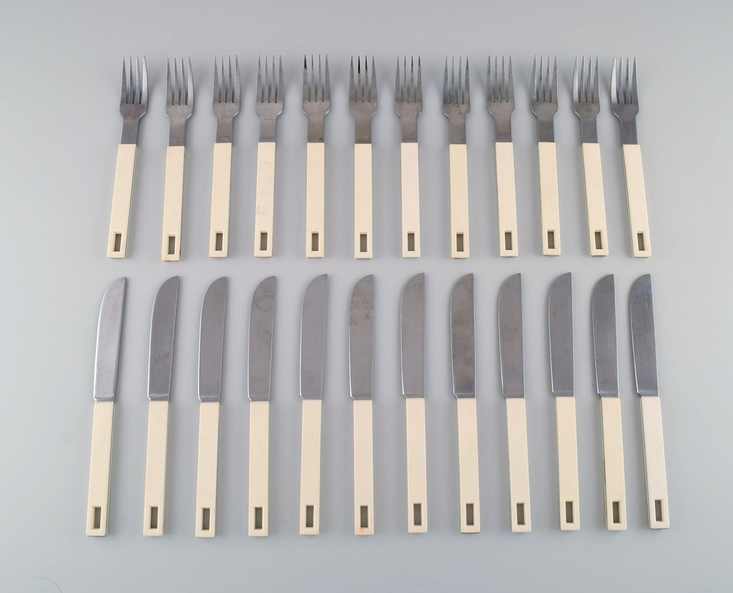 Signe Persson-Melin for Boda. Middagsbestik til 12 personer i cremefarvet plast og rustfrit stål. Boda Buffe. Sverige, 1960'erne.