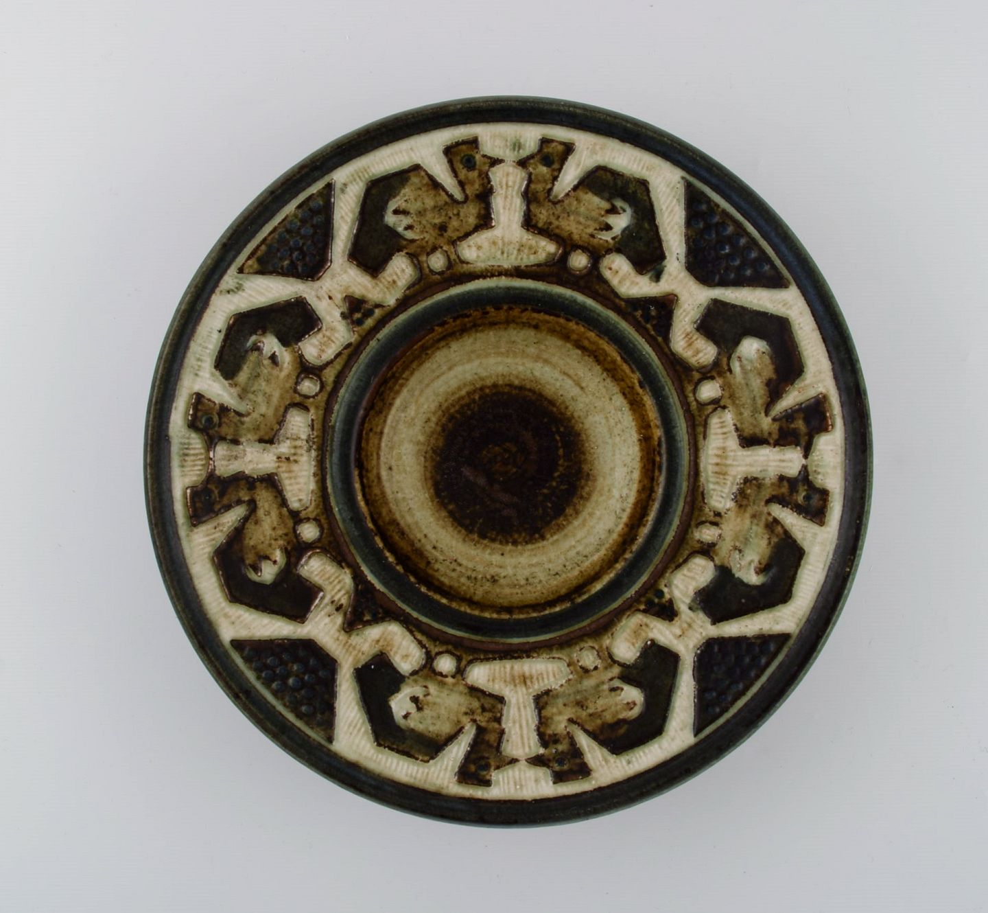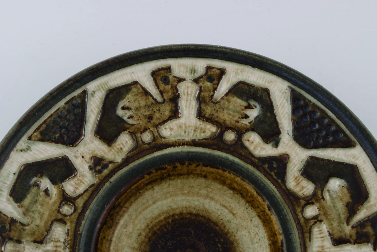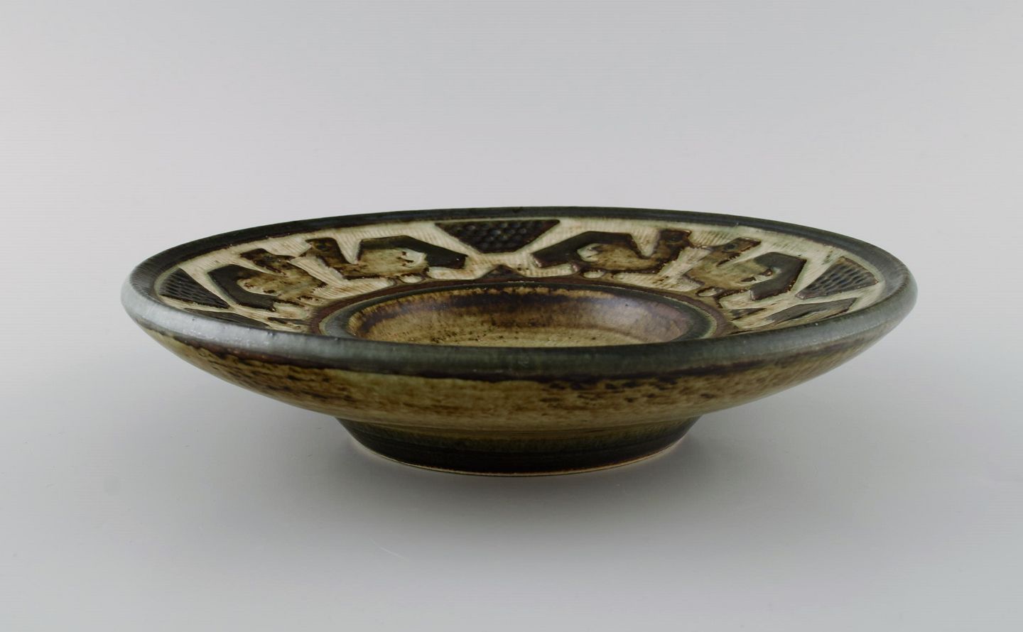 Jørgen Mogensen for Royal Copenhagen. Stor skål i glaseret stentøj dekoreret med fugle. Smuk sung glasur. 1970'erne.