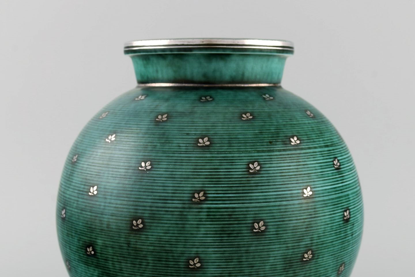 Wilhelm Kåge (1889-1960) for Gustavsberg. Rund Argenta art deco vase i glaseret keramik. Smuk glasur i grønne nuancer med sølvindlæg i form af blade. Midt 1900-tallet.