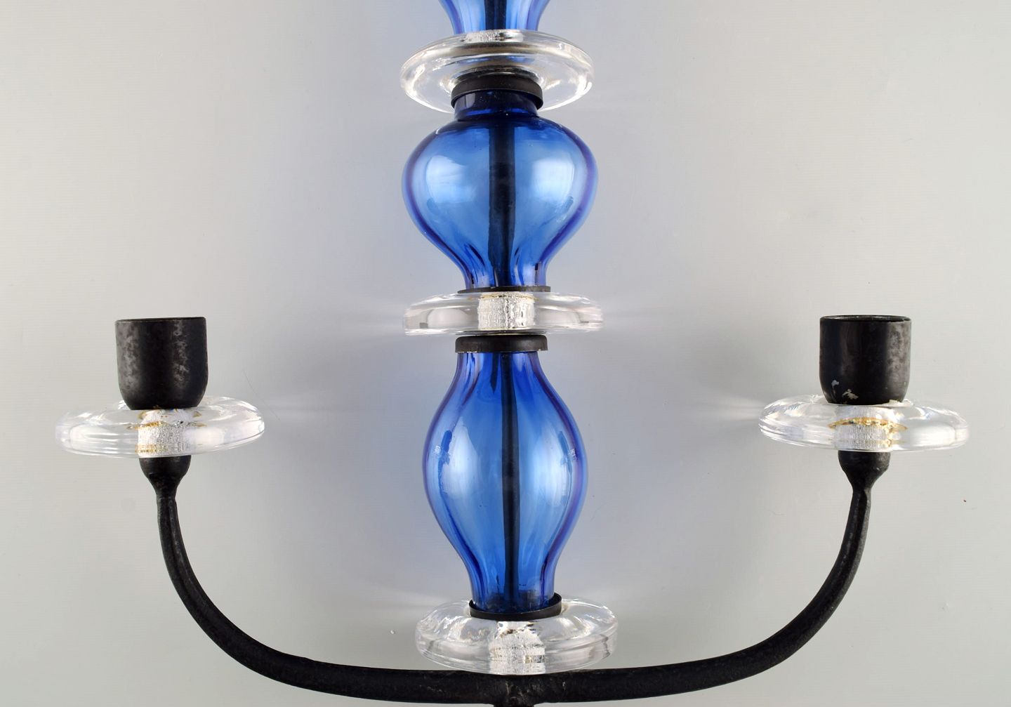 Erik Höglund (1932-1998) for Kosta Boda. Sjælden to-armet lysestage til ophæng i støbejern og mundblæst kunstglas. Midt 1900-tallet.