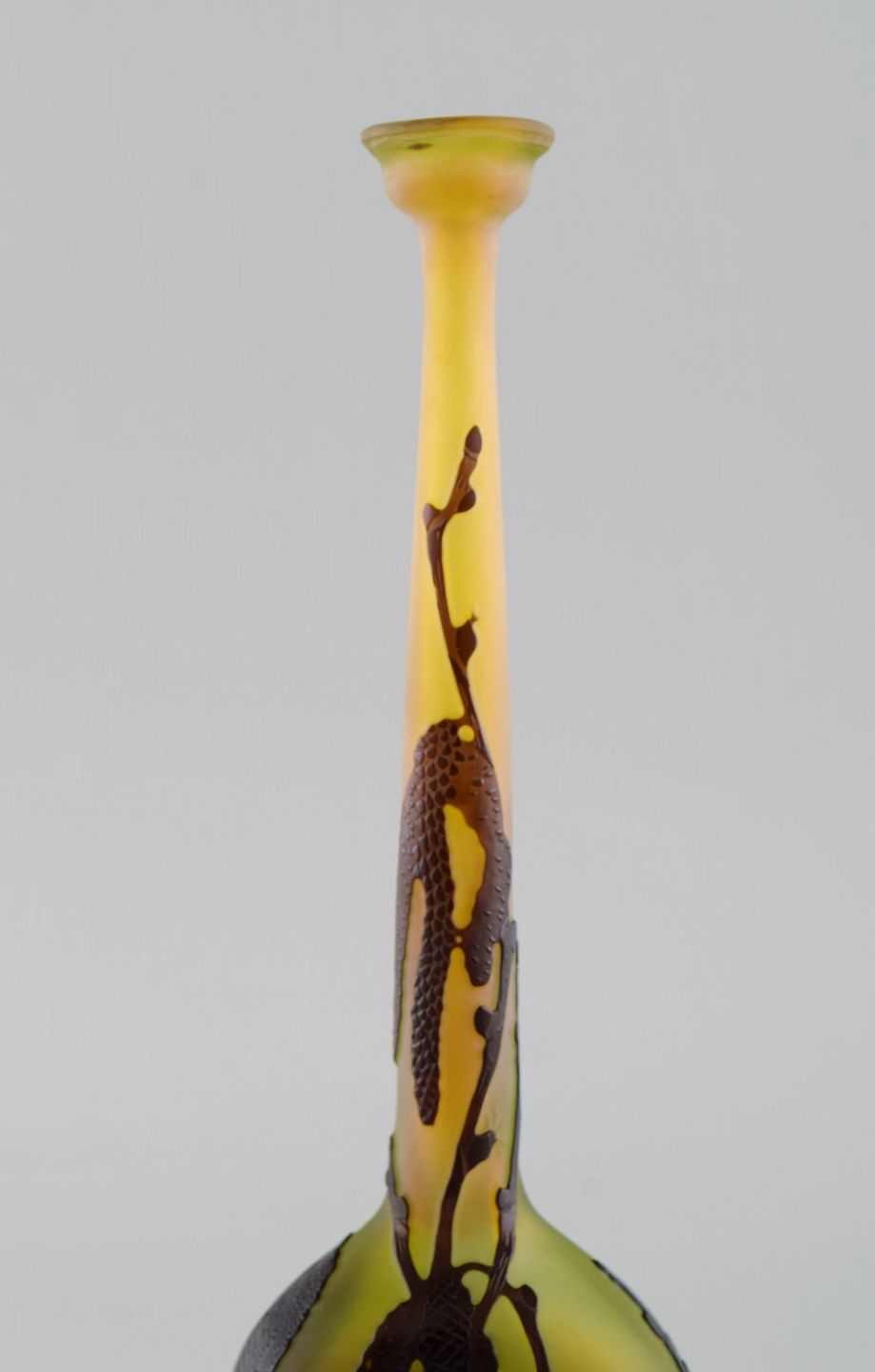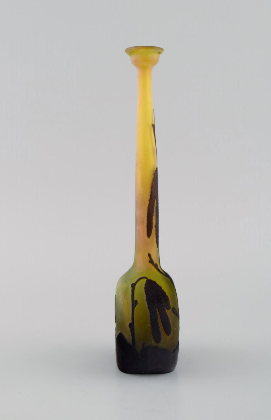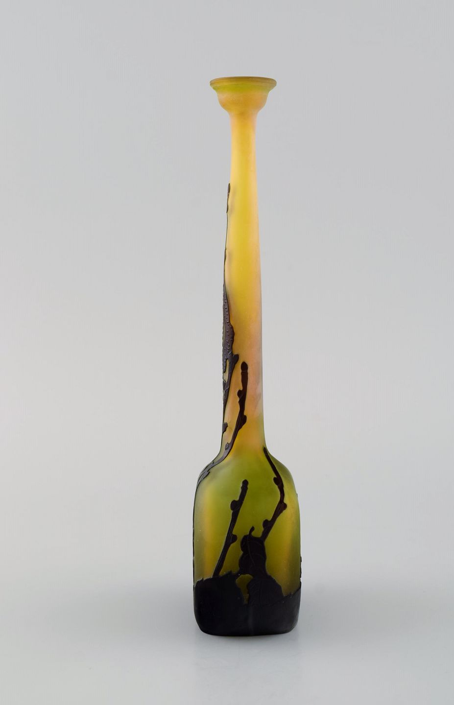 Sjælden Emile Gallé vase i gult kunstglas med mørkt overfang udskåret i form af grene med bladværk. Tidligt 1900-tallet. Måler: 22 x 7 cm. I flot stand. Signeret og mærkat.
