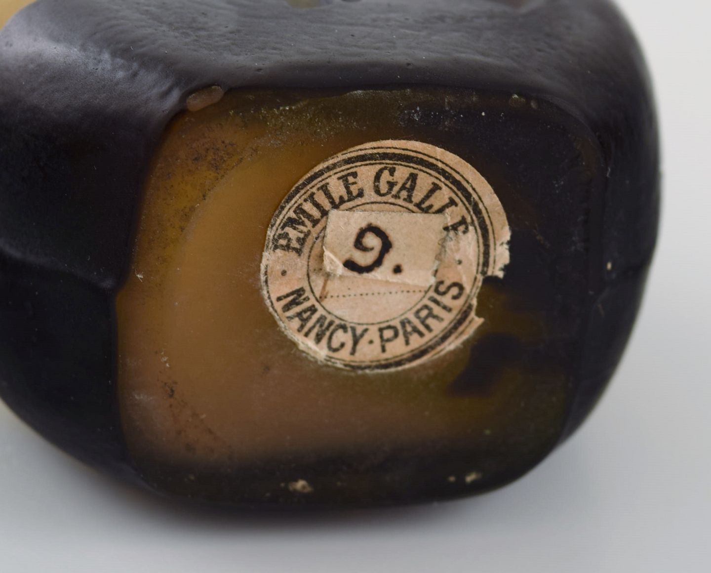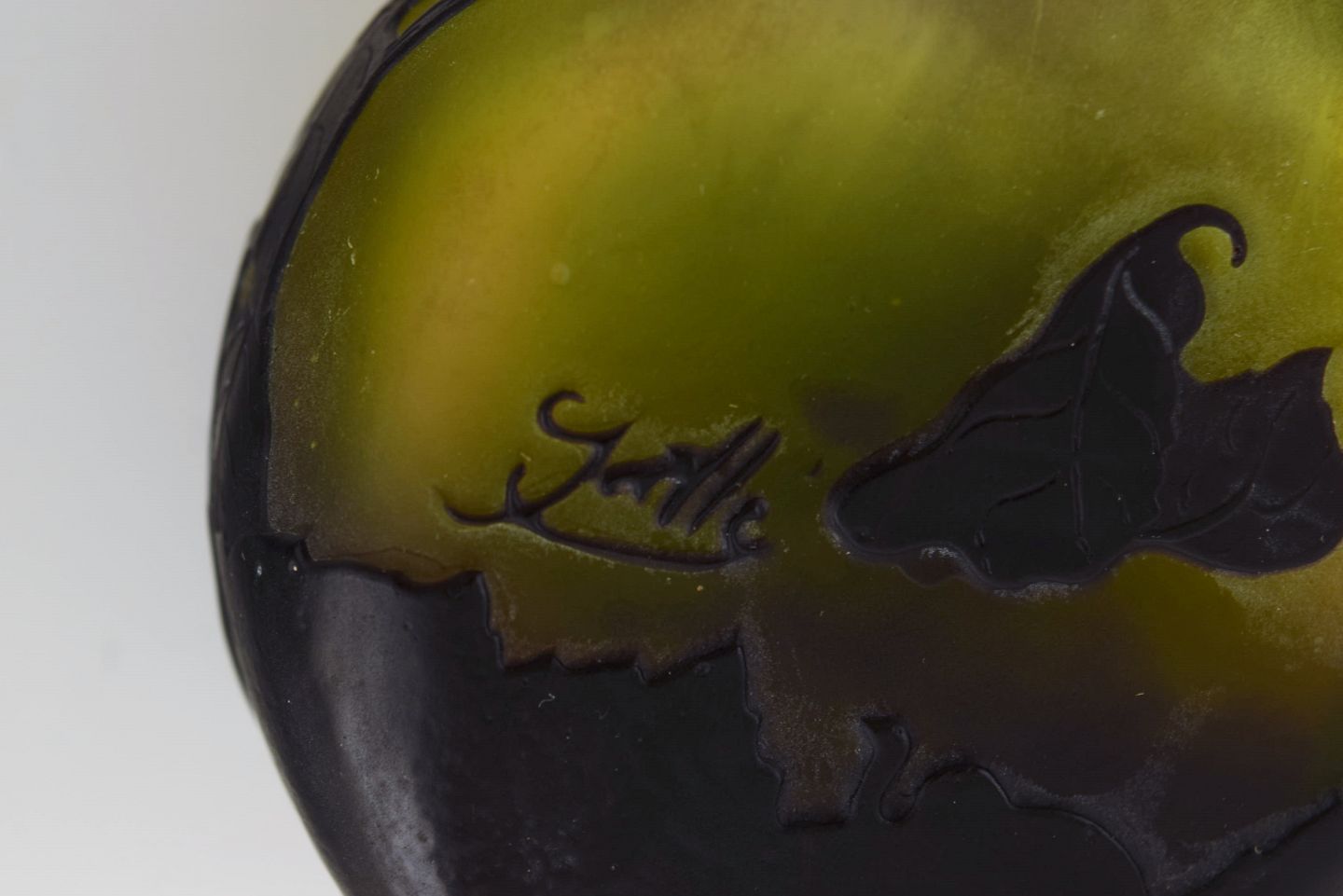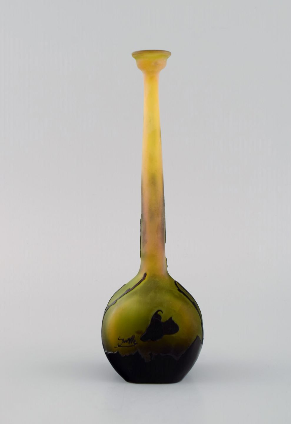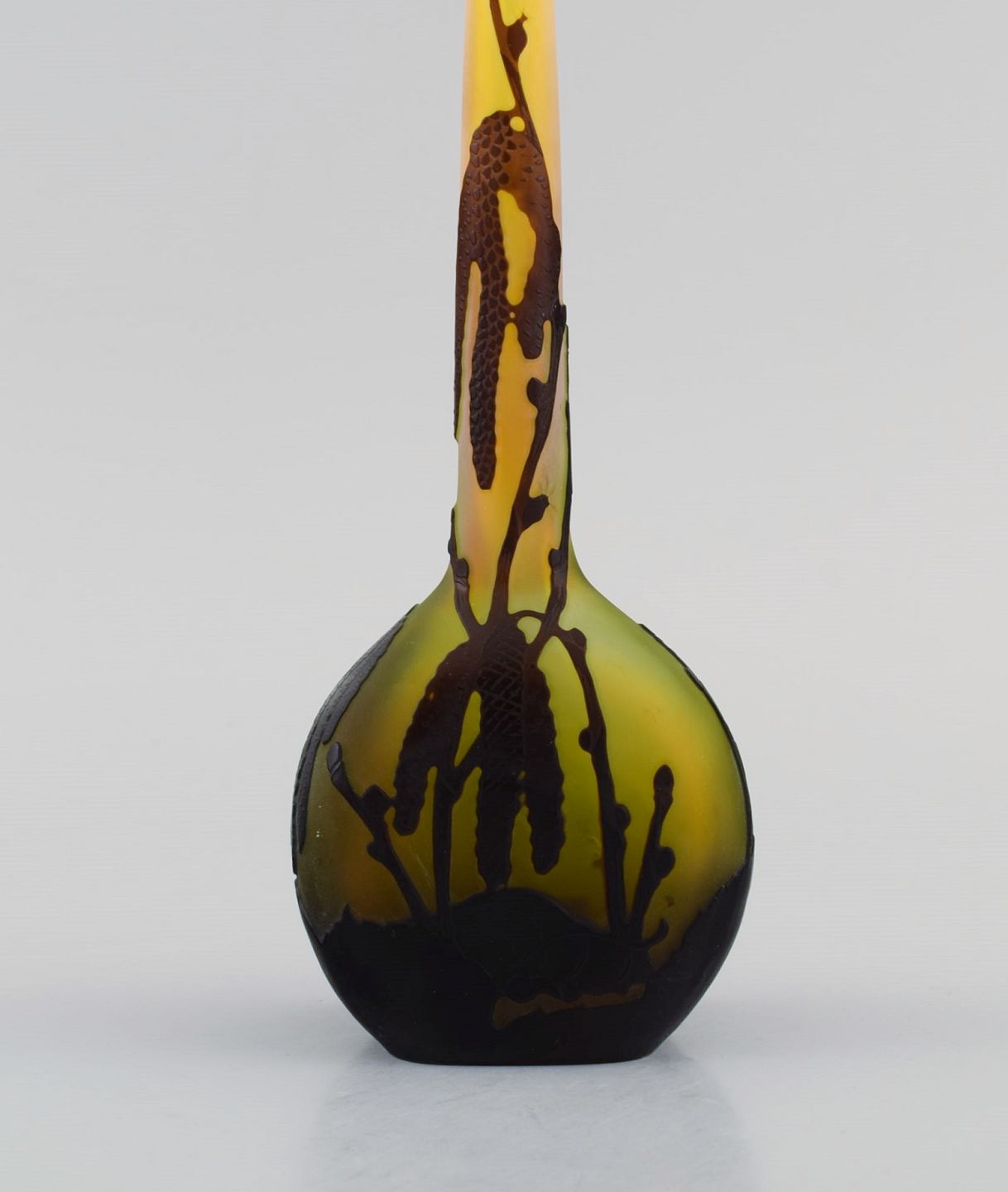 Sjælden Emile Gallé vase i gult kunstglas med mørkt overfang udskåret i form af grene med bladværk. Tidligt 1900-tallet. Måler: 22 x 7 cm. I flot stand. Signeret og mærkat.